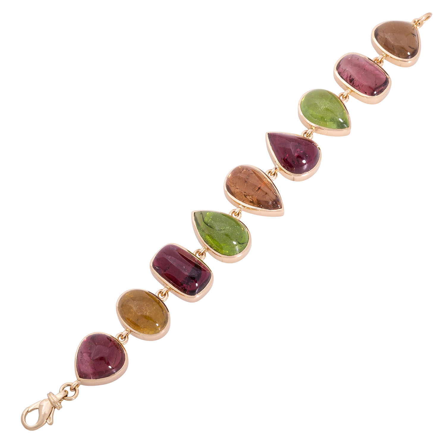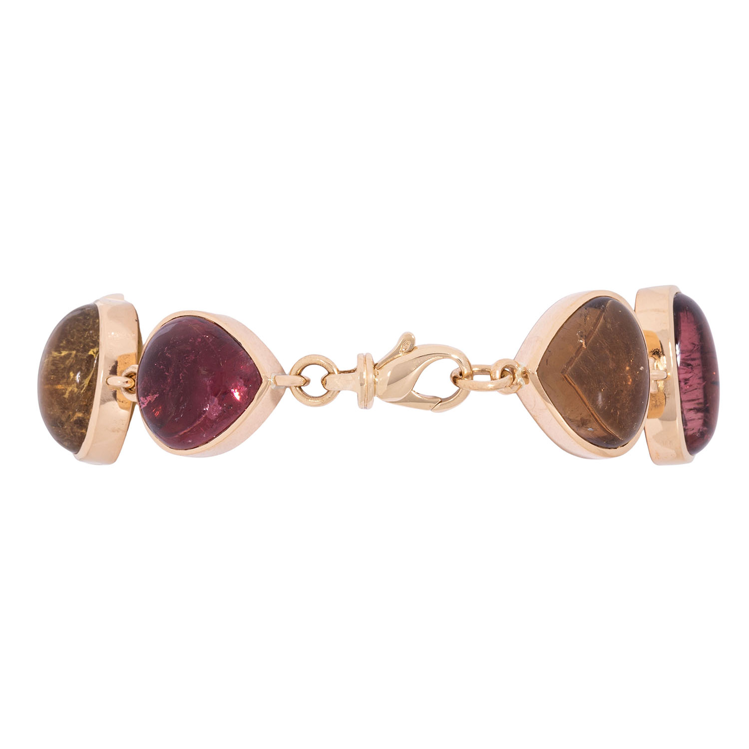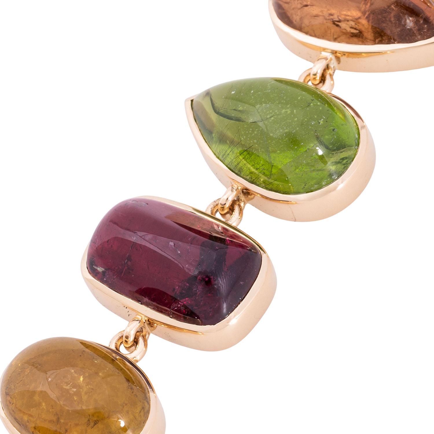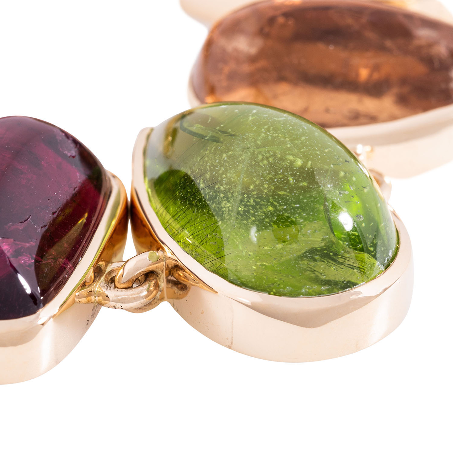 im Cabochon-Fantasy-Schliff: 7 Turmaline von zus. 48,75 ct und Peridot von zus. 8,15 ct, GG 18K, 70,5 g, L: 20,5 cm, 21. Jh., neuwertig.