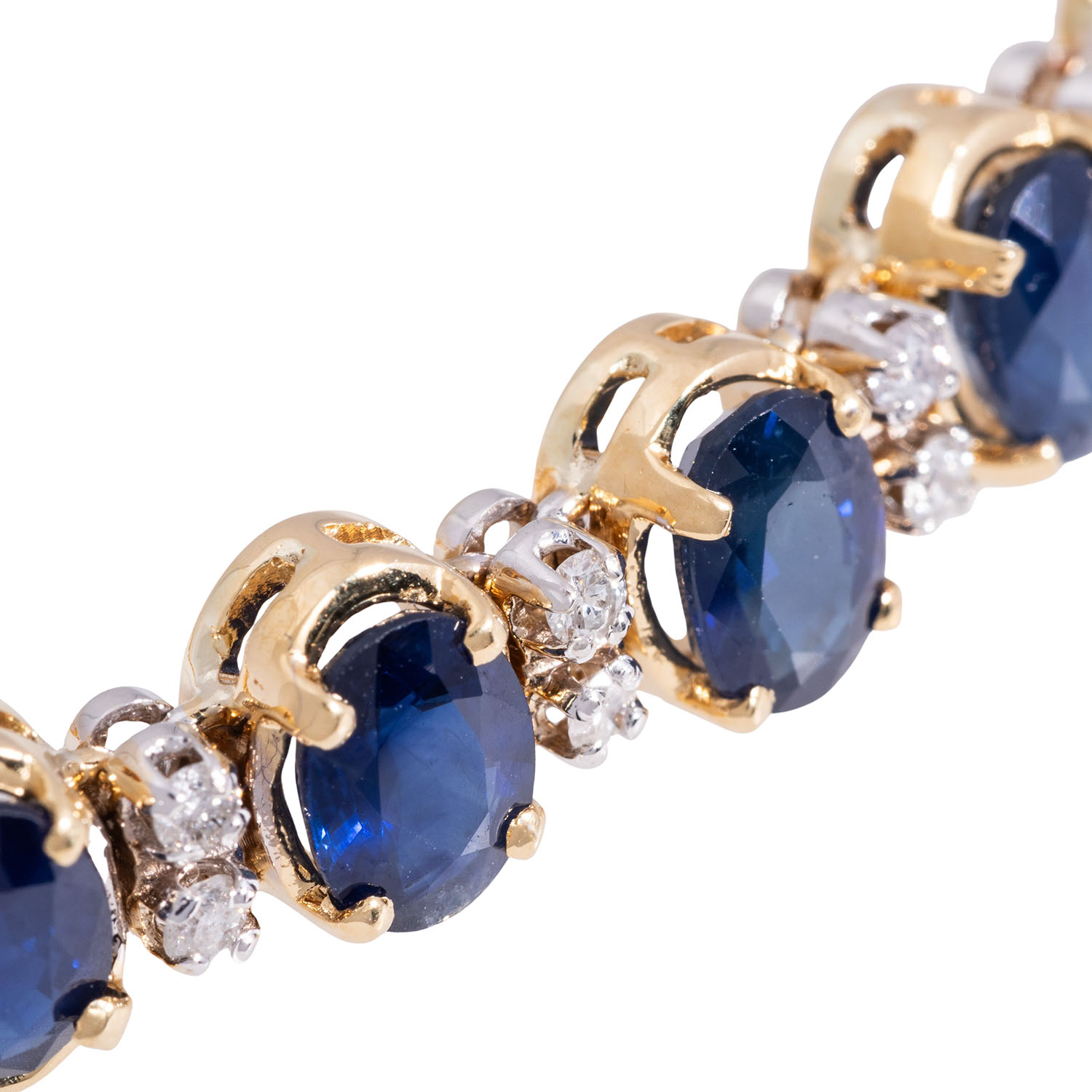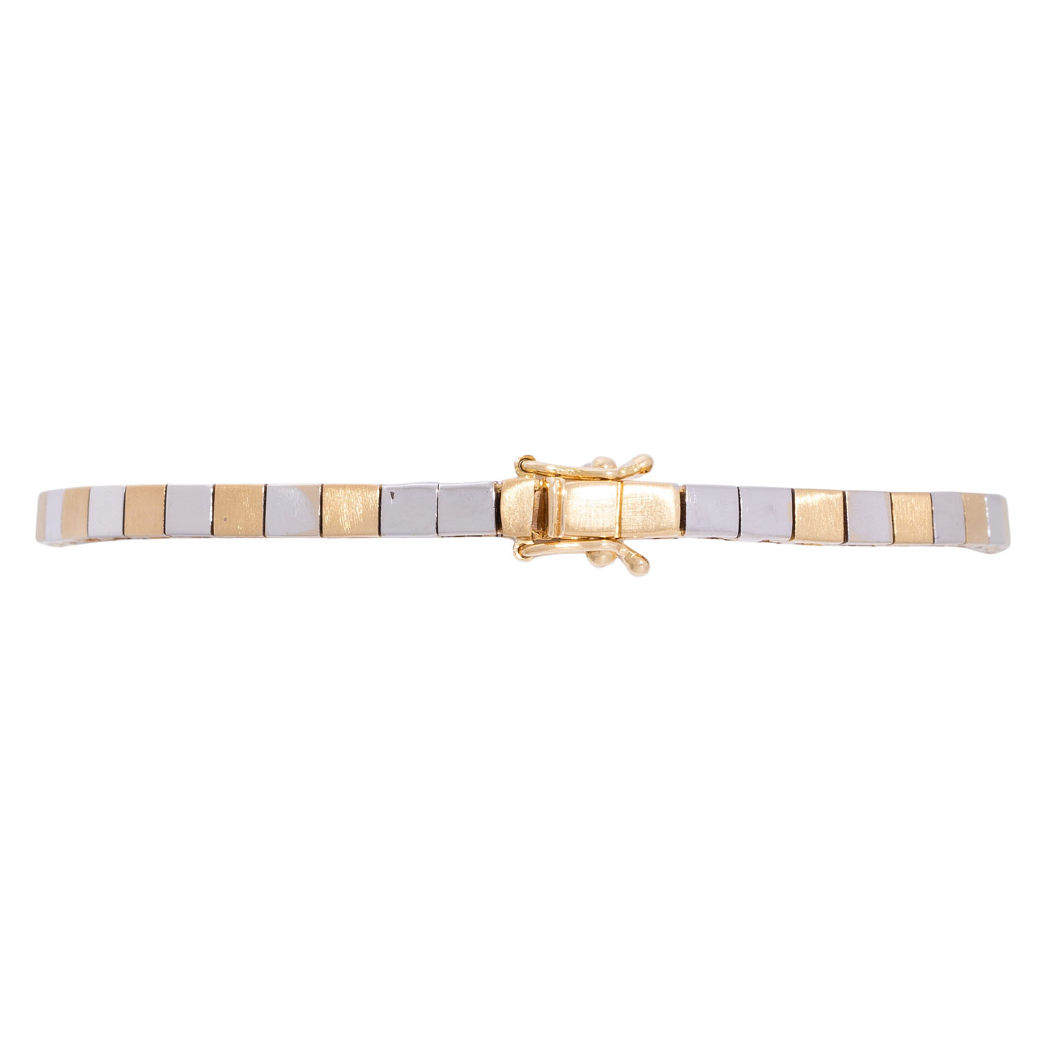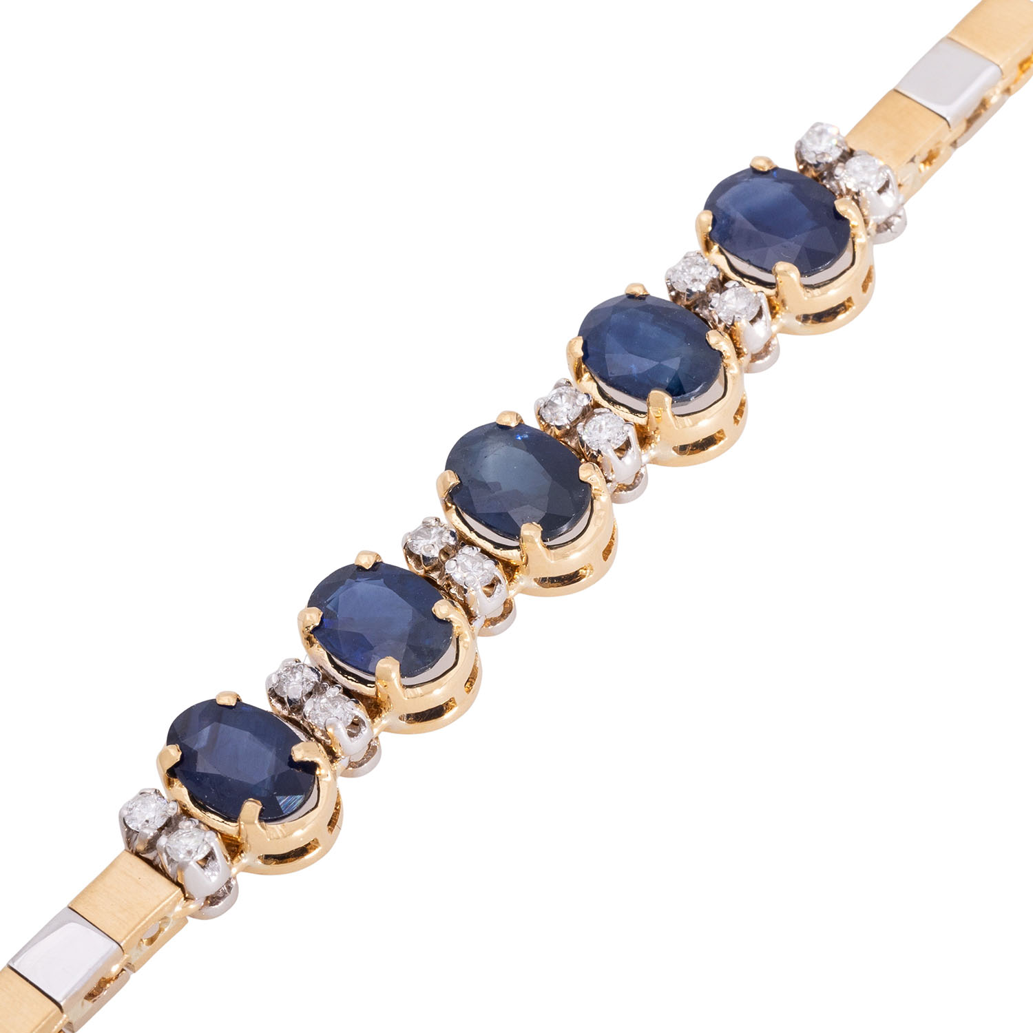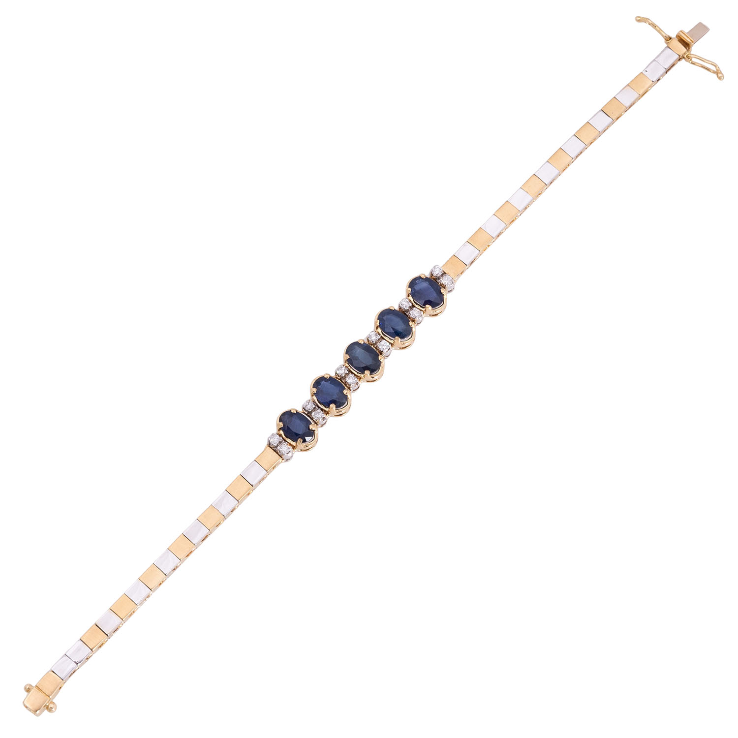zus. ca. 0,12 ct, gute Farbe und gute bis mittlere Reinheit, 5 Saphire ca.7 x 5 mm, GG/WG 18K, 18,5 g, L: ca. 17,5 cm, 1970er Jahre, leichteTragespuren, Kastenschloß mit 2 Sicherheitsachten.