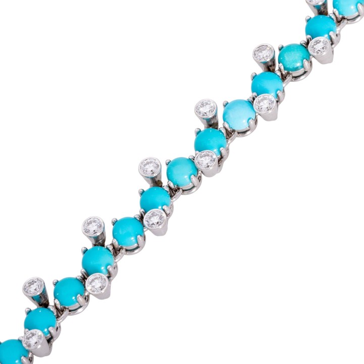 zus. ca. 1,6 ct, gute Farbe und Reinheit, 32 runde Türkiscabochons ca. 4 mm, WG 18K, 14,8 g, L: ca. 17 cm, 1970er Jahre, leichteTragespuren, Kastenschloß mit Sicherheitsacht.