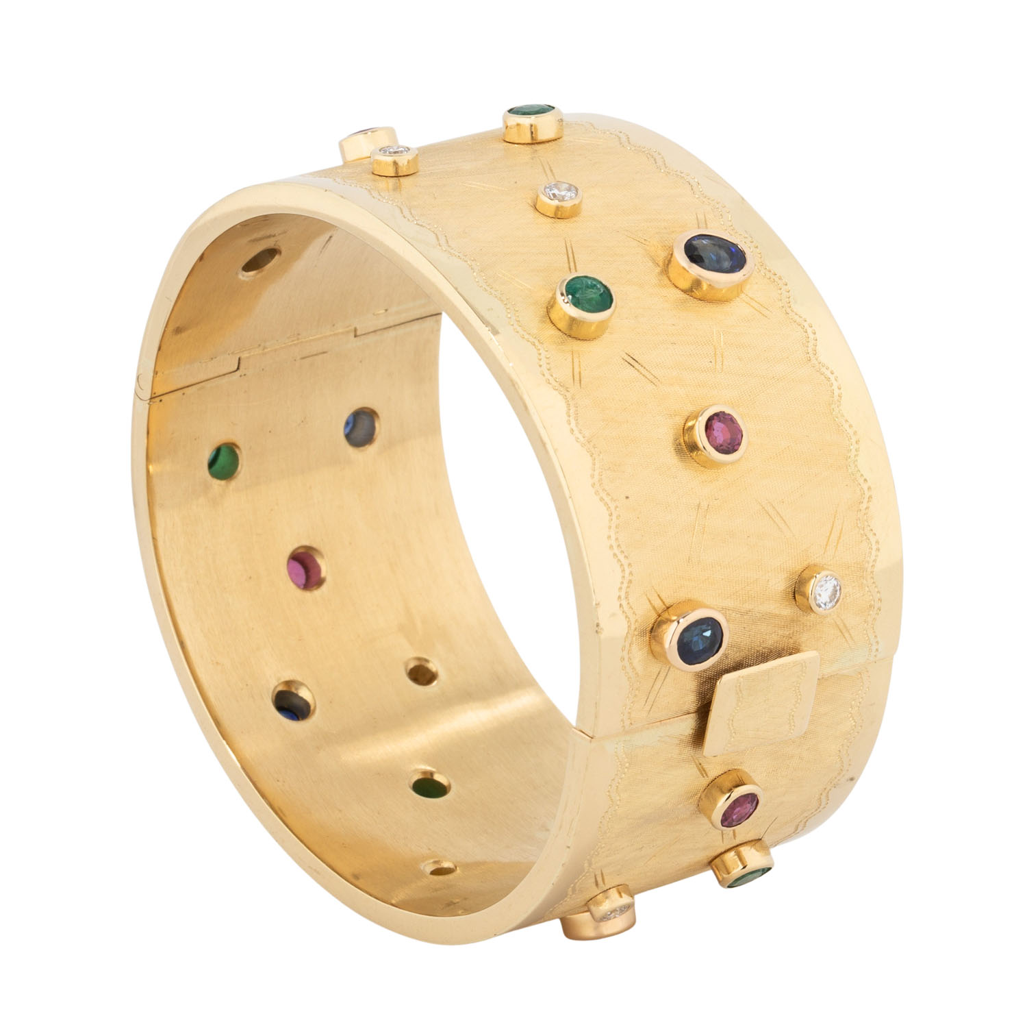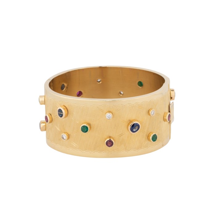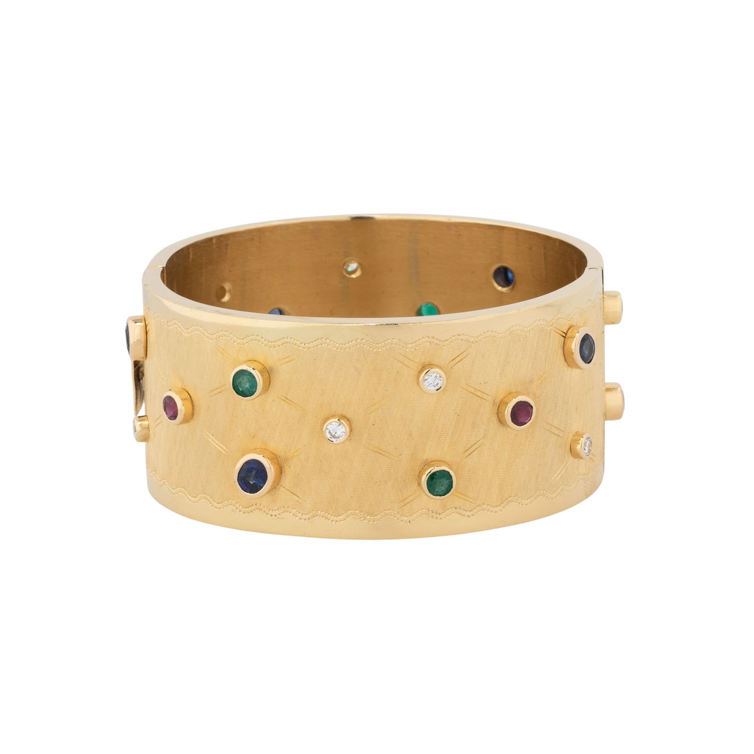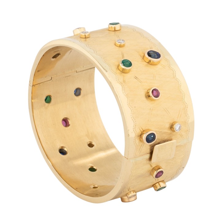 zus. ca. 0,56 ct, WEISS (H)/VS, Rubine, zus. ca. 0,91 ct, Saphire, zus. ca. 1,90 ct, Smaragde, zus. ca. 0,99 ct, 3 best., GG 18K, 77 g, Oberfläche mit feiner Gravurarbeit, Innenumfang: ca. 17,5 cm, B: ca. 3 cm, Ende 20. Jh., leichte Tragespuren, mit Herstellerpunze. Handarbeit.