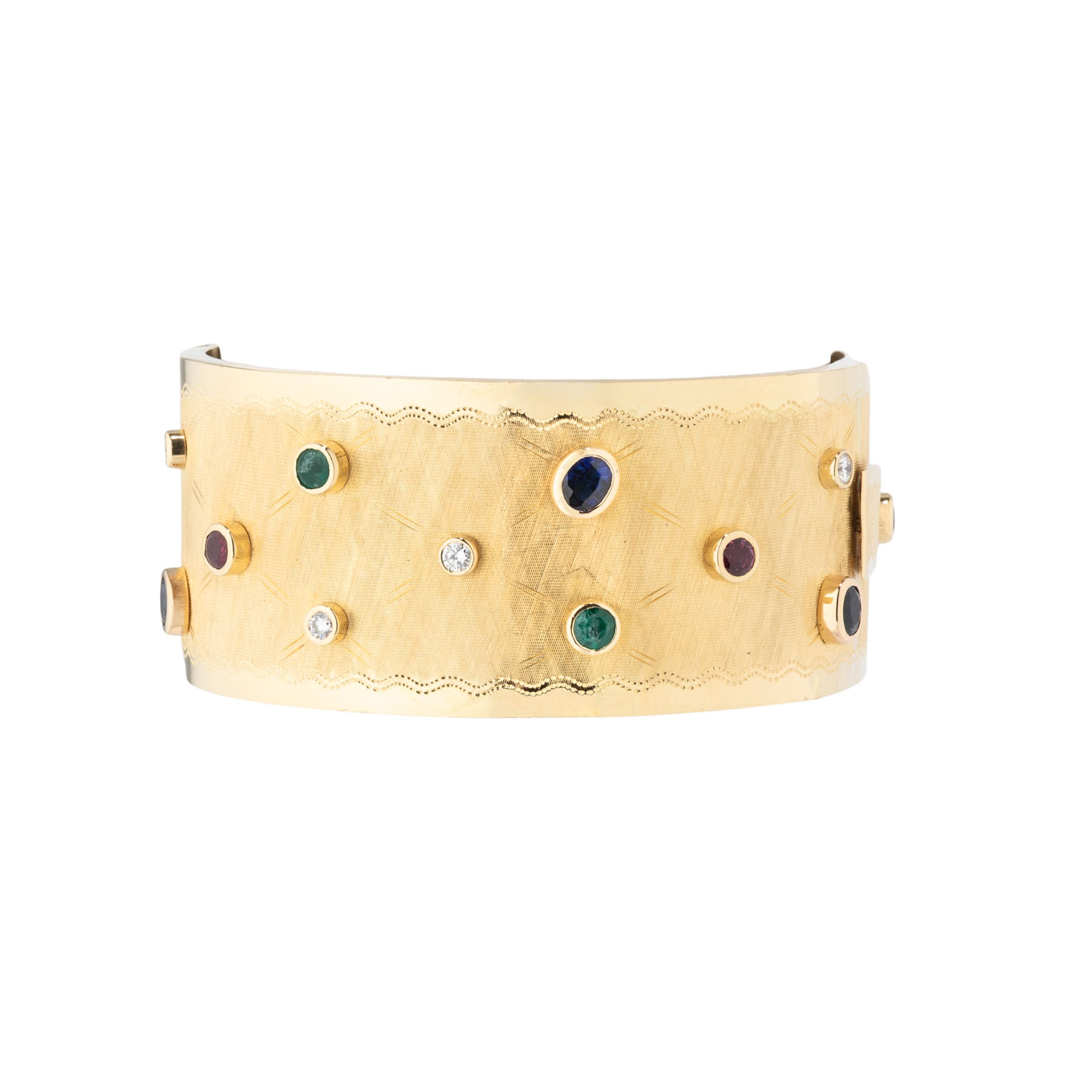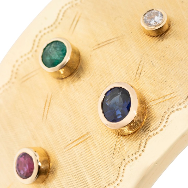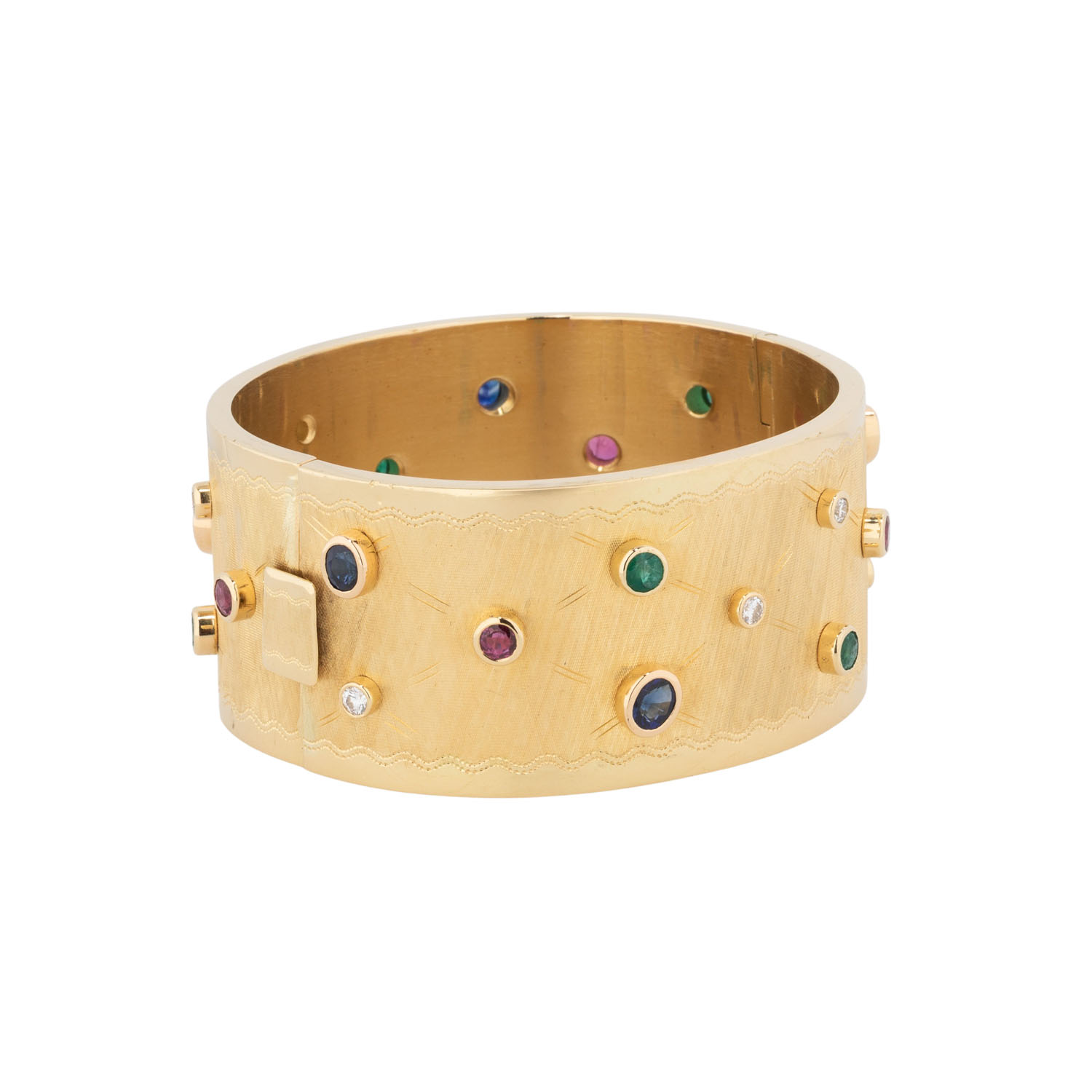 zus. ca. 0,56 ct, WEISS (H)/VS, Rubine, zus. ca. 0,91 ct, Saphire, zus. ca. 1,90 ct, Smaragde, zus. ca. 0,99 ct, 3 best., GG 18K, 77 g, Oberfläche mit feiner Gravurarbeit, Innenumfang: ca. 17,5 cm, B: ca. 3 cm, Ende 20. Jh., leichte Tragespuren, mit Herstellerpunze. Handarbeit.