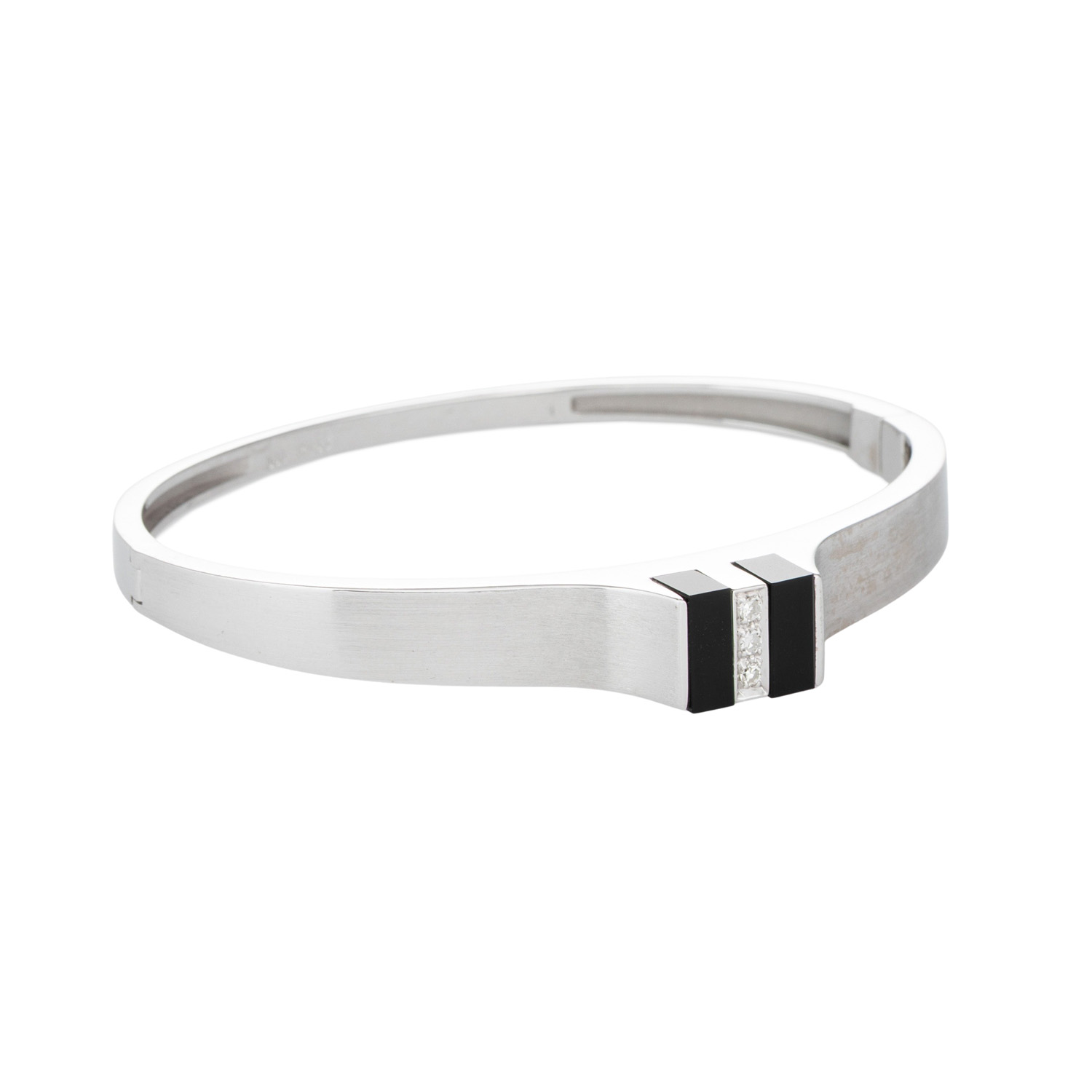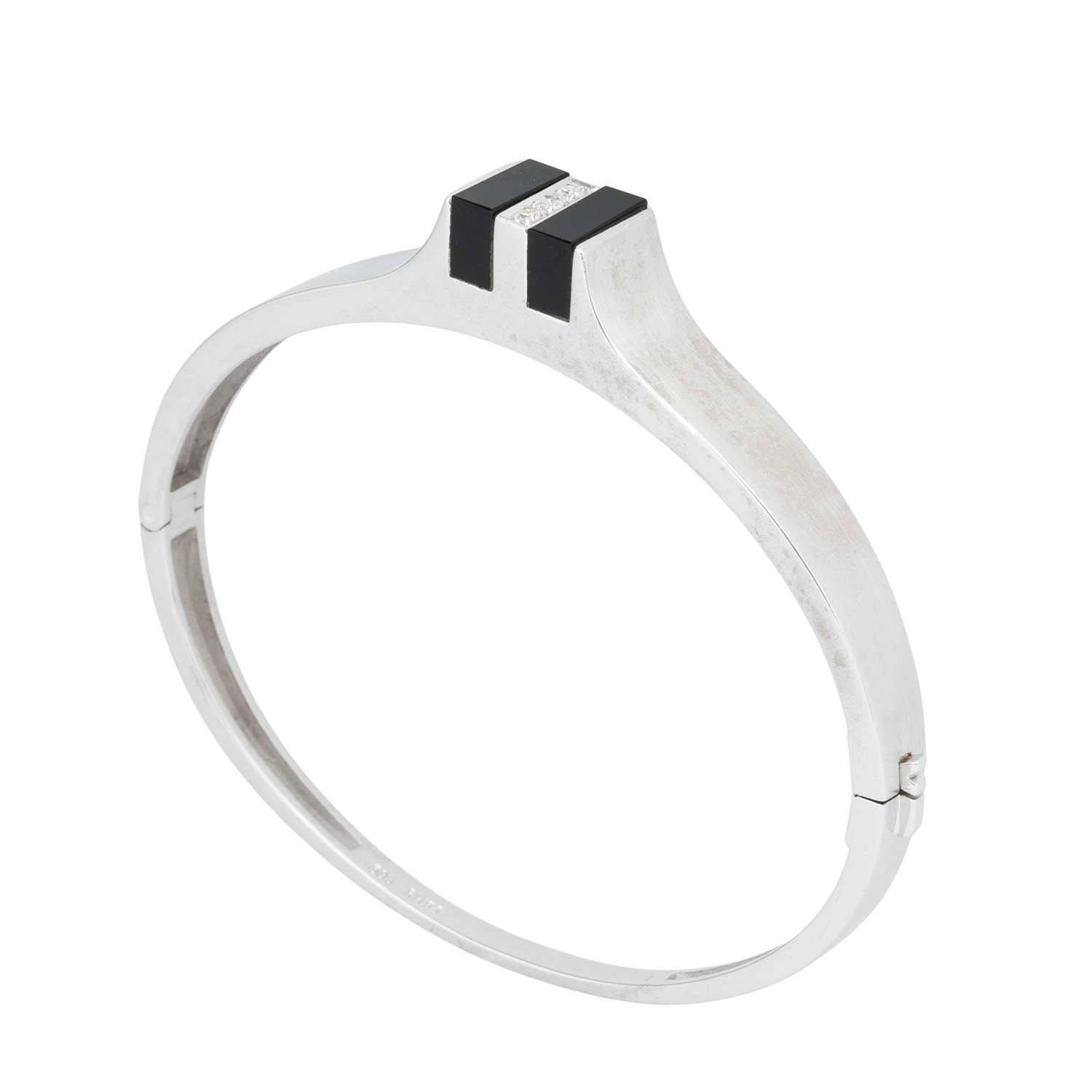 ges. ca. 0,1 ct, WG 14K. 19,4 g, IU: 16 cm. B: 8,5 mm, 2 Onyx quaderförmig eingeschliffen, Kastenschloß, Ende 20. Jh., minimale Tragespuren.
