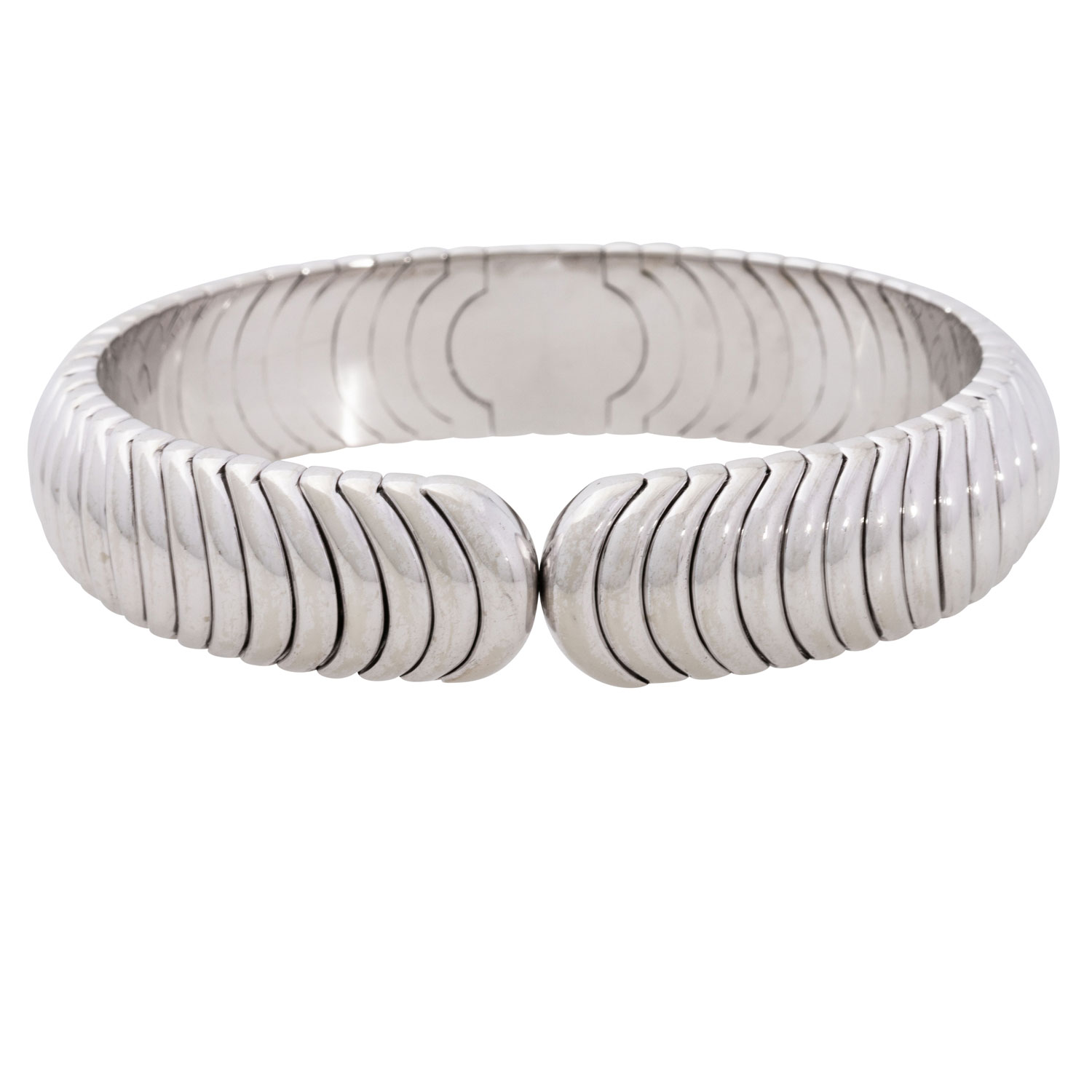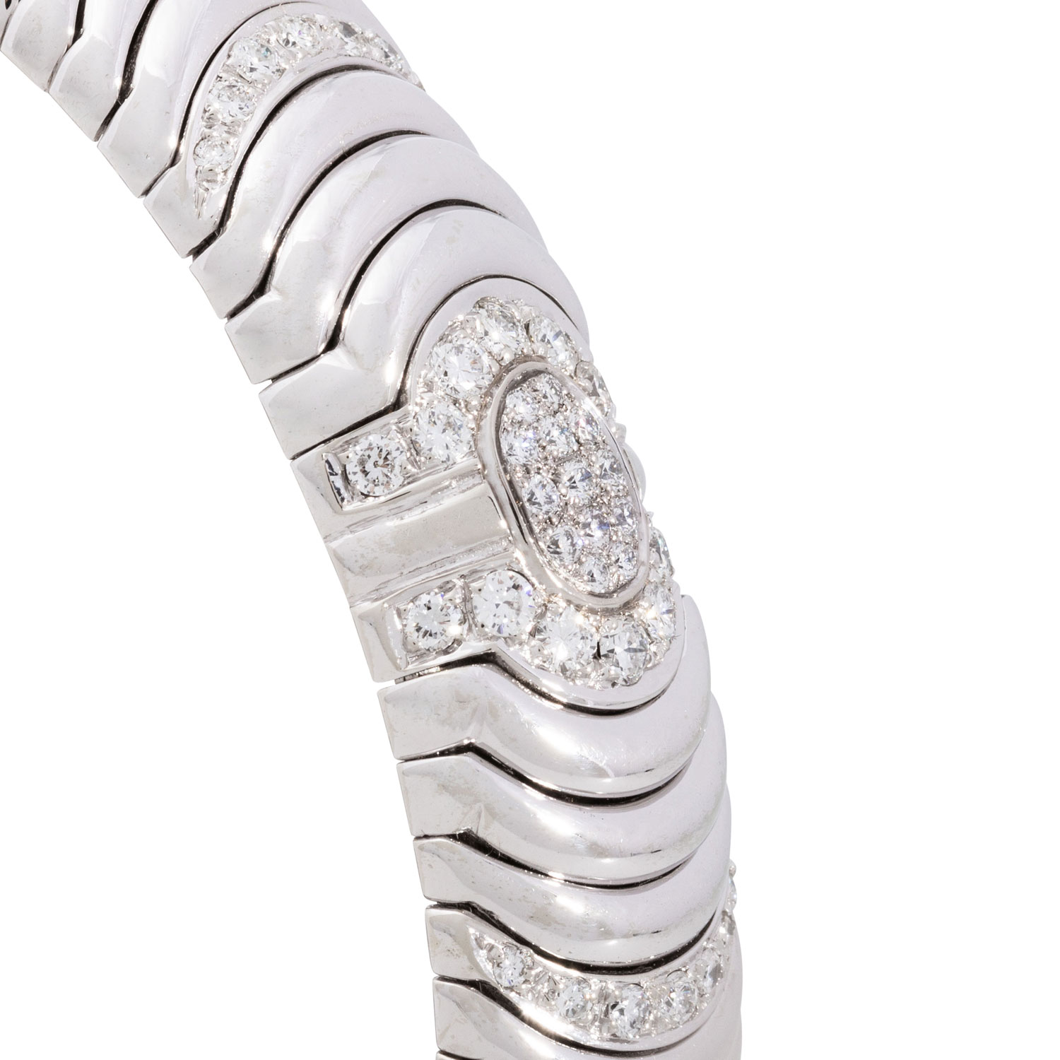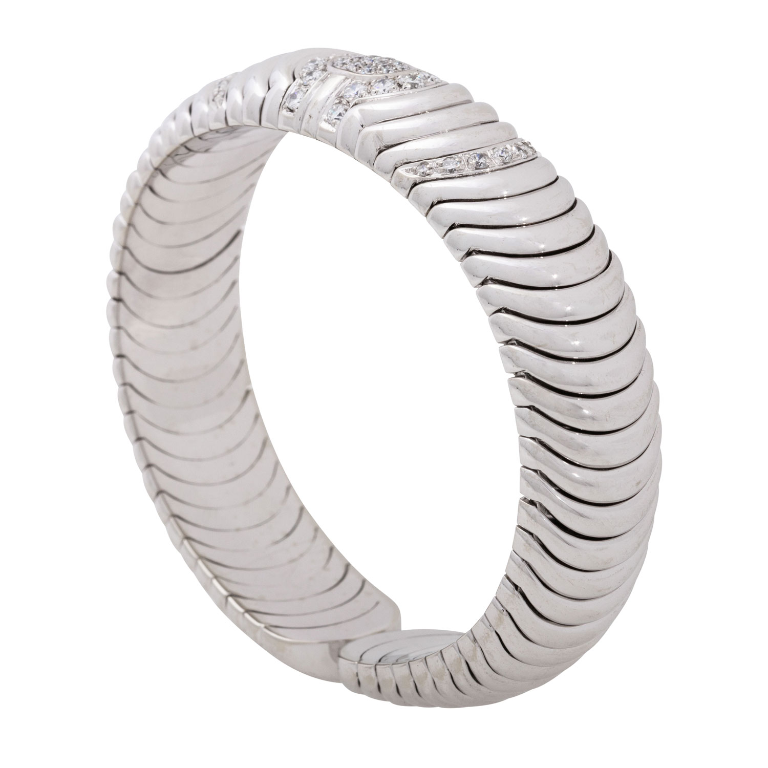 ges. ca. 1,1 ct, WEISSS H/VSI-SI, WG 18K, 74,9 g, IU: 15,5 cm, B; 13,8 mm, federnde Konstruktion, Ende 20. Jh., minimale Tragespuren.