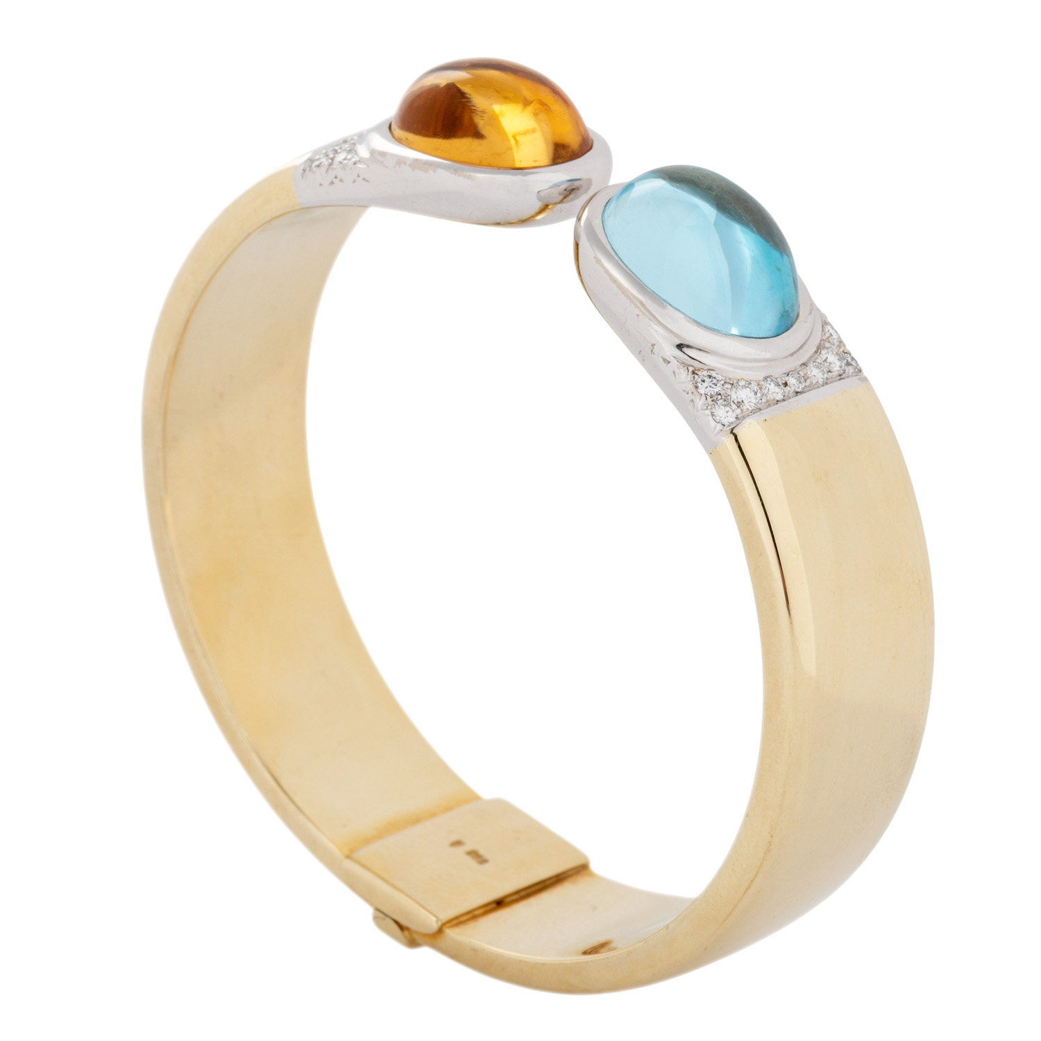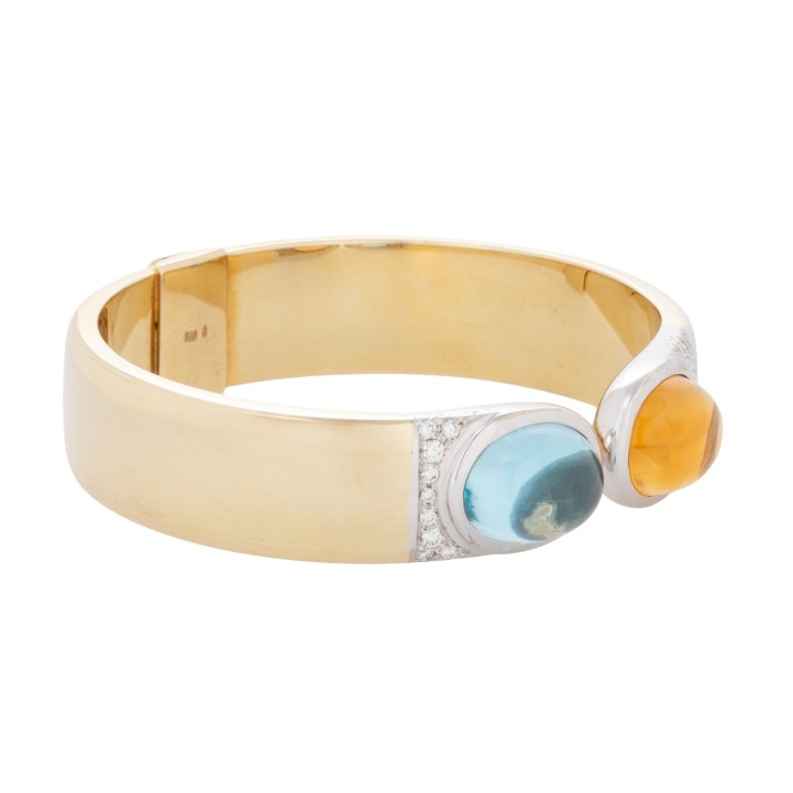 ovale Cabochons, ca. 16 x 12 mm, 18 Brillanten, ges. ca. 0,5 ct, gute Farbe und Reinheit, GG/WG 14K, 44,3 g, IU: 17 cm, B: 15 mm, Scharnier mit Feder, 20./21. Jh., Topas beh., minimale Tragespuren.