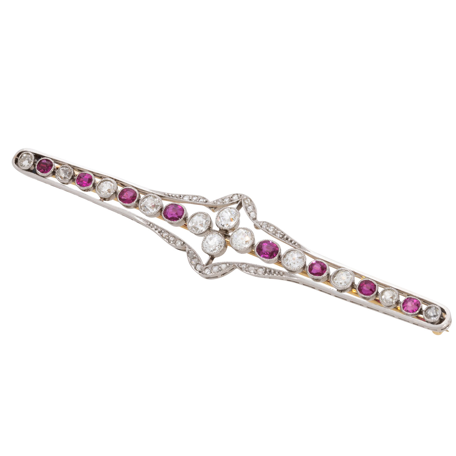 Altschliffdiamanten und Diamantrosen von zus. ca. 1,1 ct, gute Farbe, gute bis mittlere Reinheit, Platin und GG 18K, 8,8 g, L.: 8 cm, schöne, sehr gute erhaltenene Handarbeit aus der Zeit, feine Millegriffe-Verzierung, unleserleserliche Meistermarke. (6e)