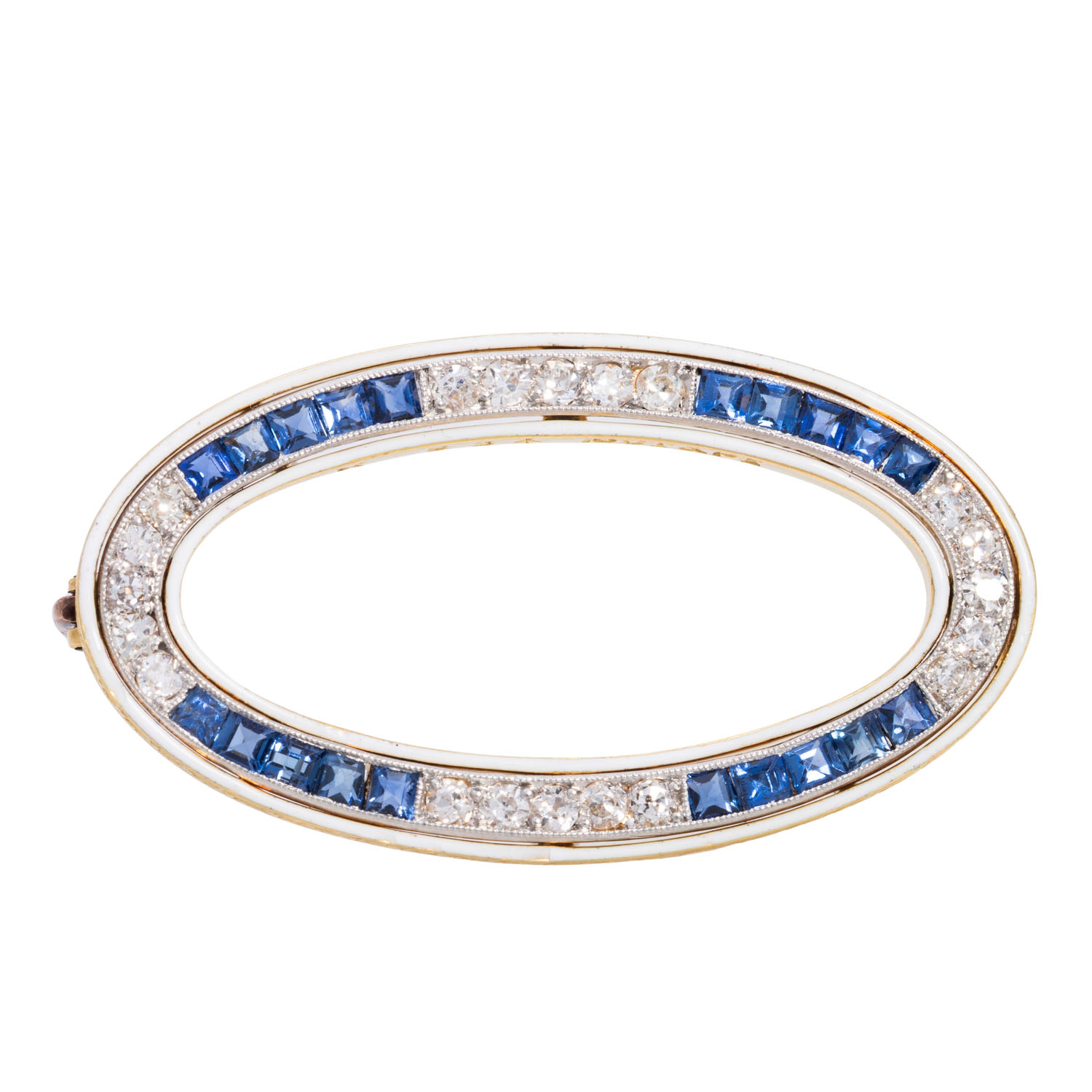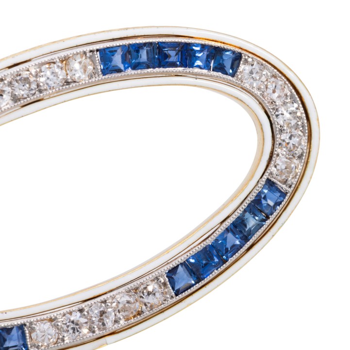 zus. ca. 0,5 ct in alterstypischen Qualitäten und weißes Email, GG 18K, Schauseite Platin, 6,1 g, 3,8x2 cm, 1. H. 20. Jh., Email min. bestoßen, ansonsten guter Erhalt, punzierte Nr. 'K 834'.