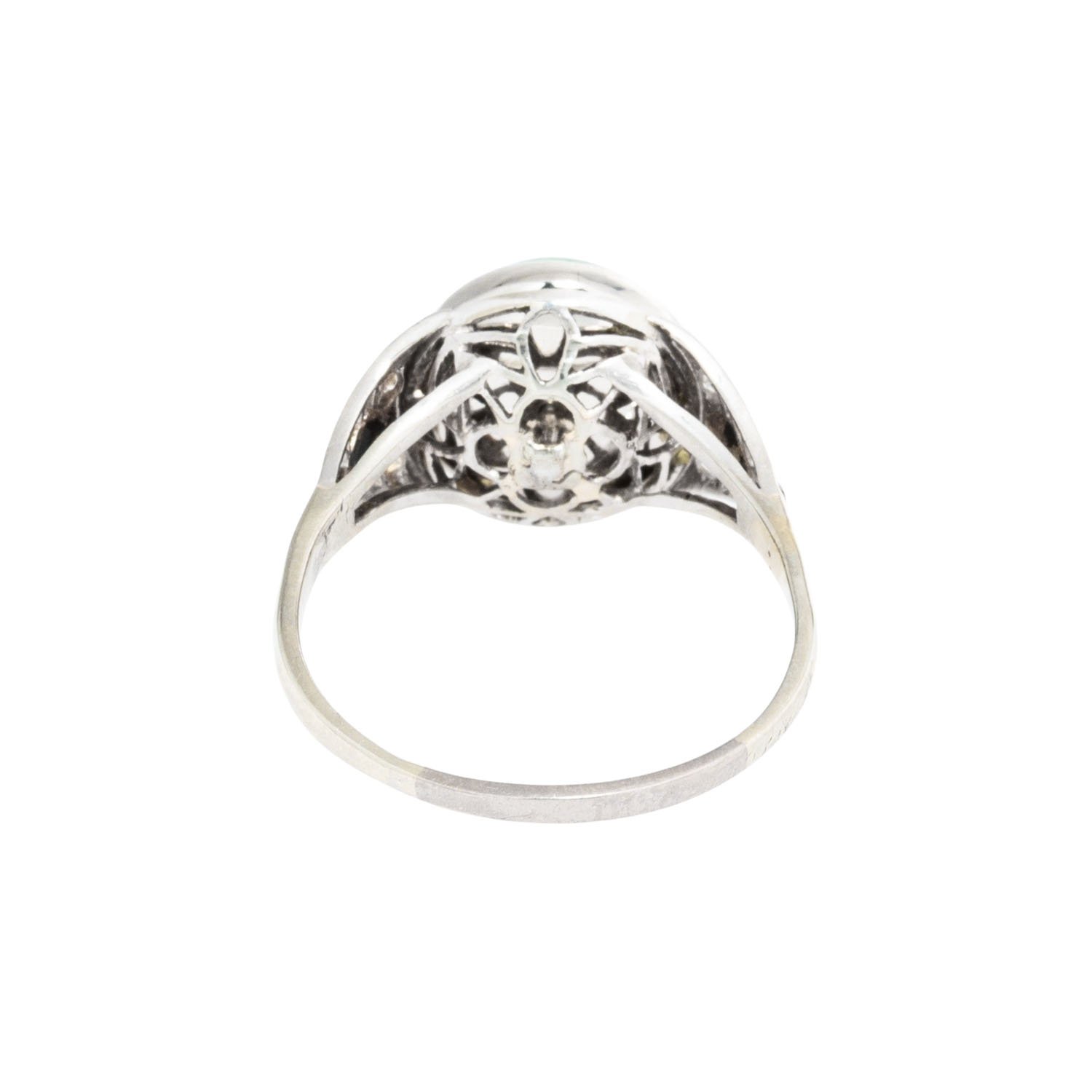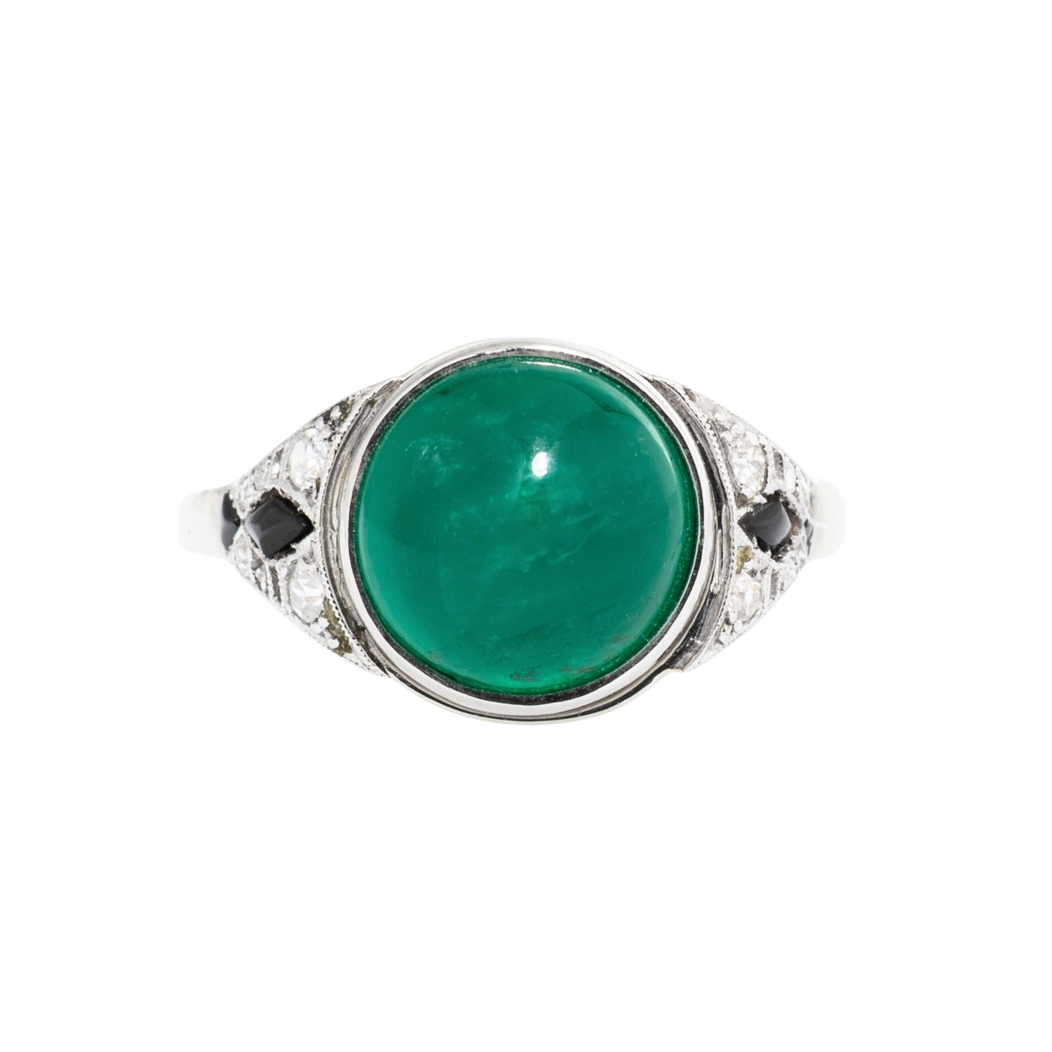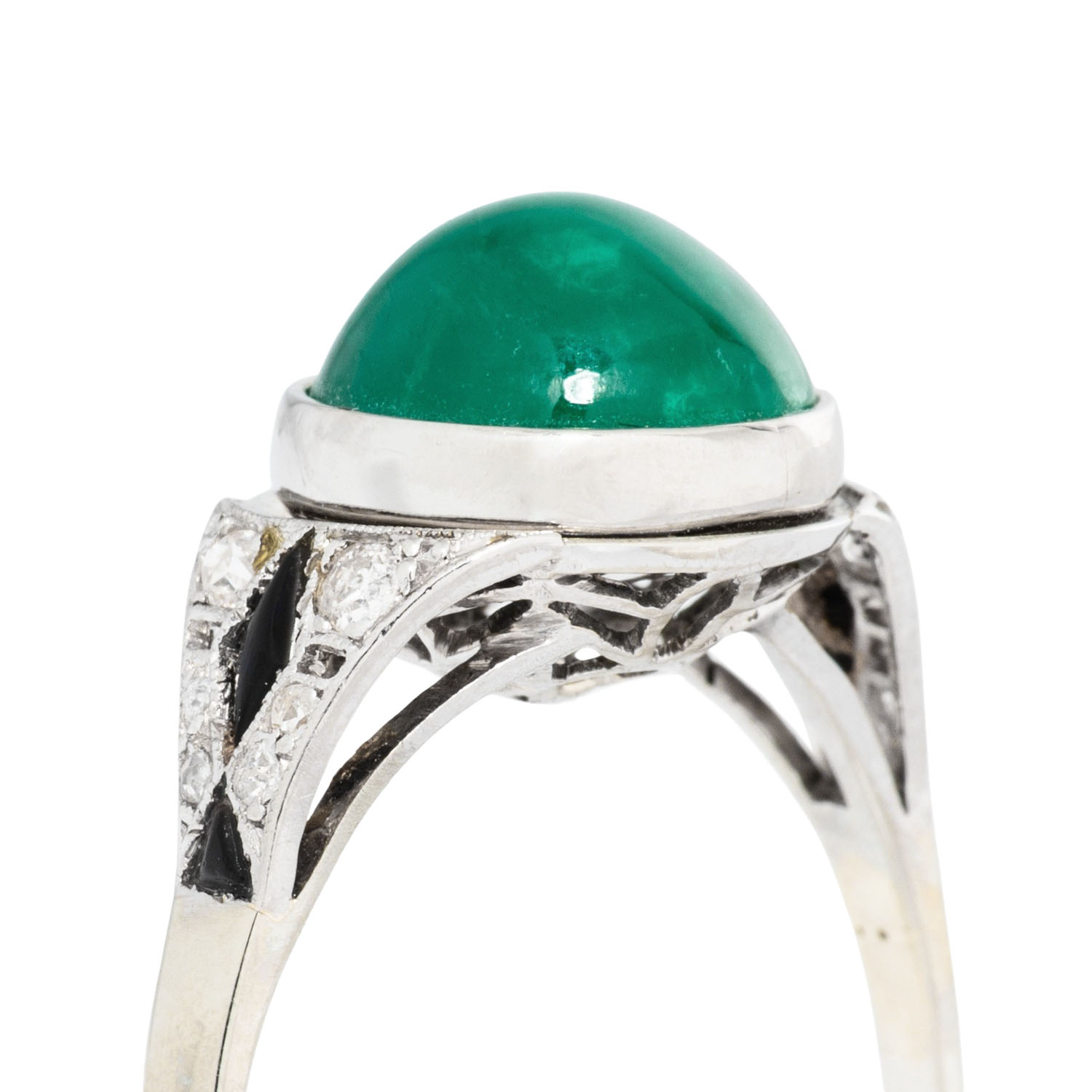 im Cabochonschliff ca. 4,3 ct, 12 Diamanten und Onyx, Platin, Ringschiene WG 18K, 5,2 g, RW: ca. 59, Ringschiene leicht oval. guter Zustand. Handarbeit.