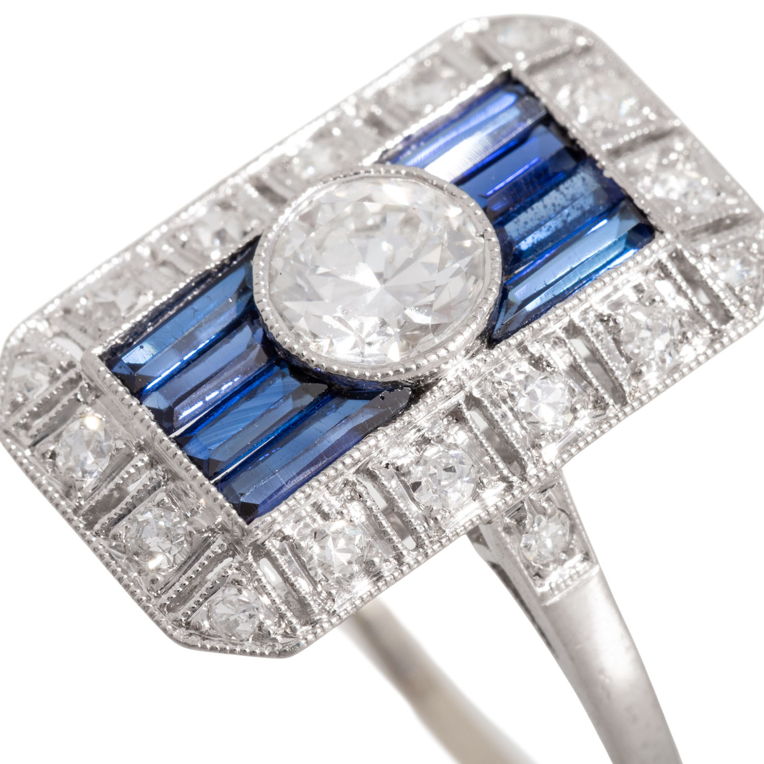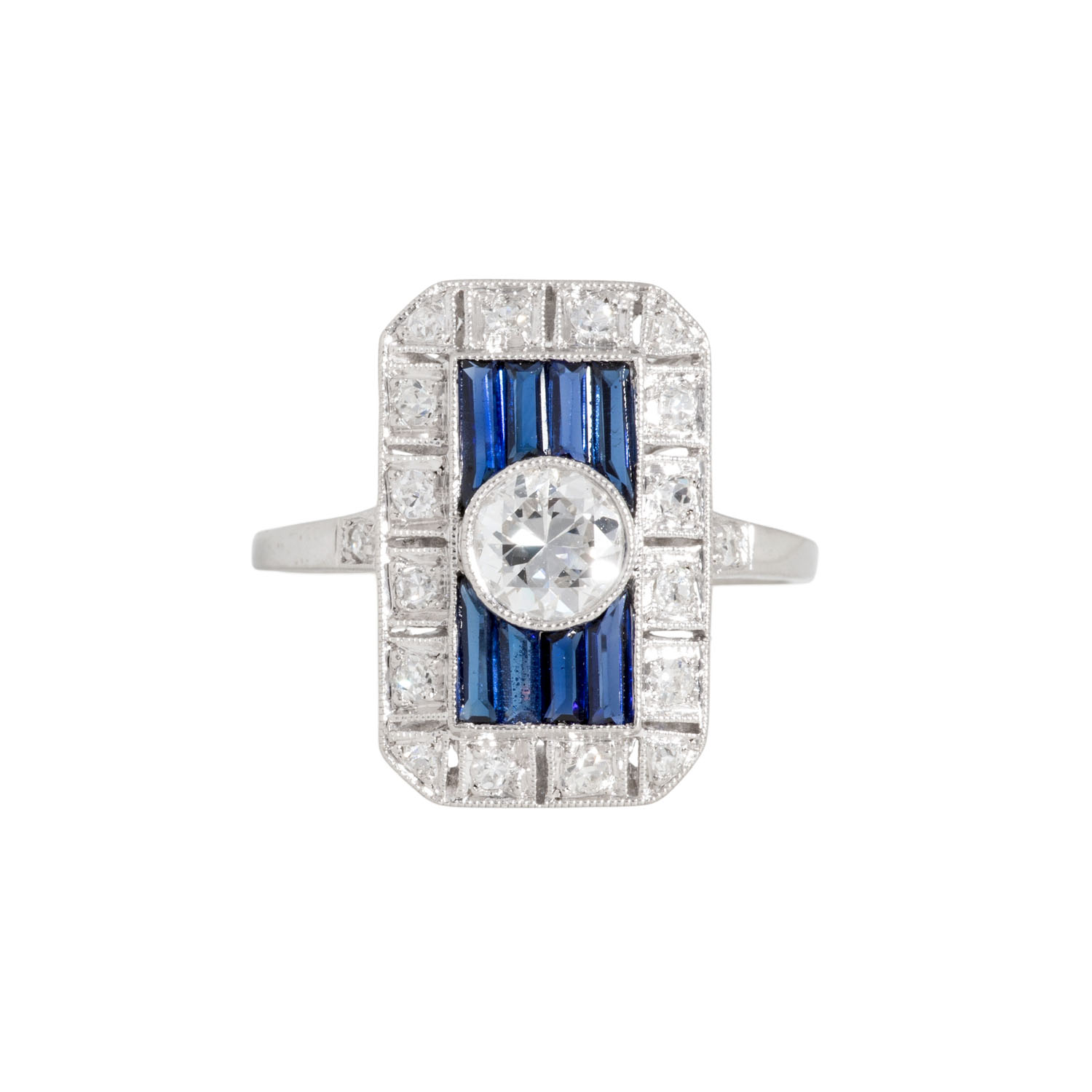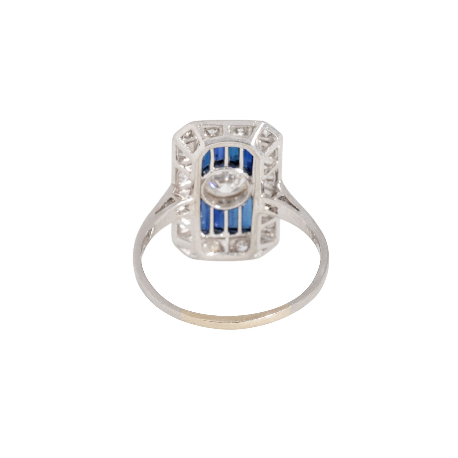 zentraler Diamant im Altschliff von ca. 0,55 ct, WEISS (H)/ P1, 18 Diamanten im Achtkantschliff von zus. ca. 0,25 ct, von guter Farbe und Reinheit und 8 synth.Saphire, Platin, 4,3 g, RW: 56, ca. 14 ct, 20. handgefertigt.