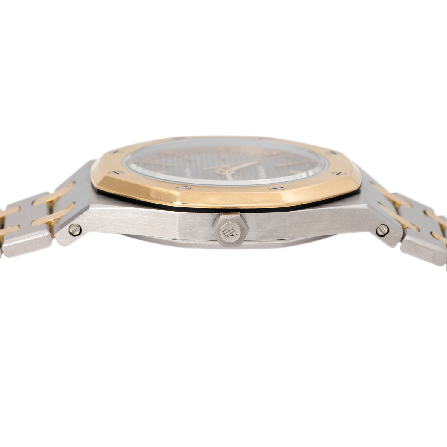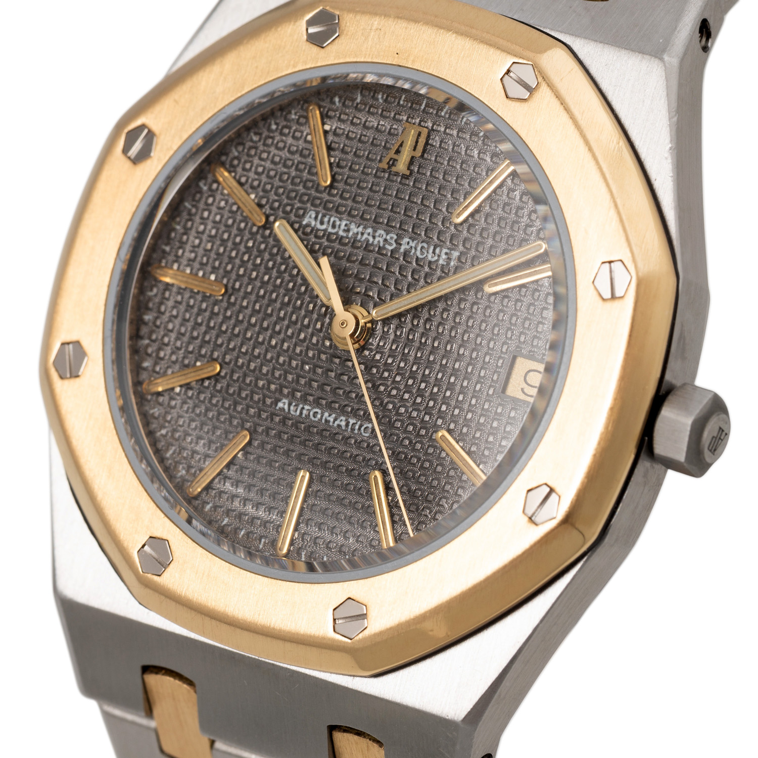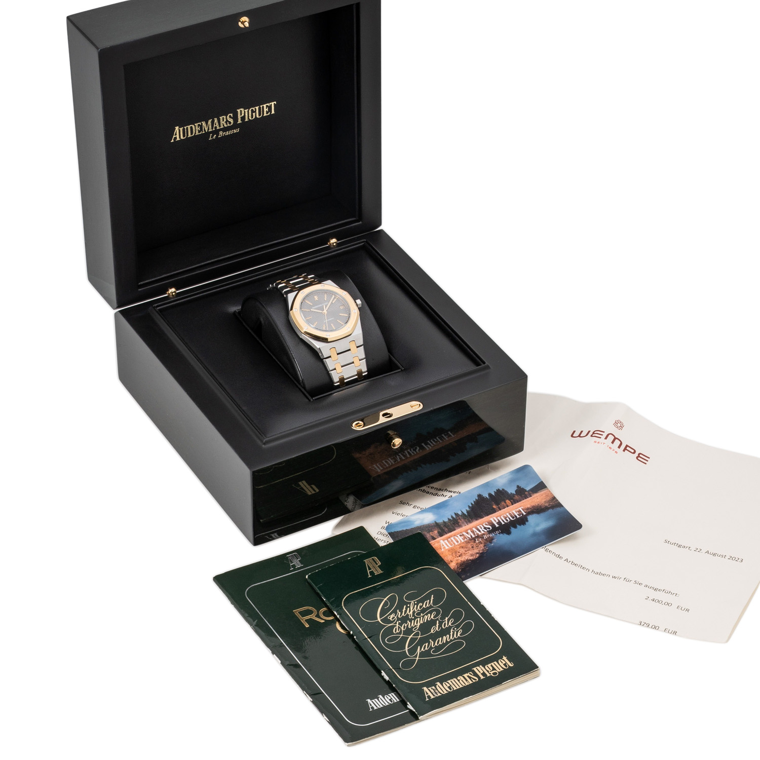 Edelstahl / Gelbgold 18K. Automatik-Werk mit sehr guten Gangwerten (+9s/d, 321°). Originales, silbergraues Petite Tapisserie Tritium-Zifferblatt mit Datumsanzeige, Service-Zeiger. Audemars Piguet Armband in Edelstahl / Gelbgold 18K mit Faltschließe. Guter Zustand mit Tragespuren. Original Box, Garantiezertifikat, Anleitung, AP Life & Care Karte und Wempe Servicenachweis anbei, Revision mit Werktausch 08/2023 für 2.779,- €. Durchmesser ca. 35mm (gemessen ohne Krone), passend für Handgelenksumfang von ca. 19,5 cm.