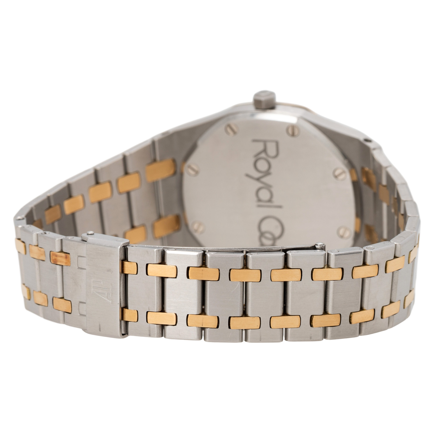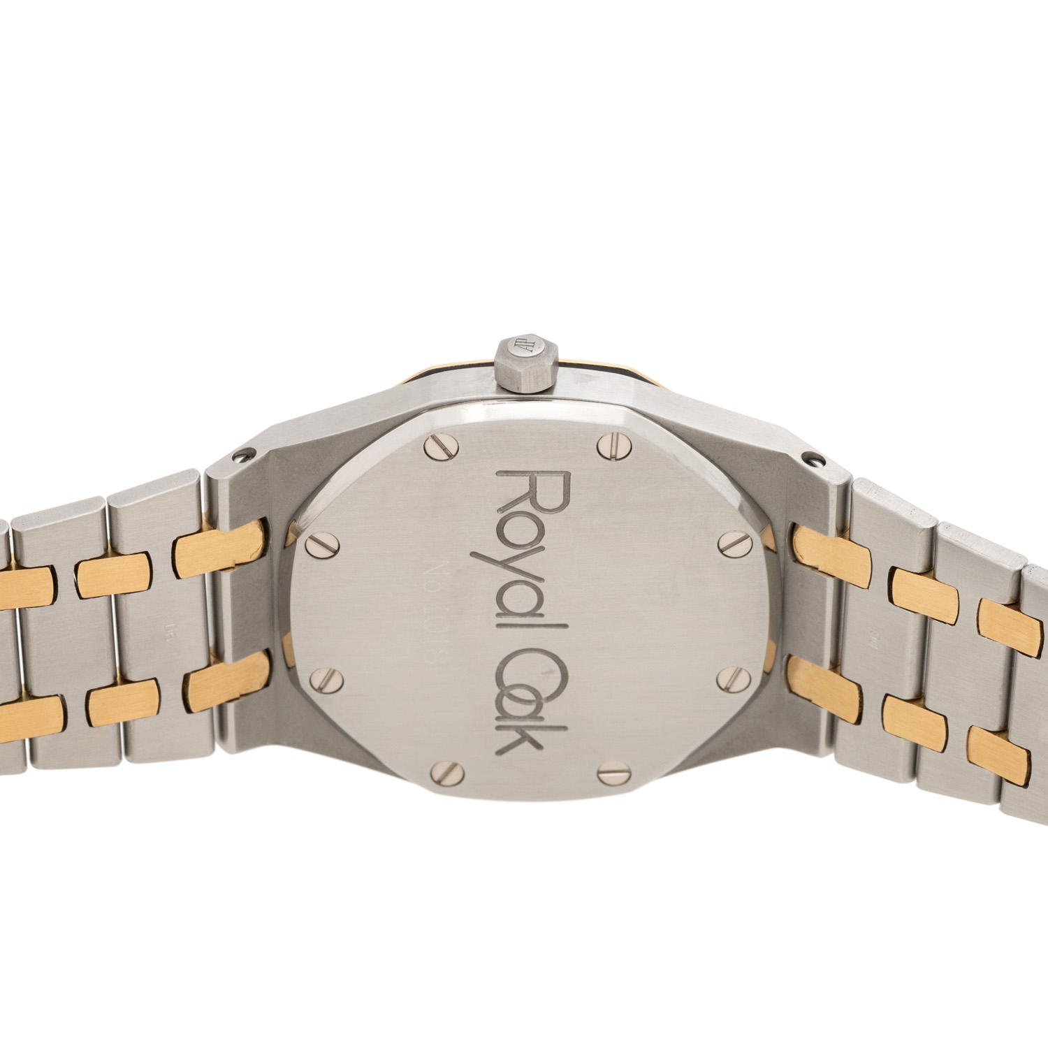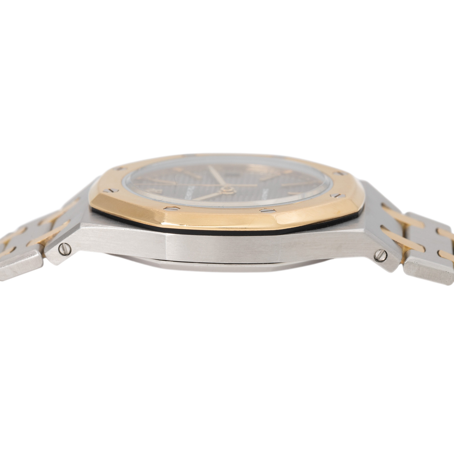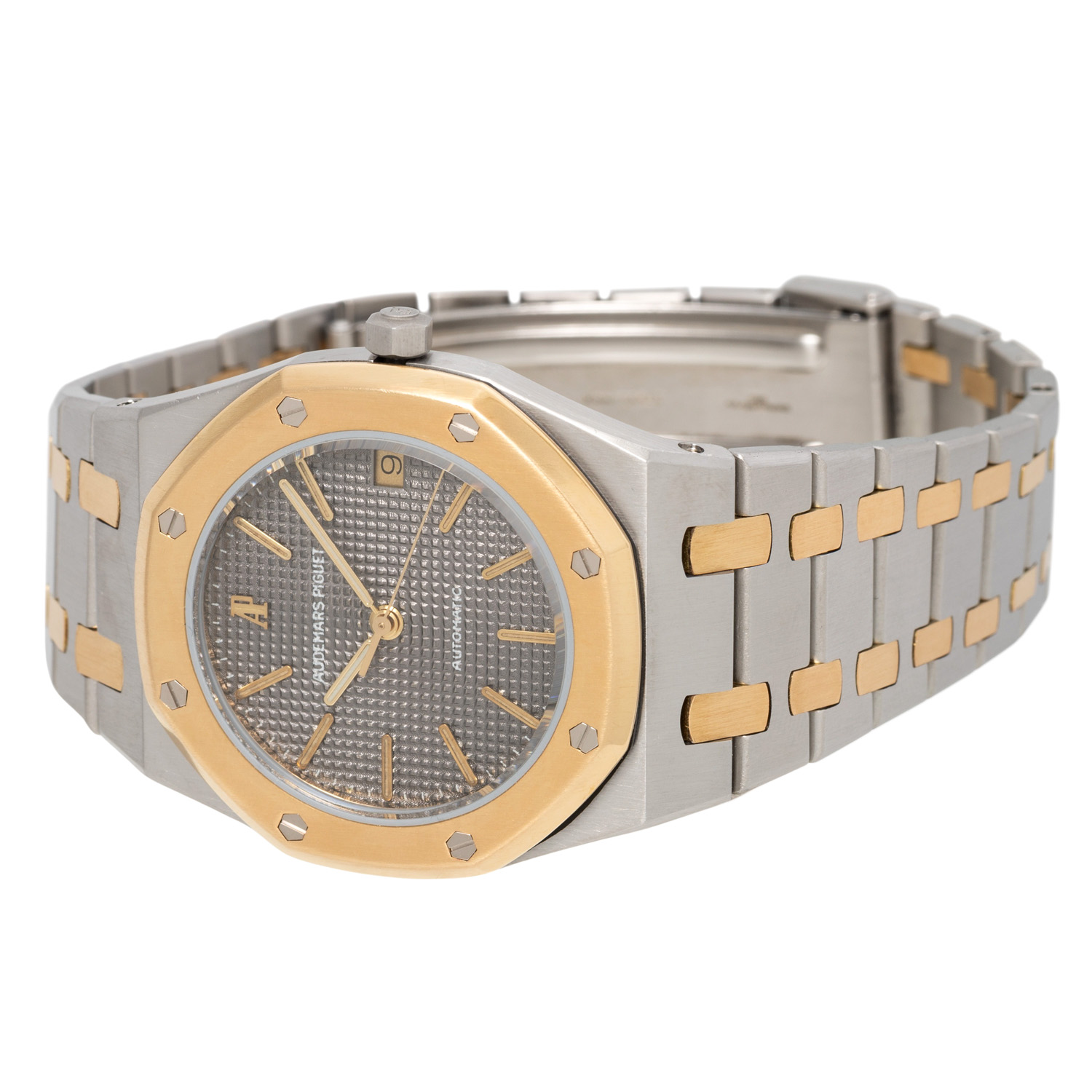 Edelstahl / Gelbgold 18K. Automatik-Werk mit sehr guten Gangwerten (+9s/d, 321°). Originales, silbergraues Petite Tapisserie Tritium-Zifferblatt mit Datumsanzeige, Service-Zeiger. Audemars Piguet Armband in Edelstahl / Gelbgold 18K mit Faltschließe. Guter Zustand mit Tragespuren. Original Box, Garantiezertifikat, Anleitung, AP Life & Care Karte und Wempe Servicenachweis anbei, Revision mit Werktausch 08/2023 für 2.779,- €. Durchmesser ca. 35mm (gemessen ohne Krone), passend für Handgelenksumfang von ca. 19,5 cm.