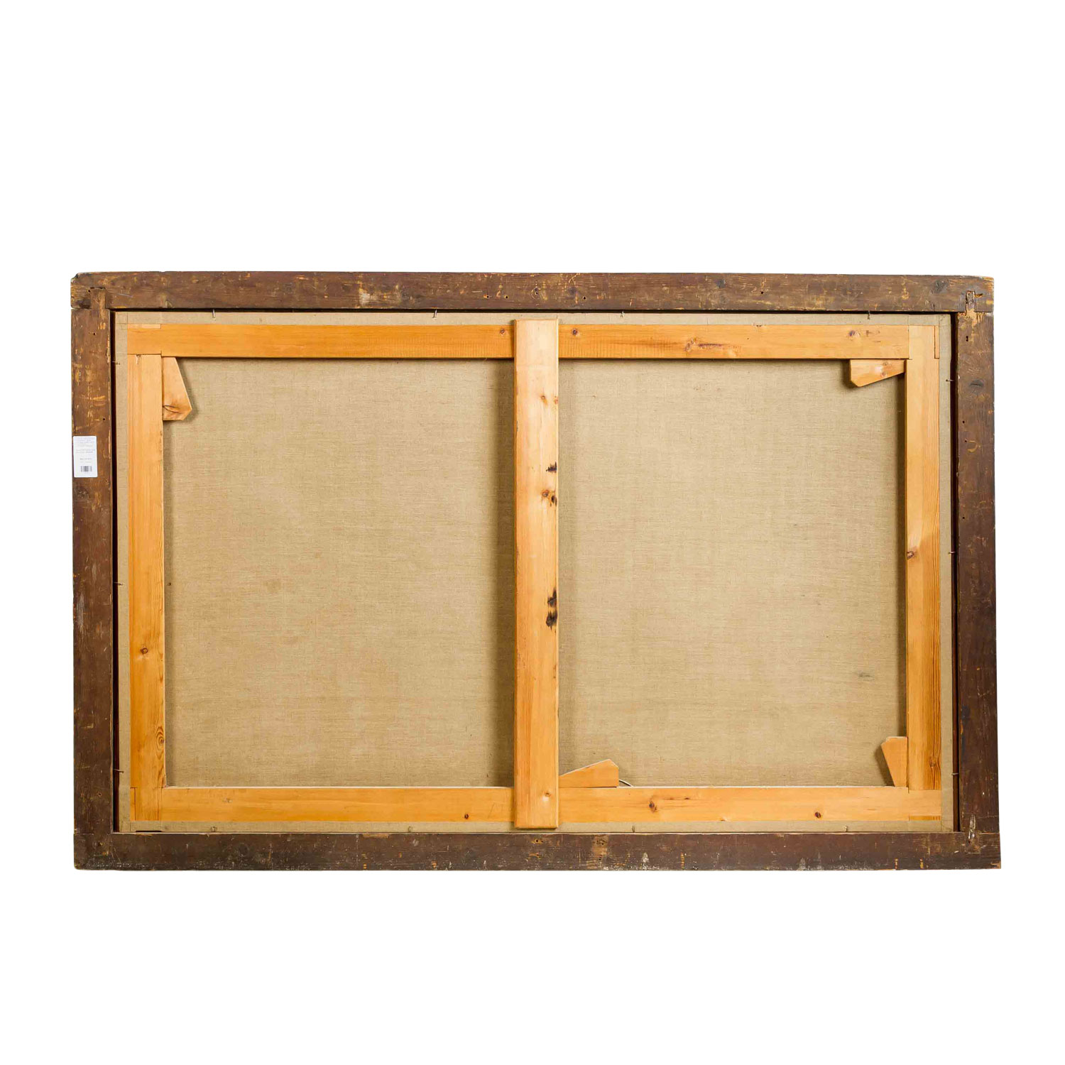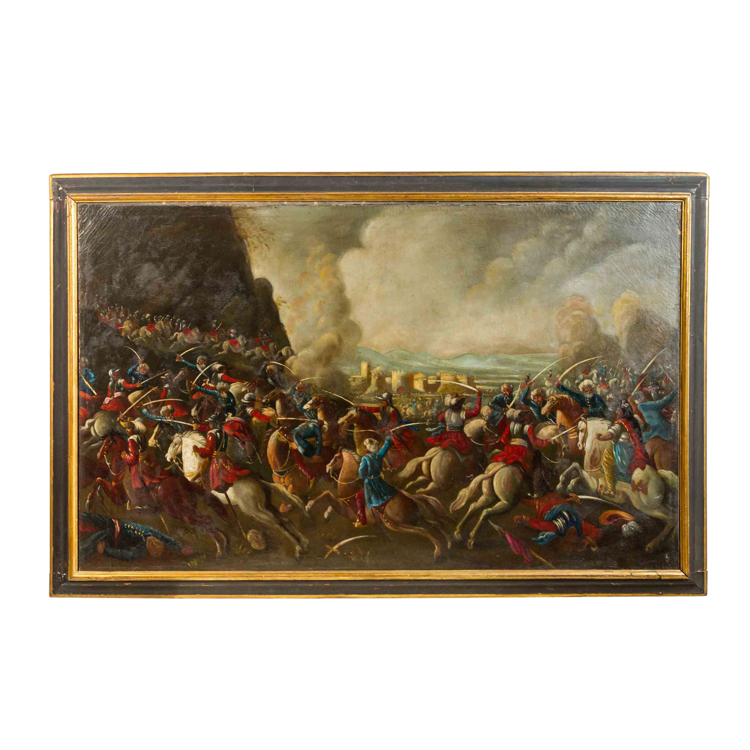 große, vielfigurige Schlacht vor der Silhouette einer orientalischen Idealstadt, unsigniert, Öl/Leinwand doubliert, HxB: ca. 103x165 cm (118x180 cm mit Rahmen). Craquelé, part. Farbabplatzer und Berieb, alt restauriert. Mit Rahmen (Altersspuren, Trocknungsrisse).