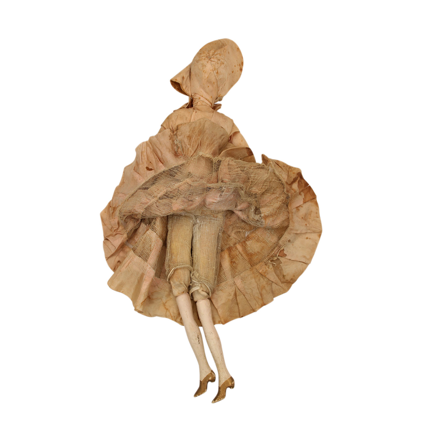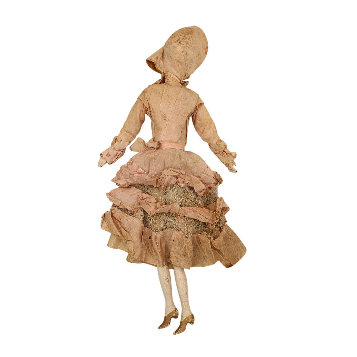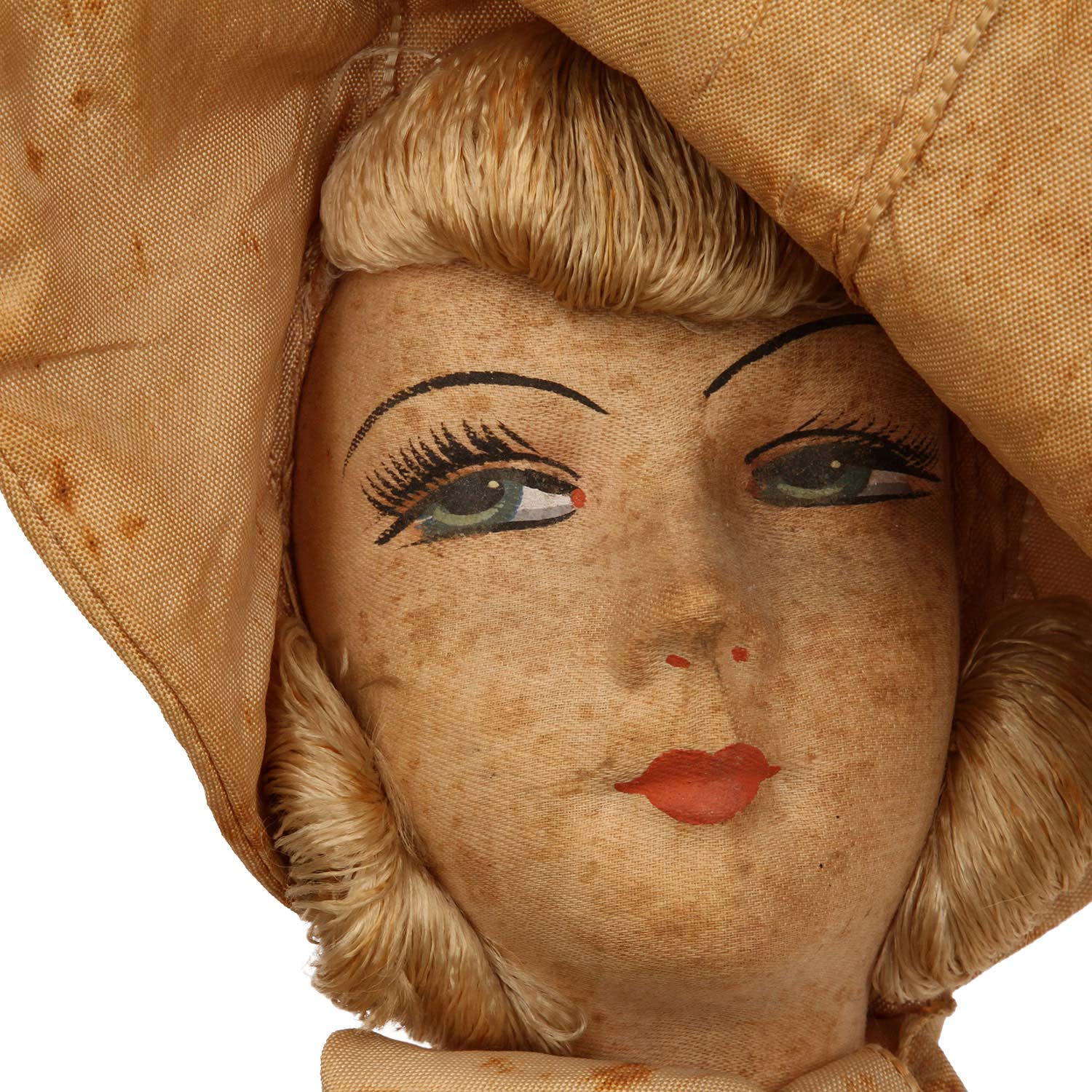 bemalter, ausdrucksstarker Stoffkopf m. blonden Haaren, Leinenkörper m. Unterarmen u. Unterschenkeln aus Masse, gem. rote Fingernägel, gem. Schuhe. Originalkleidung, Altersspuren, part. besch., 1 Finger geklebt, Gesamtl. ca. 79 cm.