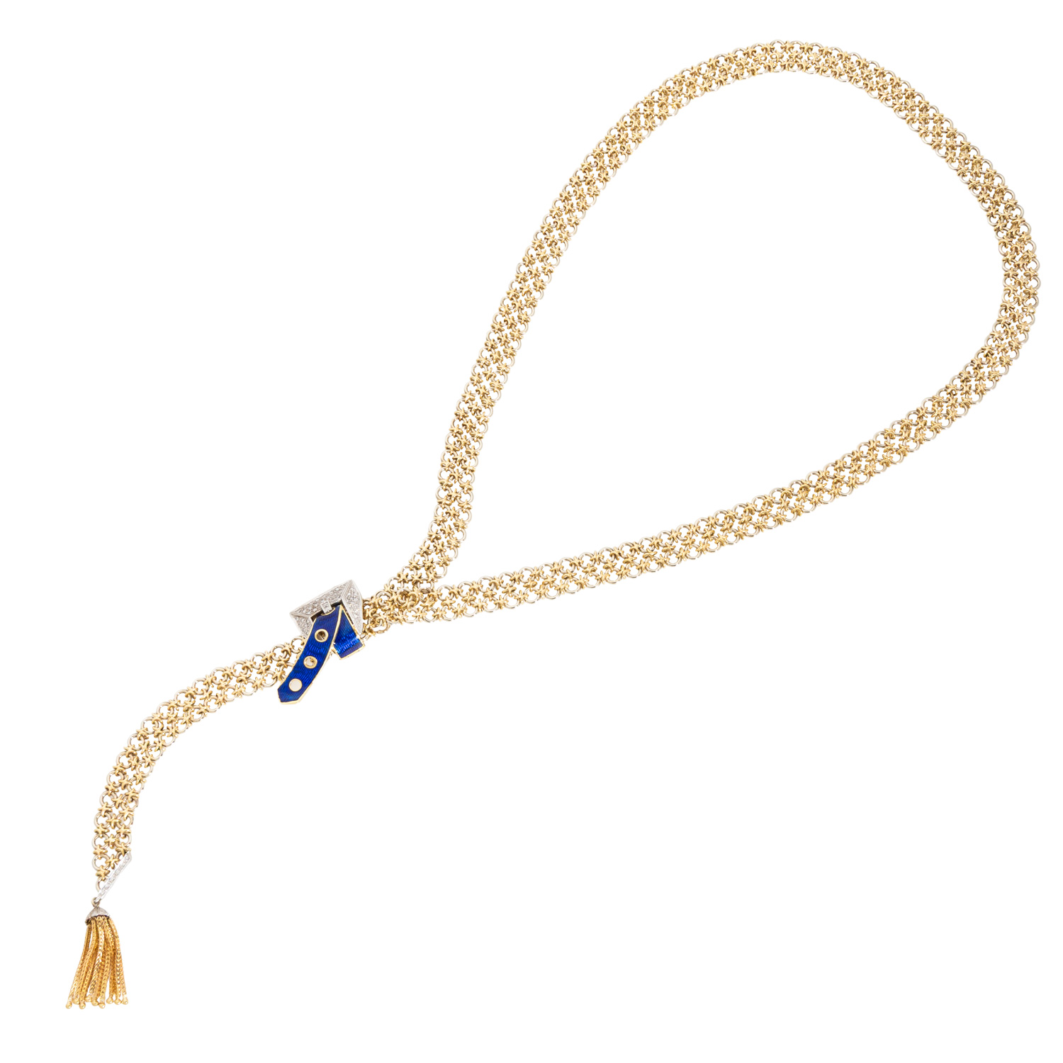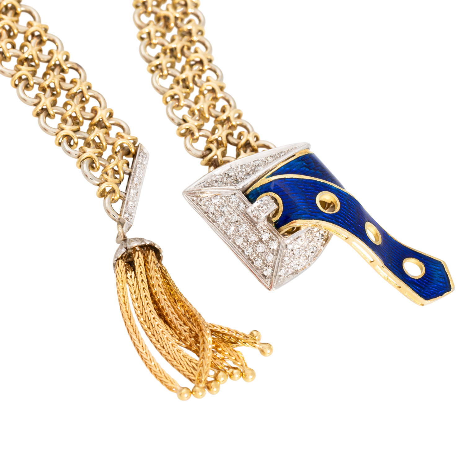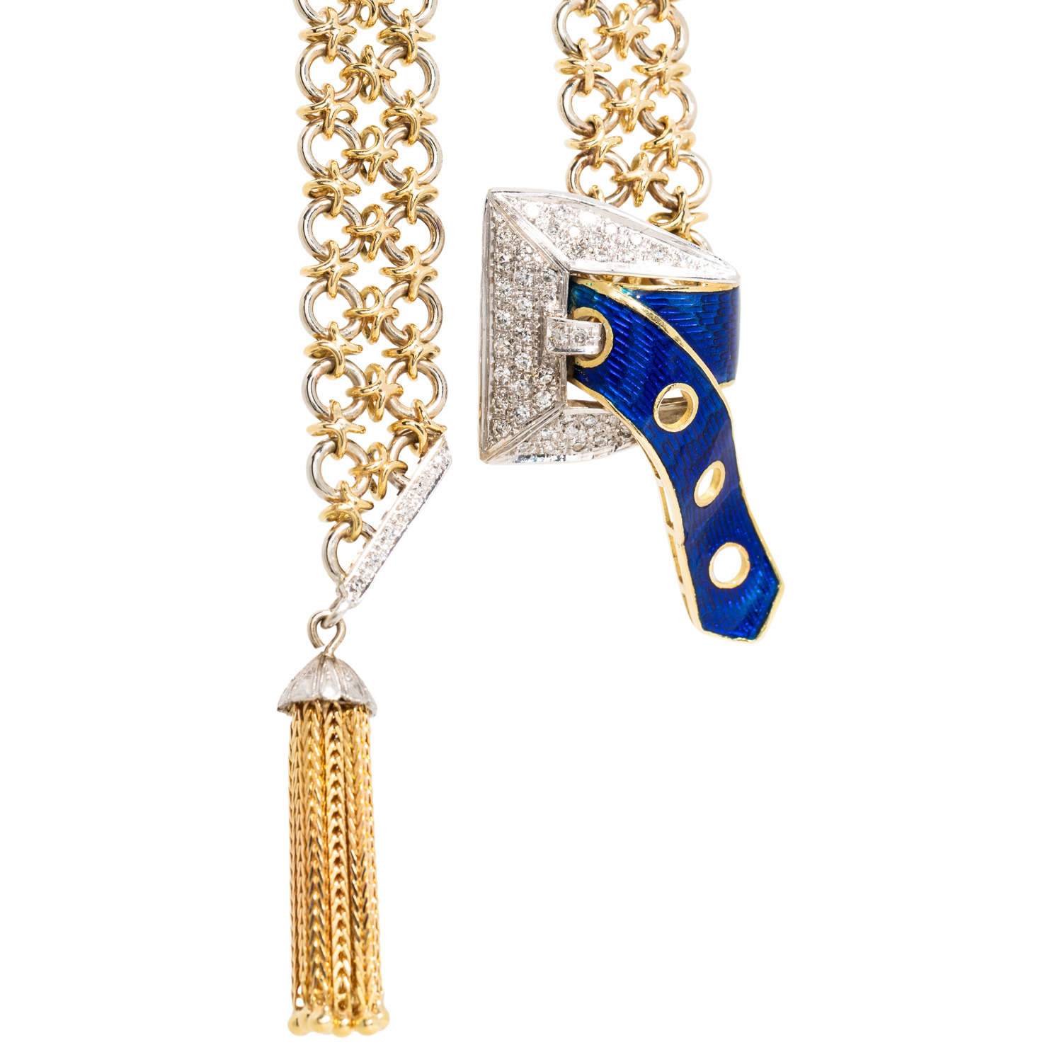 50 Achtkantdiamanten zus. ca. 0,47 ct, ca. WEISS-LGW (H-J)/SI-P1, Pavé gefasst, Email blau transparent, Boden stark beschädigt, Kettenband im handgearbeiteten zweireihigen Knotenmuster aus GG/WG 18K, 146,7 g, L: ca. 93 cm, B: ca. 1,3 cm, Gürtelschließe L x B: ca. 4,2 x 2,5 cm, Quaste mit 9 Strängen, L x B: ca. 3,2 x 0,5 cm, 2. H. 20. Jh., Tragespuren, äußerst aufwändige Handarbeit.