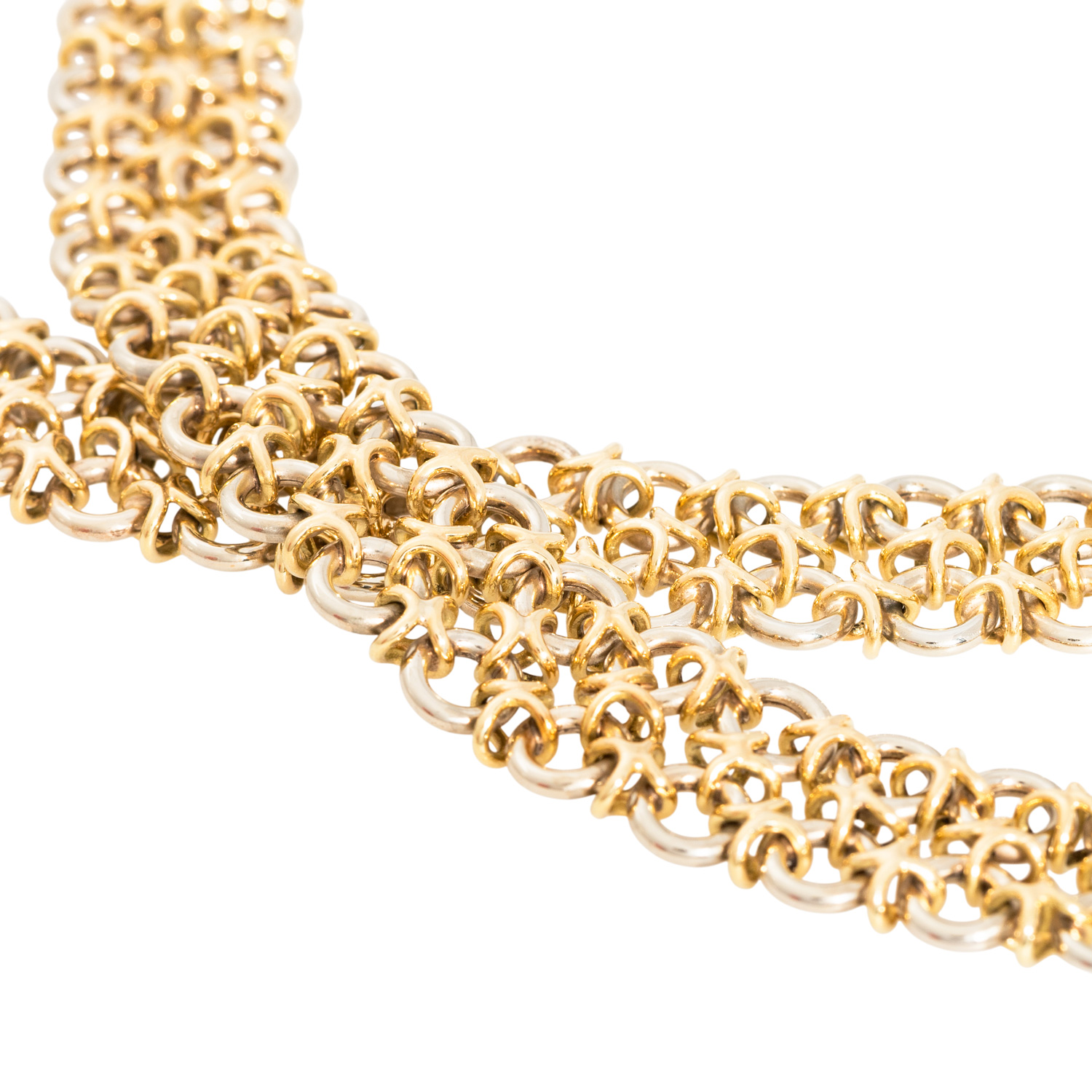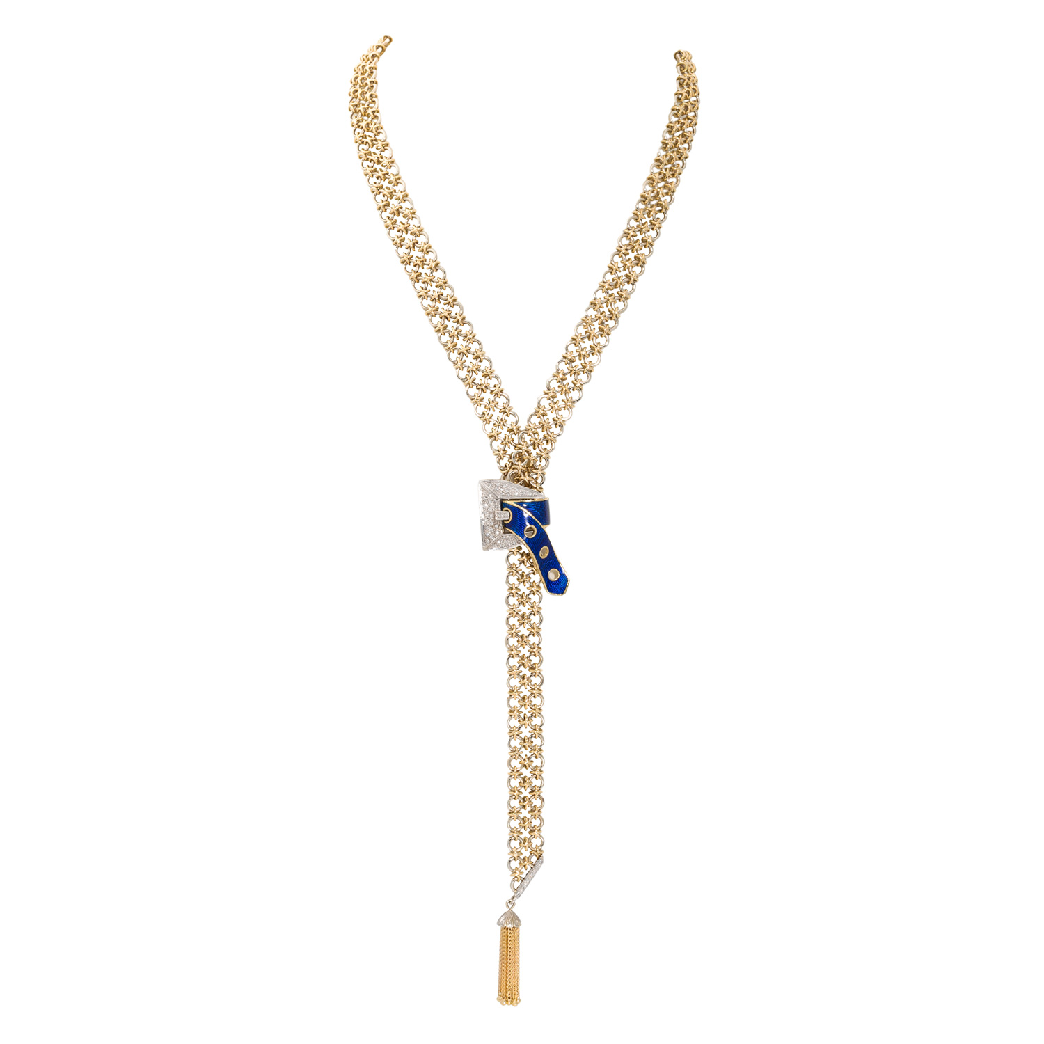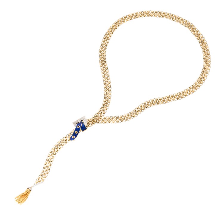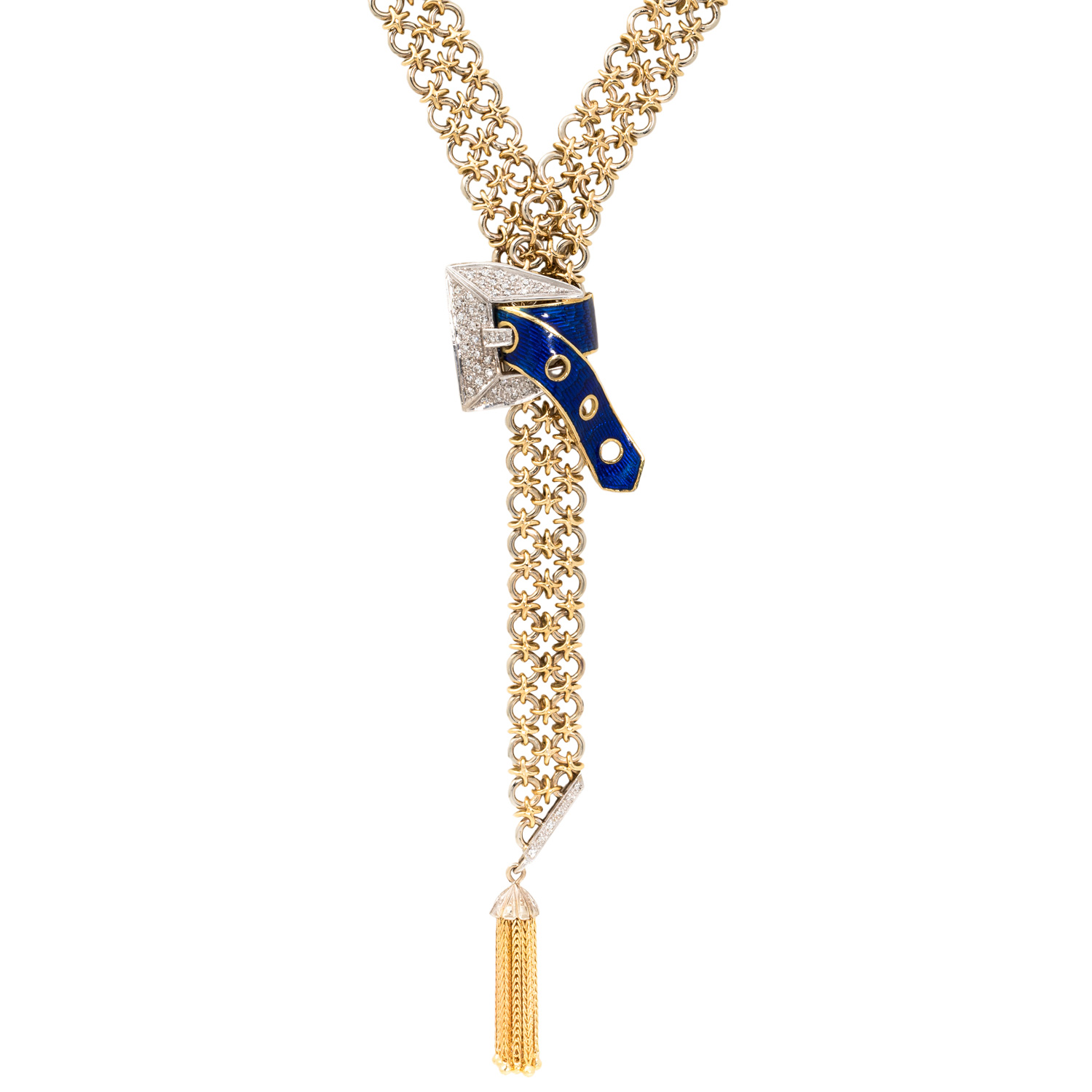 50 Achtkantdiamanten zus. ca. 0,47 ct, ca. WEISS-LGW (H-J)/SI-P1, Pavé gefasst, Email blau transparent, Boden stark beschädigt, Kettenband im handgearbeiteten zweireihigen Knotenmuster aus GG/WG 18K, 146,7 g, L: ca. 93 cm, B: ca. 1,3 cm, Gürtelschließe L x B: ca. 4,2 x 2,5 cm, Quaste mit 9 Strängen, L x B: ca. 3,2 x 0,5 cm, 2. H. 20. Jh., Tragespuren, äußerst aufwändige Handarbeit.