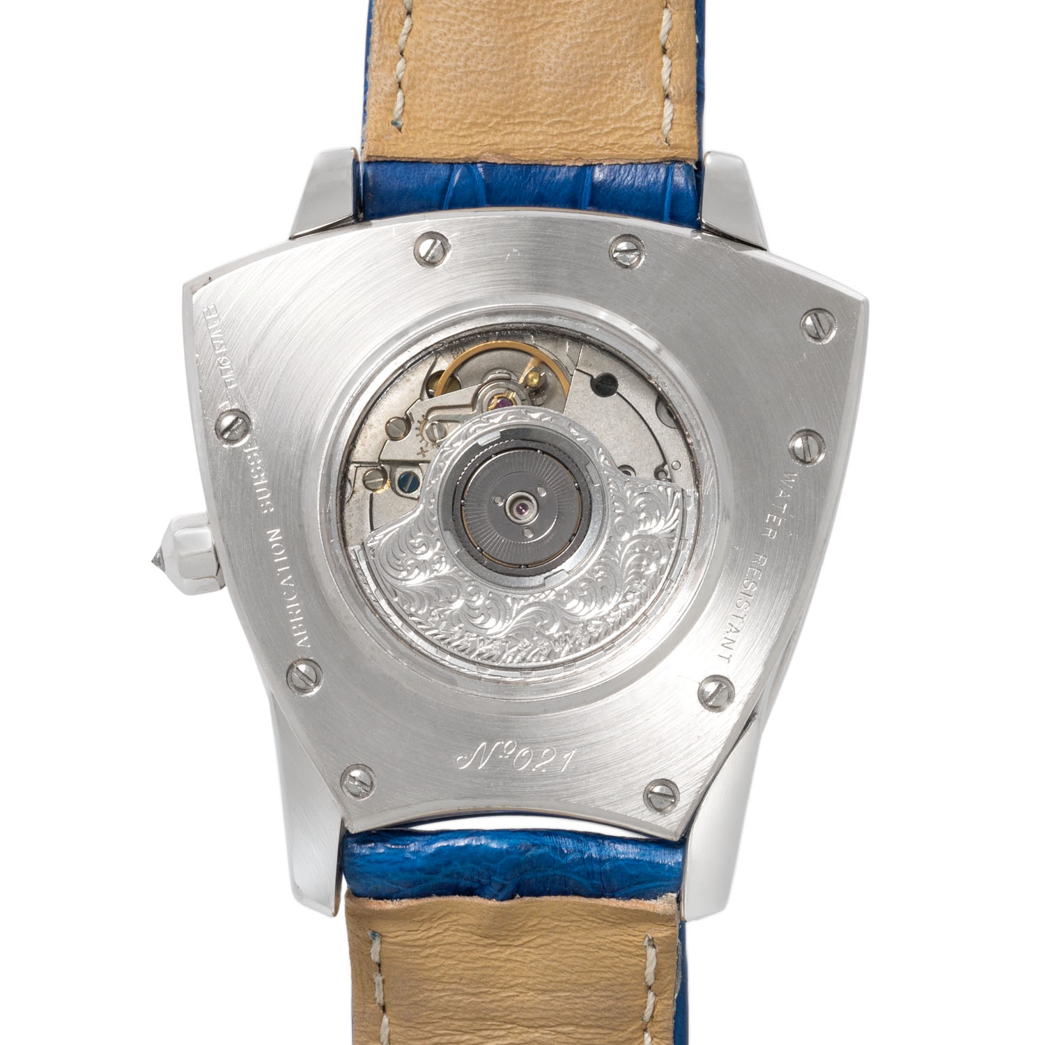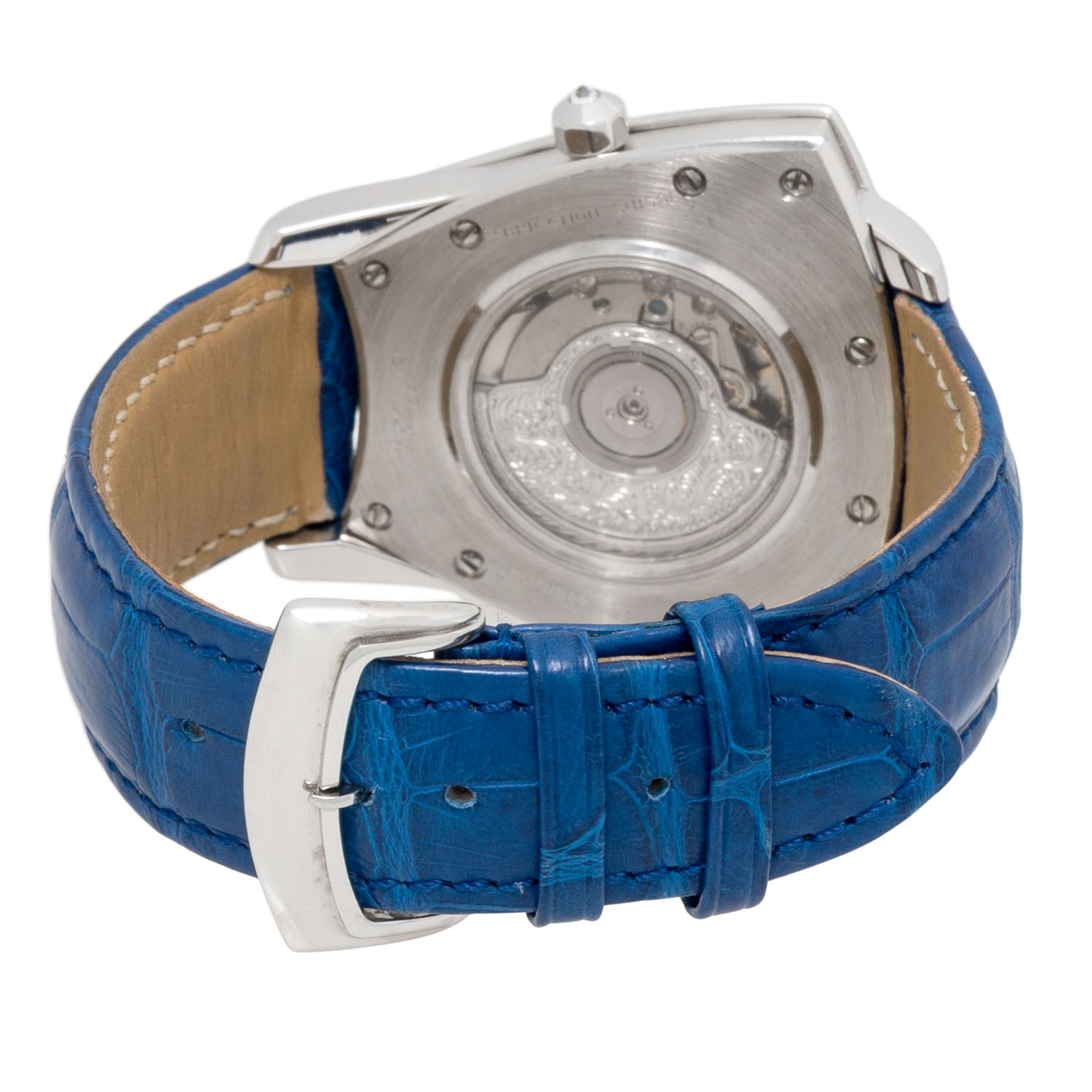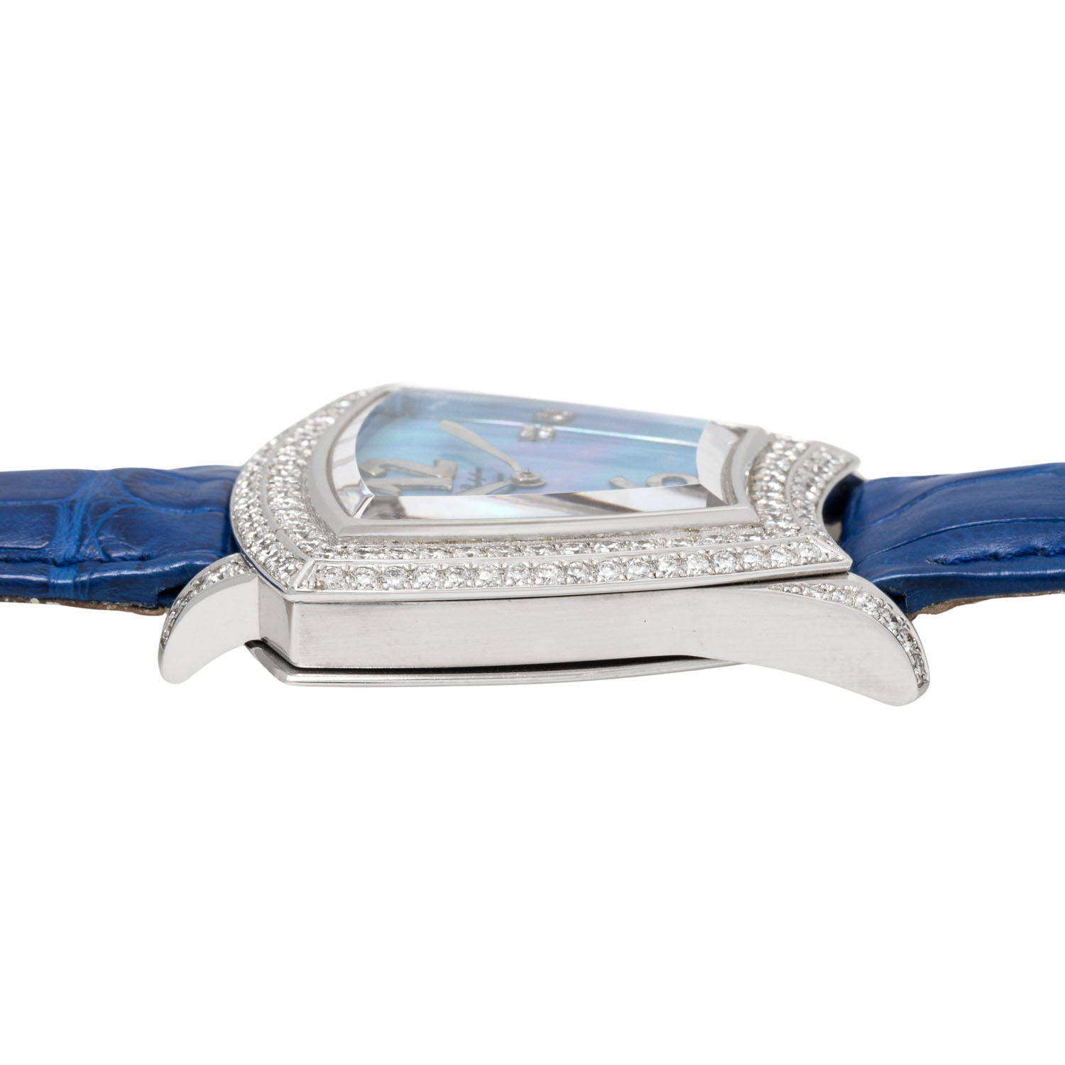 Weißgold 18K, Lünette, Bandanstöße und Krone besetzt mit ges. 135 Brillanten (zus. ca. 3,5ct). Automatic-Werk Kal. ETA 2892-A2, gute Gangwerte (+5s/Tag, 246° Amplitude). Perlmutt-Zifferblatt mit applizierten arabischen Ziffern, 8 Brillant-Indizes, Schwertzeiger. Lederband mit originaler Stiftschließe in Weißgold 18K. Sehr guter Zustand, leichte Kratzer auf dem Gehäuseboden. Holzbox anbei. Durchmesser ca. 43mm gemessen ohne Krone.