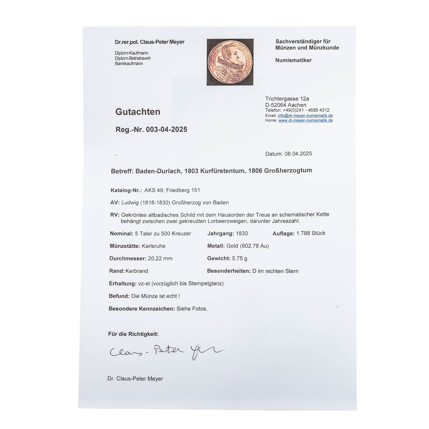 ca. 5,75 g, vz-stgl., Dm. ca. 20,22 mm. Auflage: 1.788 Stück - Selten! AKS 49; Friedberg 151. Anbei ein aktuelles Gutachten: Reg.-Nr. 003-04-2025