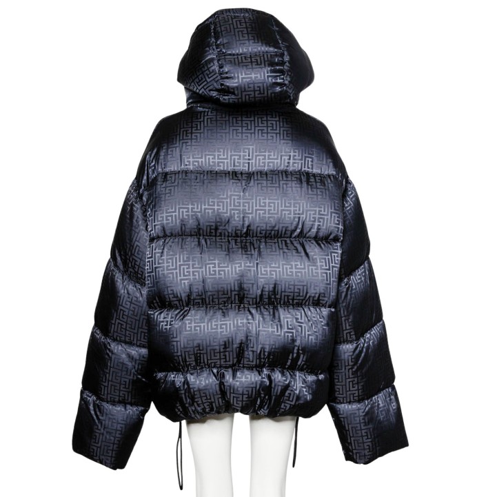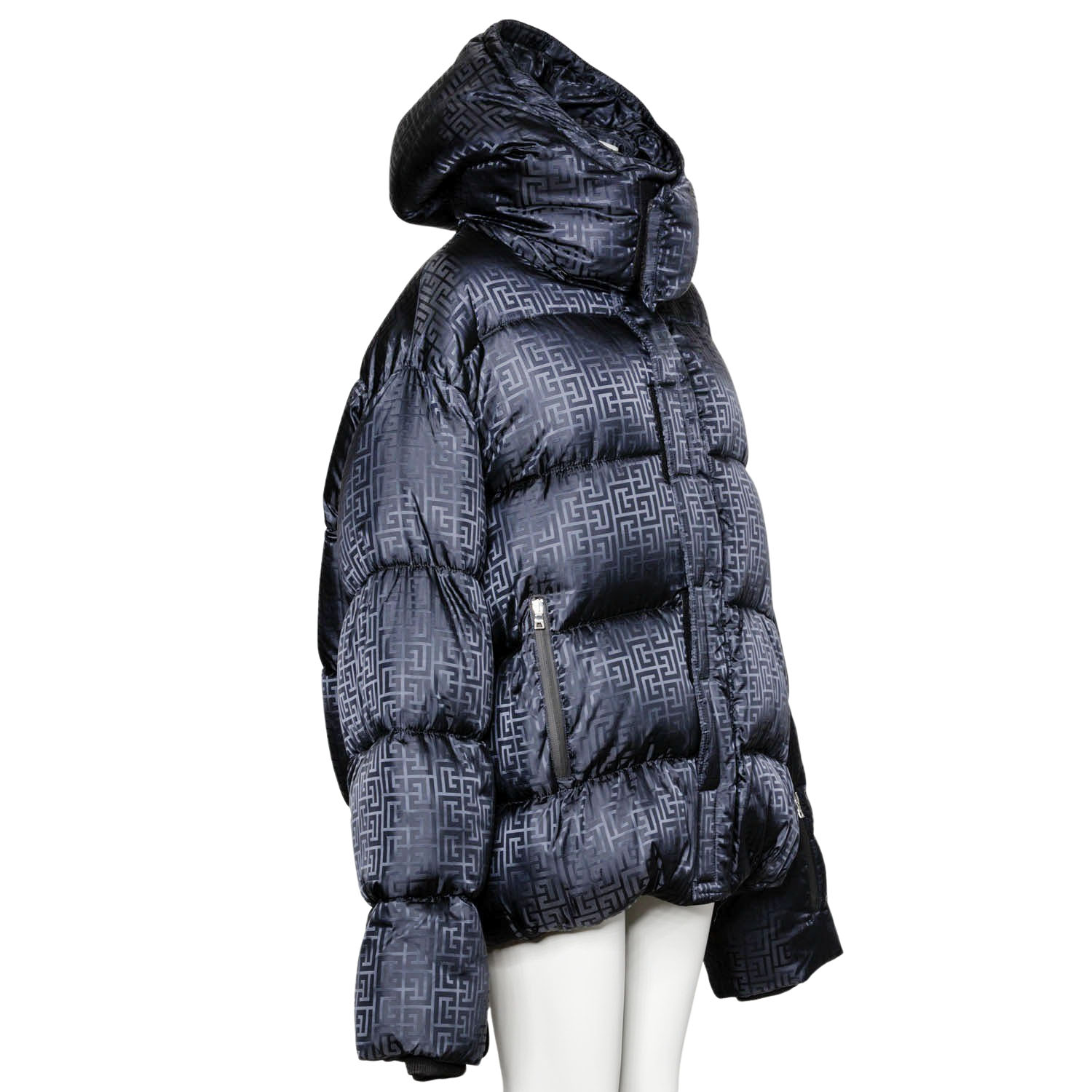 Schwarzes Modell aus Nylon mit Logodesign, horizontaler Steppung, Stehkragen, abnehmbarer Kapuze und Raffung am Saum. Tragespuren vorhanden.