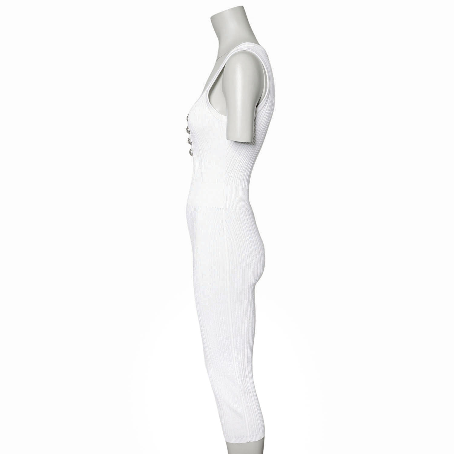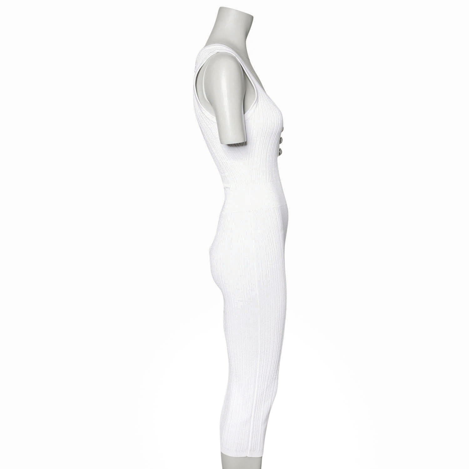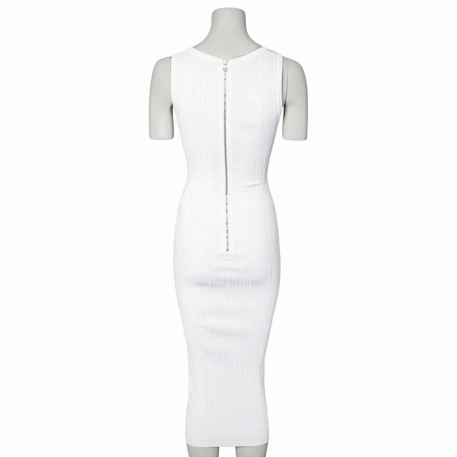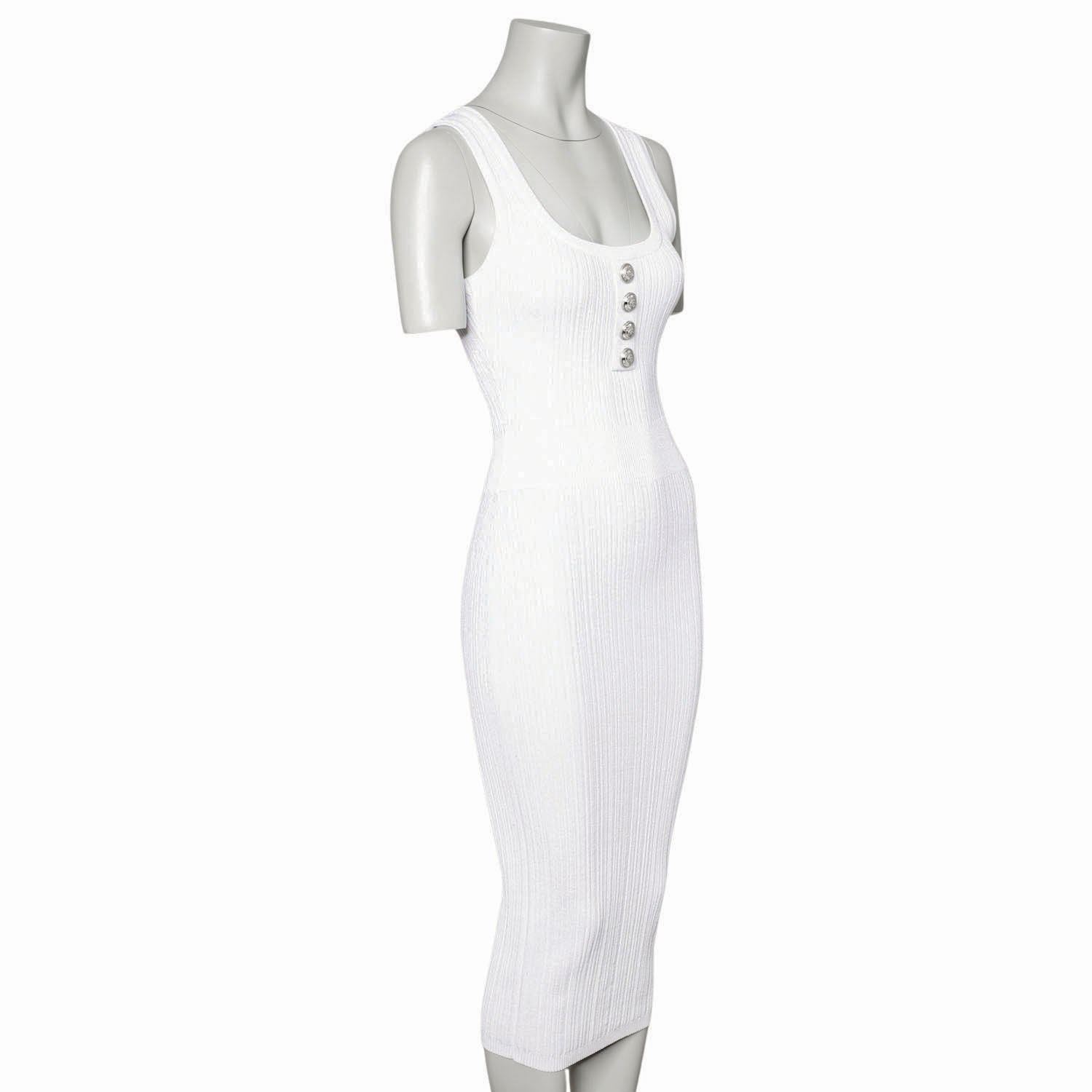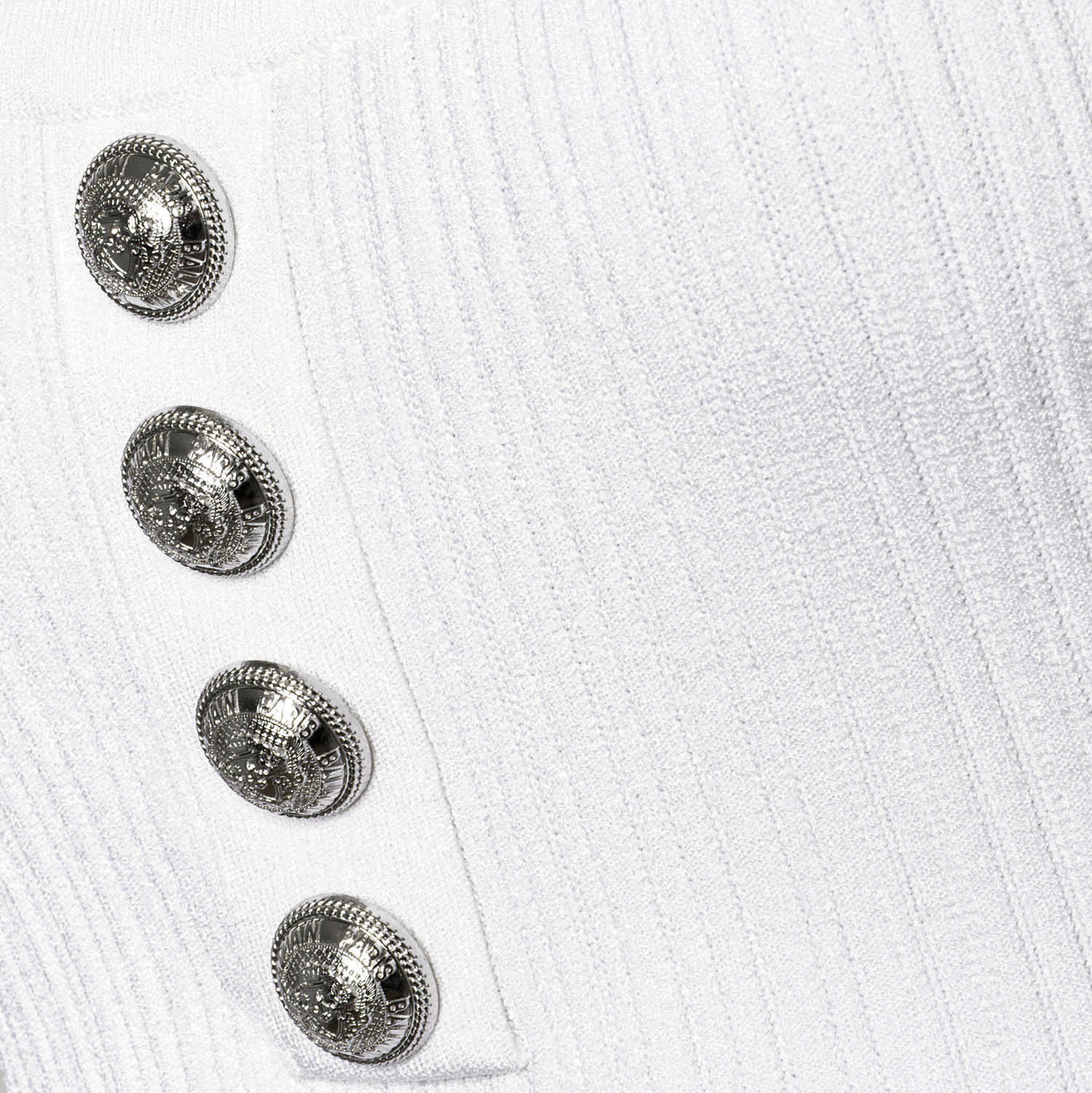 Elastisches Strickkleid in Weiß mit weitem Ausschnitt mit dekorativen, silberfarbenen Zierknöpfen. Sehr guter Erhalt.