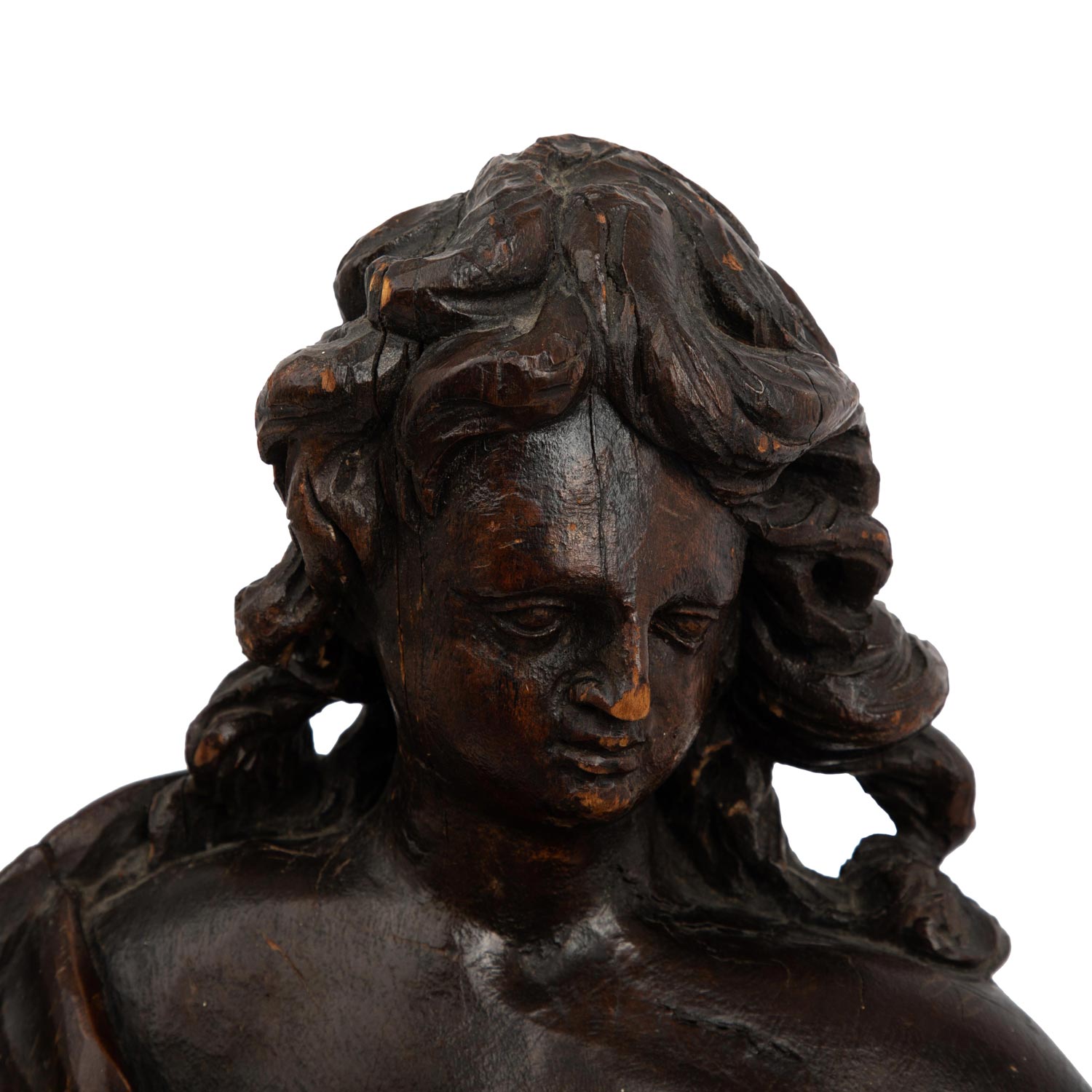 Süddeutschland, 18.Jh., Lindenholz, Standfigur in betontem Kontrapost mit leicht vorgestelltem Spielbein, auf mehrkantigem, zugehörigem und mitgeschnitztem Sockel stehend, das Gesicht markant geschnitzt mit leicht eingefallenen Wangen, schmalem langziehenden Nasenrücken und schräg geschnitzten Augen, umgeben von Haarlocken, die zur Schulter ziehen, über dem Kleid mit einigen Röhrenfalten ein Mantel, der an der Schulter unter der Haarlocke gebunden ist, H: 72 cm. Altersspuren, teilw. rest. bzw. ergänzt.