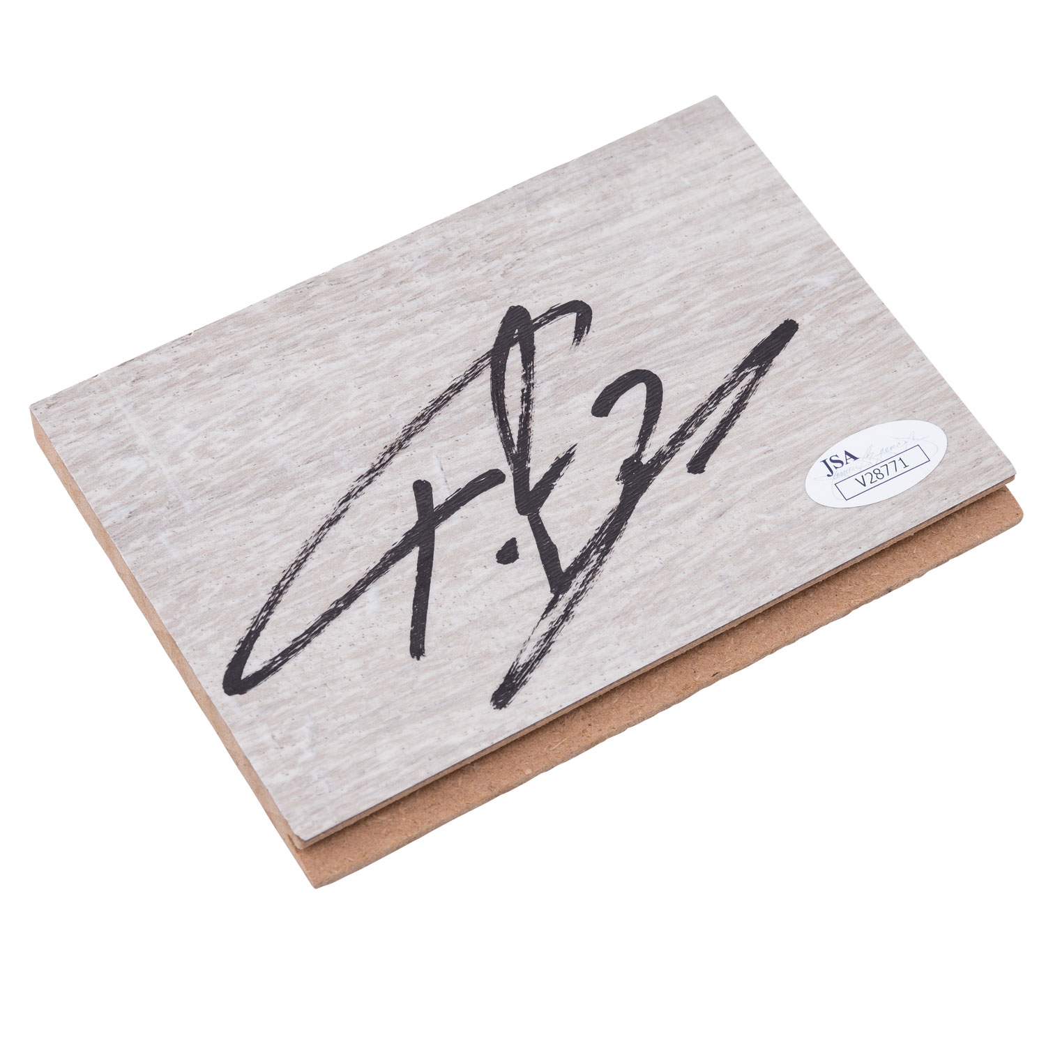 12,5 x 9 x 1 cm, aus 'Graceland Oak', mit Autogramm des Basketballers. Anbei JSA Zertifikat und Hologramm (NR. V28771). Mit Lagerspuren.