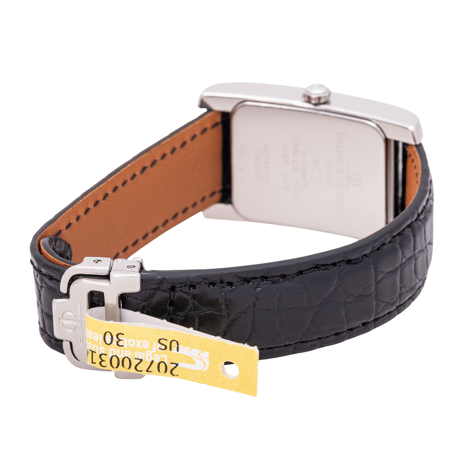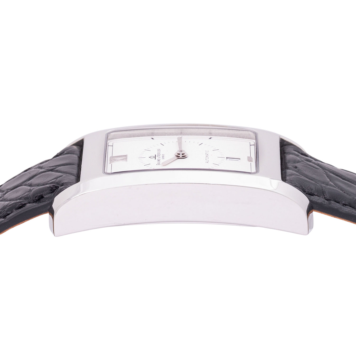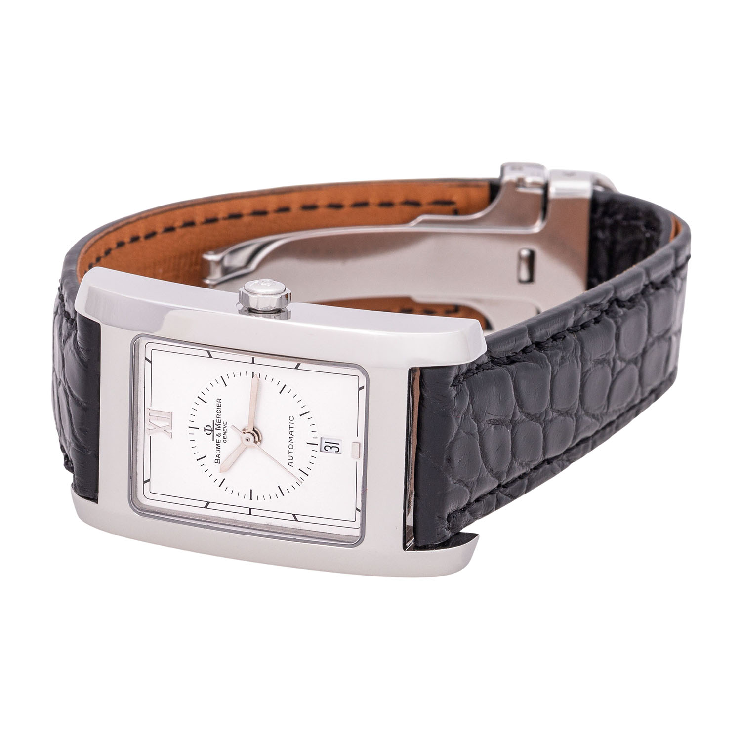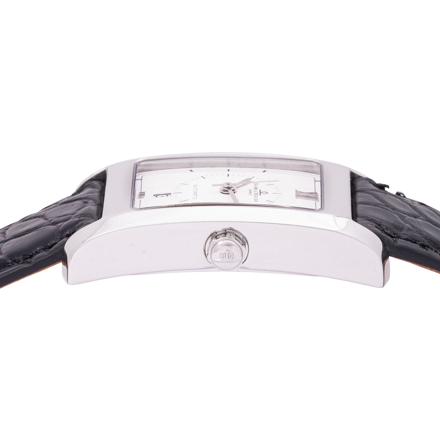 Edelstahl. Automatik-Werk Kal. ETA 2000-1 mit guten Gangwerten (+2s/d. 247°). Weißes Zifferblatt mit Datumsanzeige. Neues Lederband mit Baume & Mercier Faltschließe. Guter Zustand mit Tragespuren. Durchmesser ca. 25 mm (gemessen ohne Krone). Passend bis zu ca. 18,5 cm Handgelenkumfang.