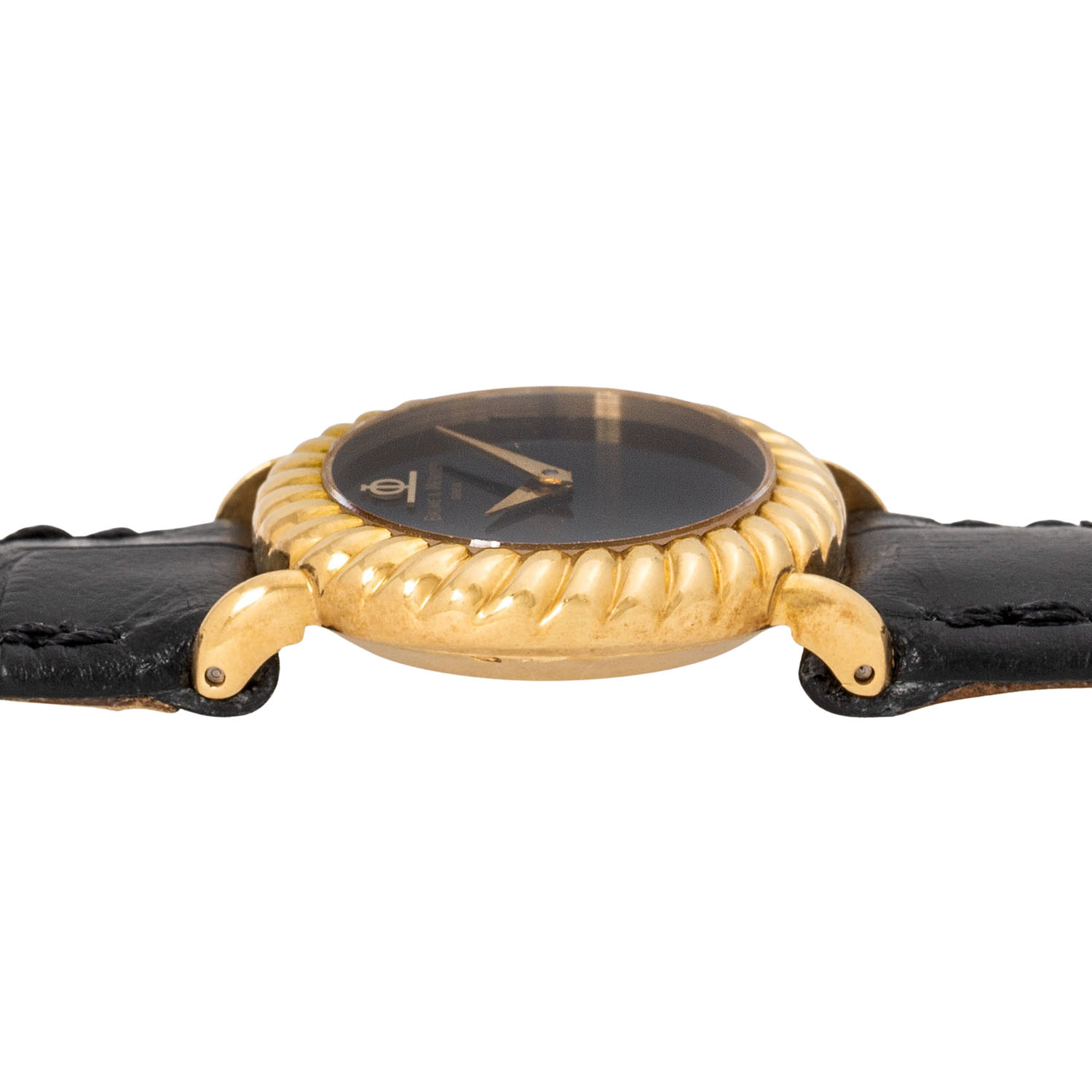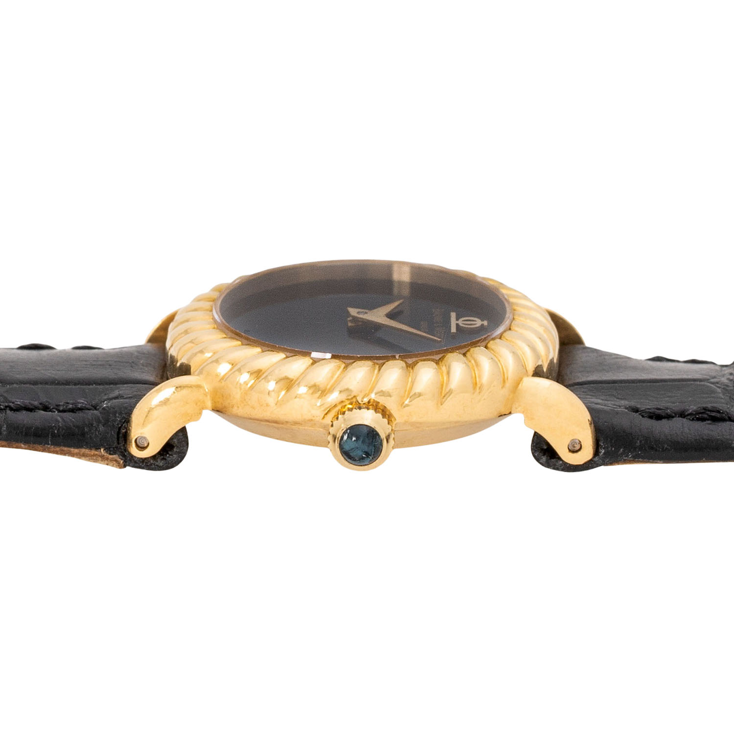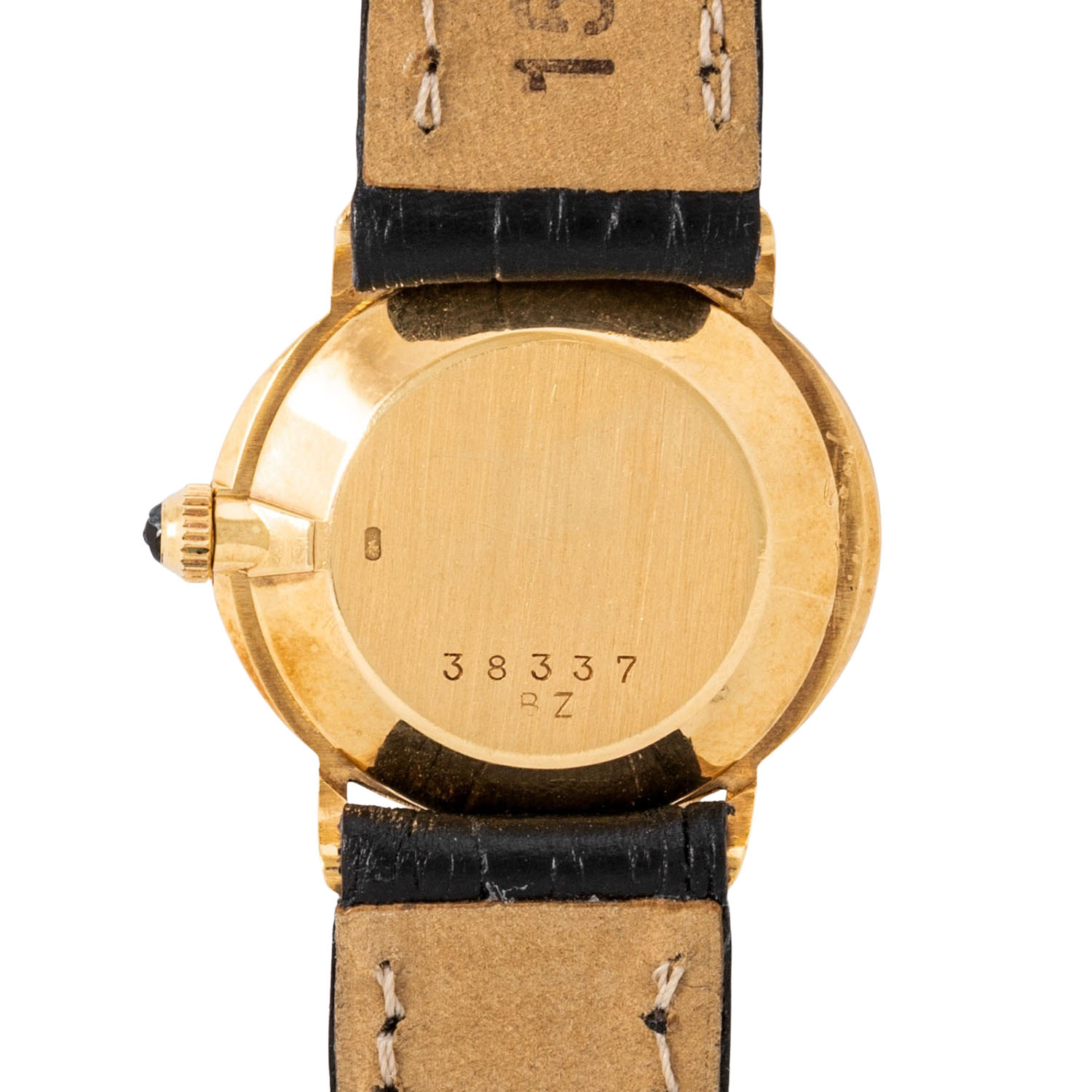 Gelbgold 18K. Handaufzugswerk Kal. 775 mit sehr guten Gangwerten (+7s/d. 259°). Schwarzes Zifferblatt mit Daufin Zeiger. Krone mit blauem Saphir Cabochon. Neues Lederband mit vergoldete Dornschließe. Guter Zustand mit Tragespuren. Durchmesser ca. 24,5 mm (gemessen ohne Krone).