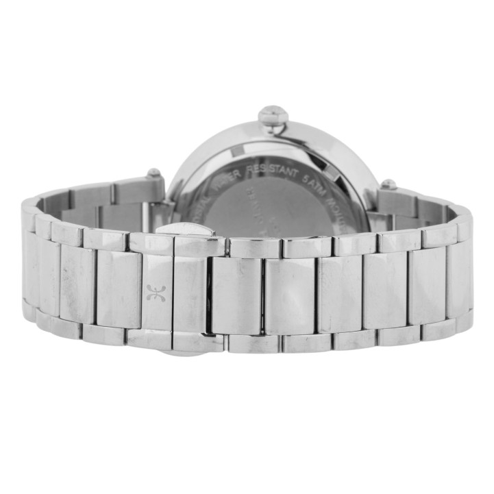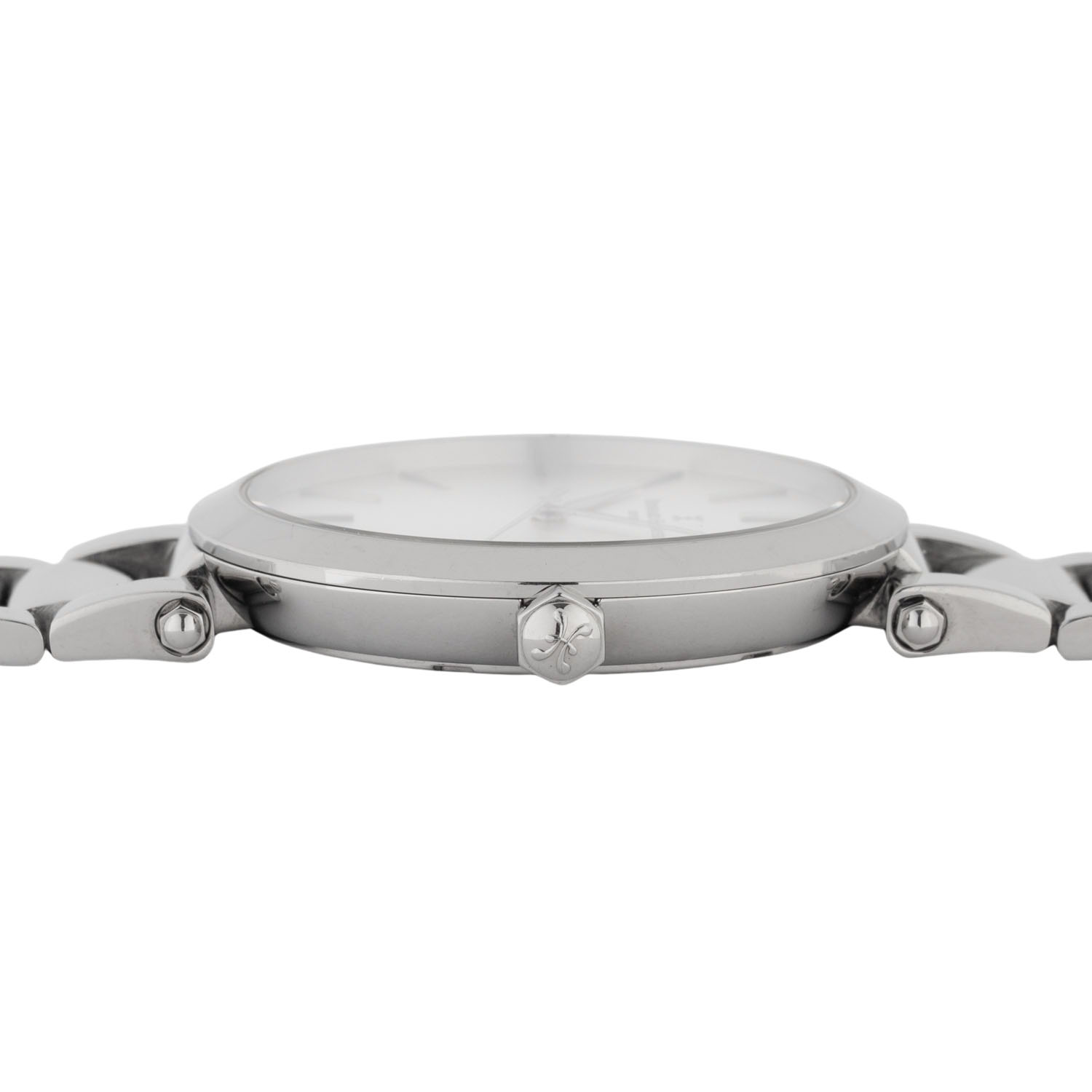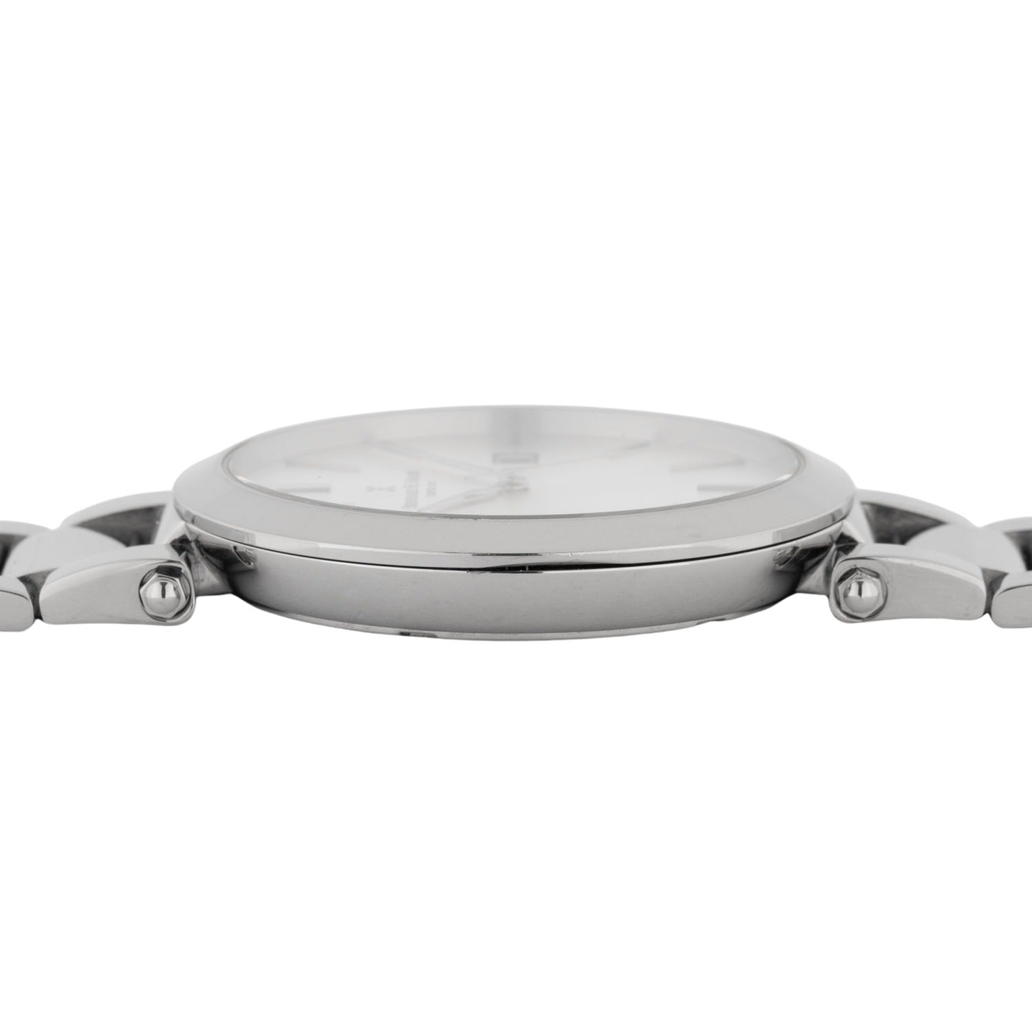 Edelstahl. Quarzwerk in funktionsfähigem Zustand. Neue Batterie. Silberfarbenes Zifferblatt mit Stabindizes und Datumsanzeige. Edelstahl Armband mit Faltschließe. Gebraucht, sichtbare Tragespuren am Gehäuse, Lünette und Armband. Durchmesser ca. 40 mm (gemessen ohne Krone). Passend bis zu ca. 18,5 cm Handgelenkumfang.