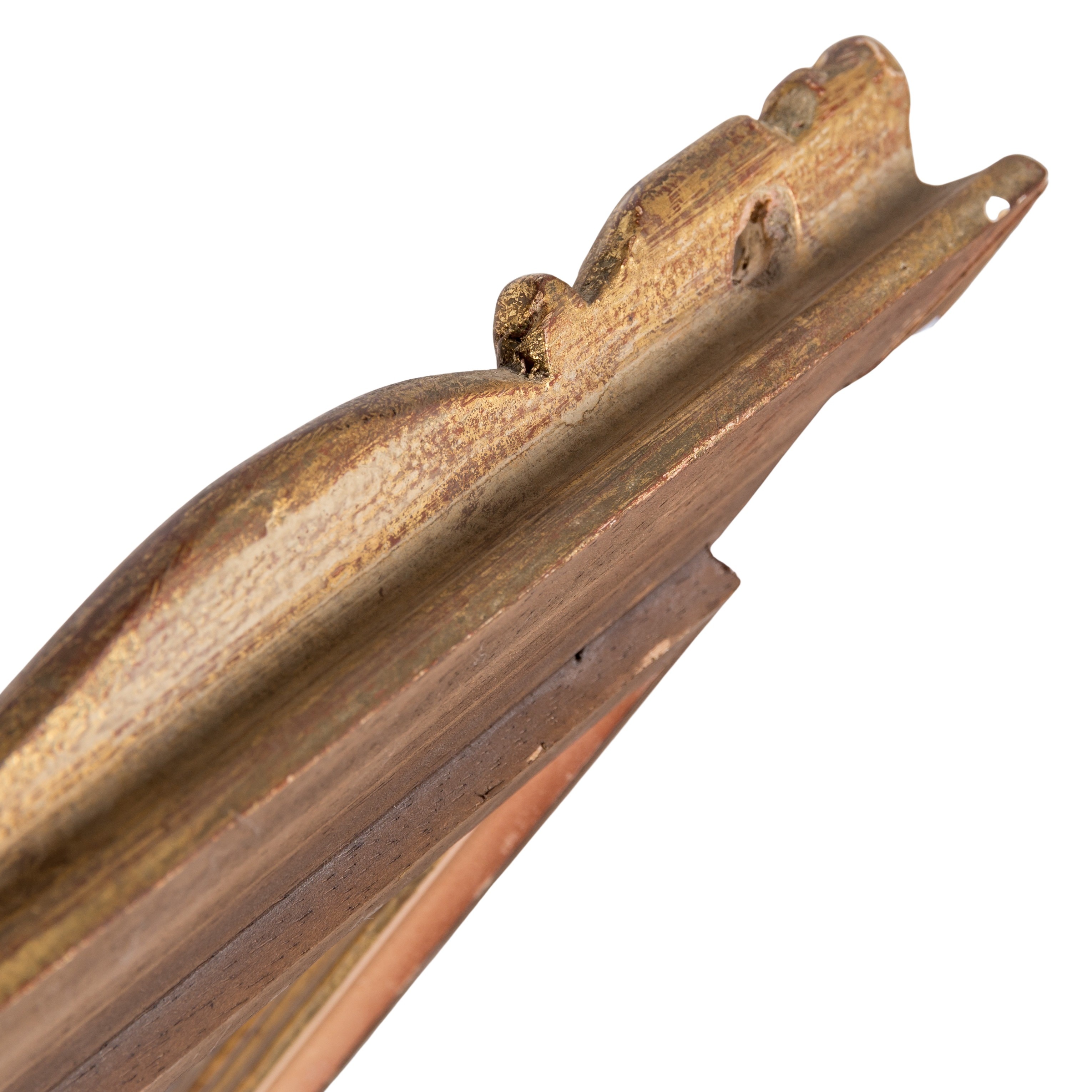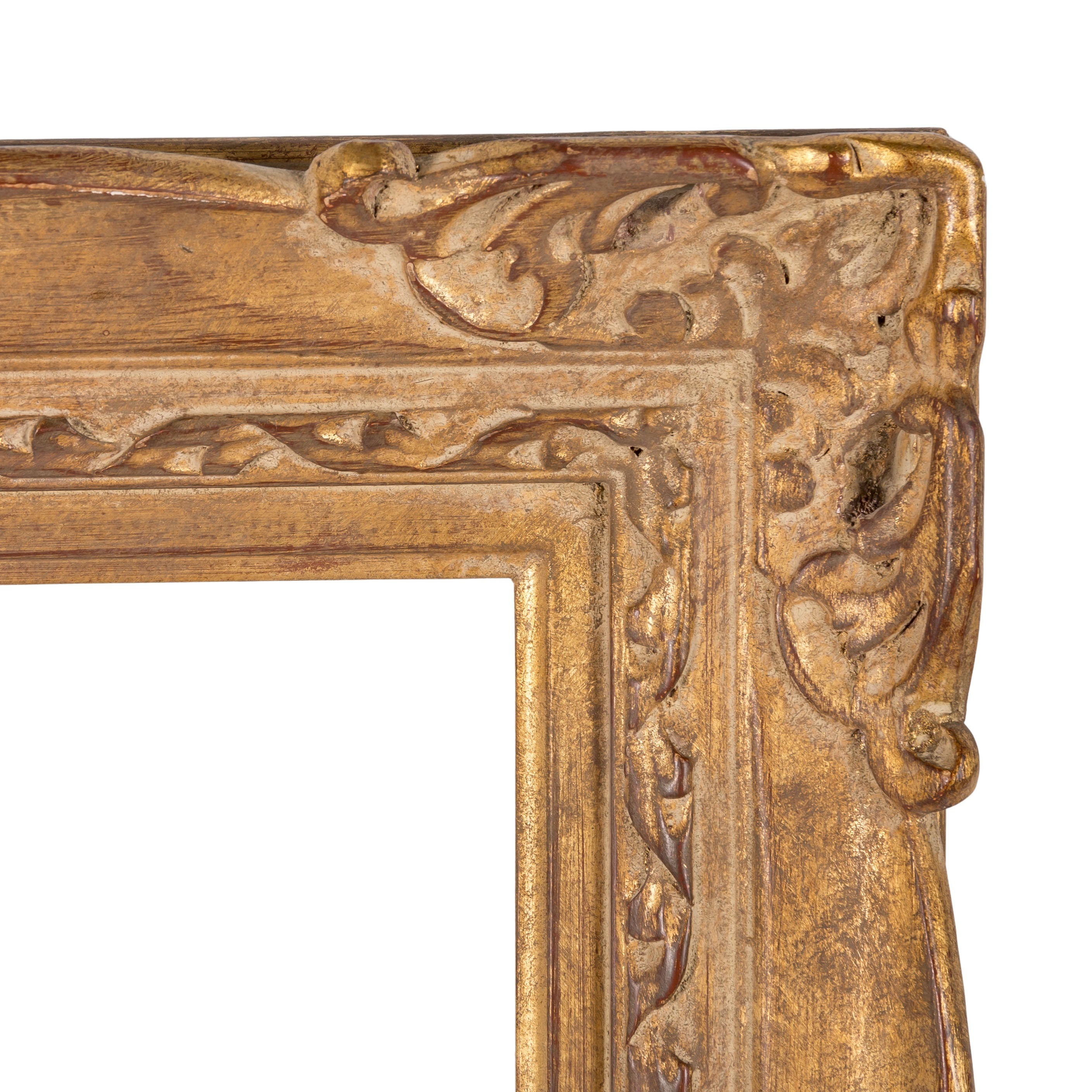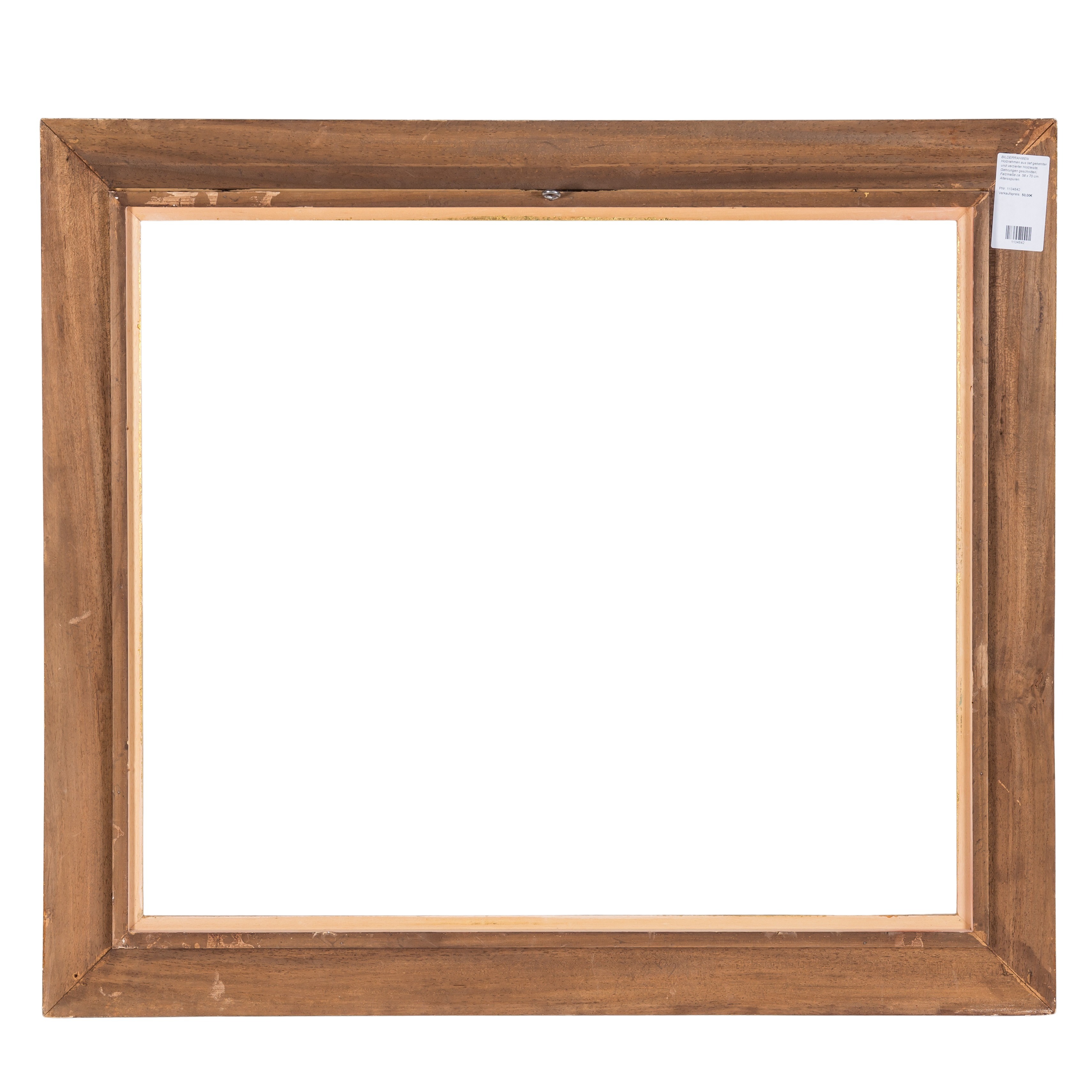 Holzrahmen aus tief gekehlter und verzierter Holzleiste, Gehrungen geschnitten, Falzmaße ca. 58 x 70 cm. Altersspuren.