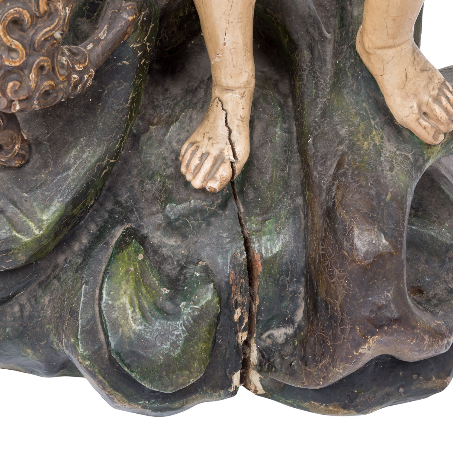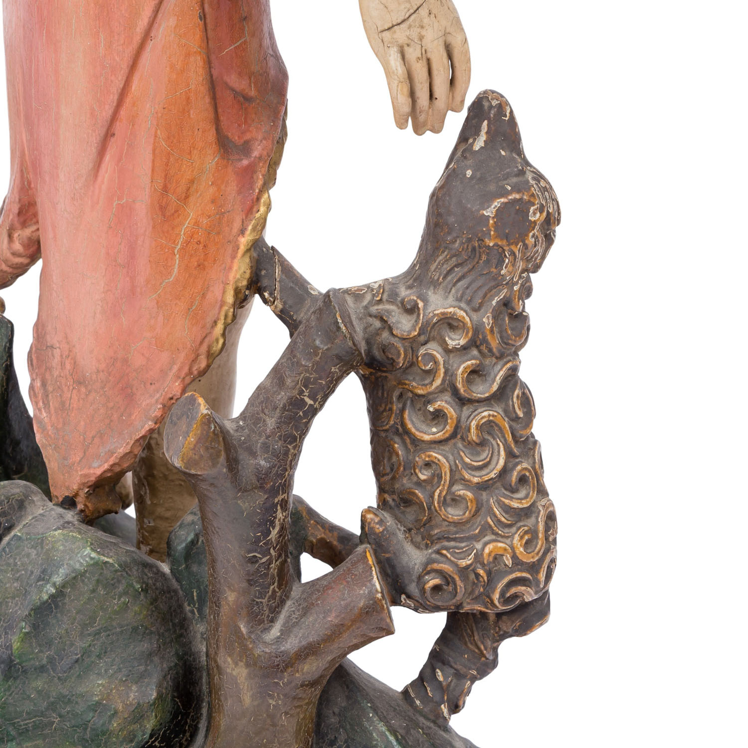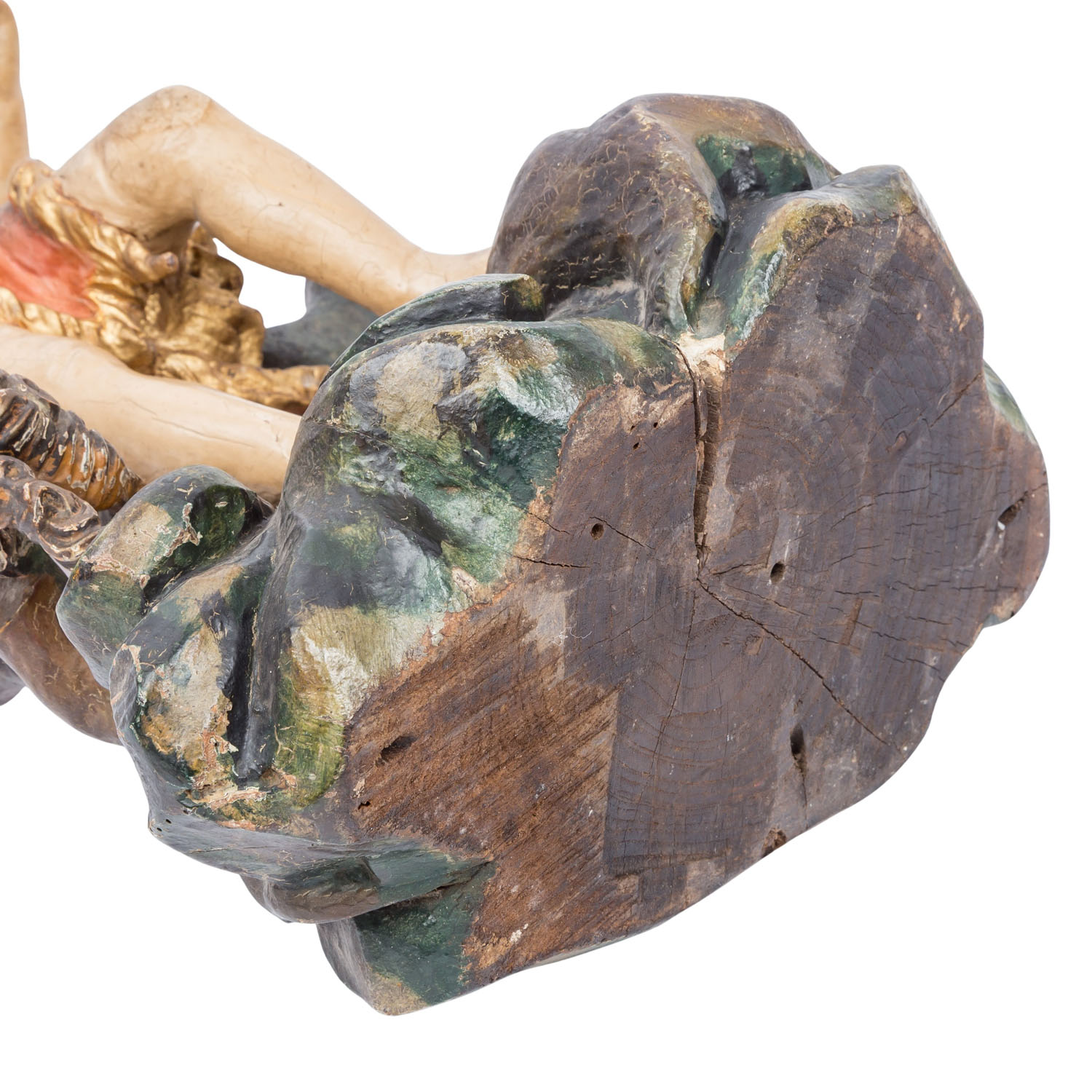 Holz, farbig gefasst, vollplastisch geschnitzte Figurengruppe auf Landschaftssockel, H: ca. 52 cm. Altersspuren und Trocknungsrisse, Fassung part. craqueliert und beschädigt, Fingerspitzen seiner linken Hand fehlend und kleine Fehlstelle am Auge.