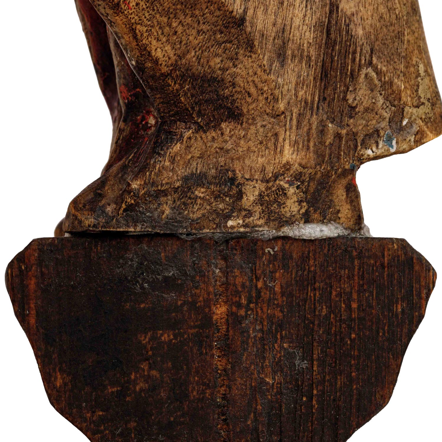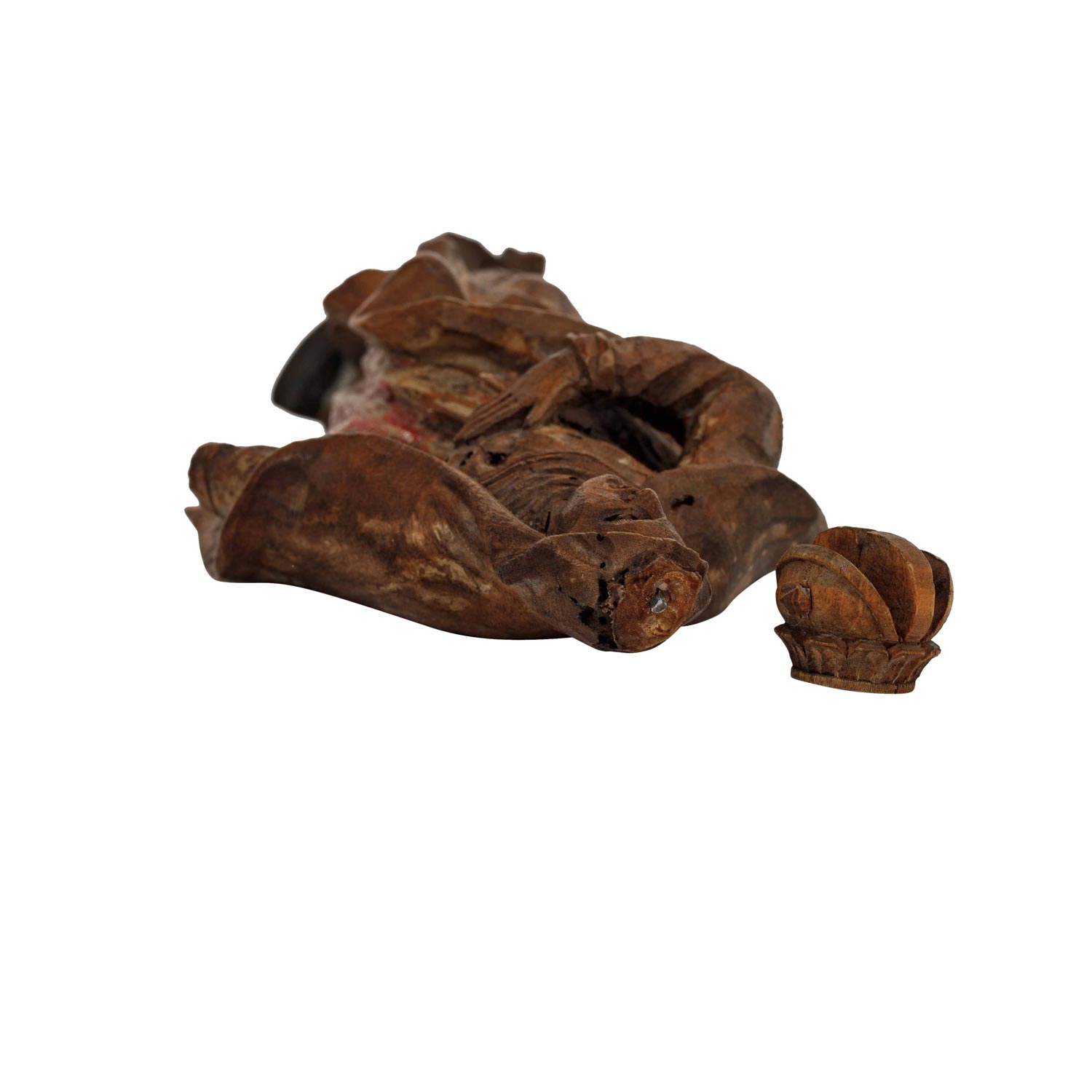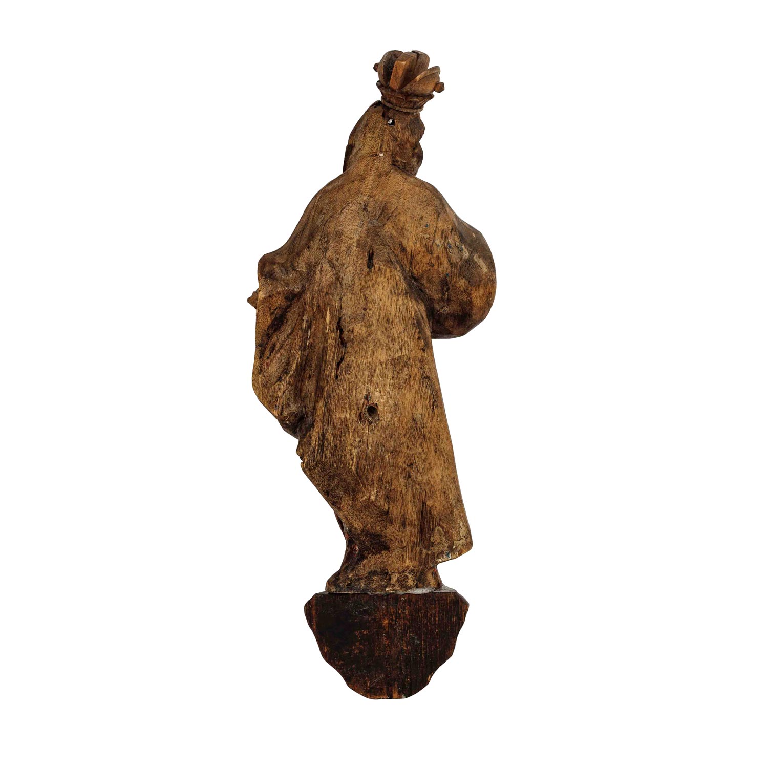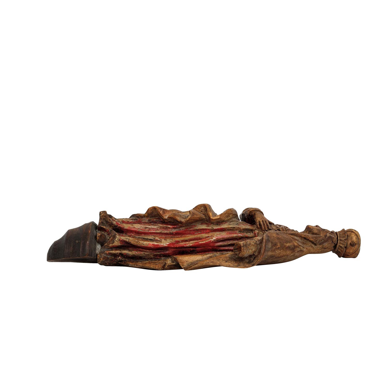 Lindenholz, Reste von farbiger Fassung, dreiviertelplastisch geschnitzte Figur in bewegtem Barockstil, auf Konsole montiert (ergänzt), H: Figur ca. 20, gesamt ca. 24,5 cm. Alters- und Wurmfraßspuren, eine Hand und Fußspitze fehlend, Fassung beschädigt.