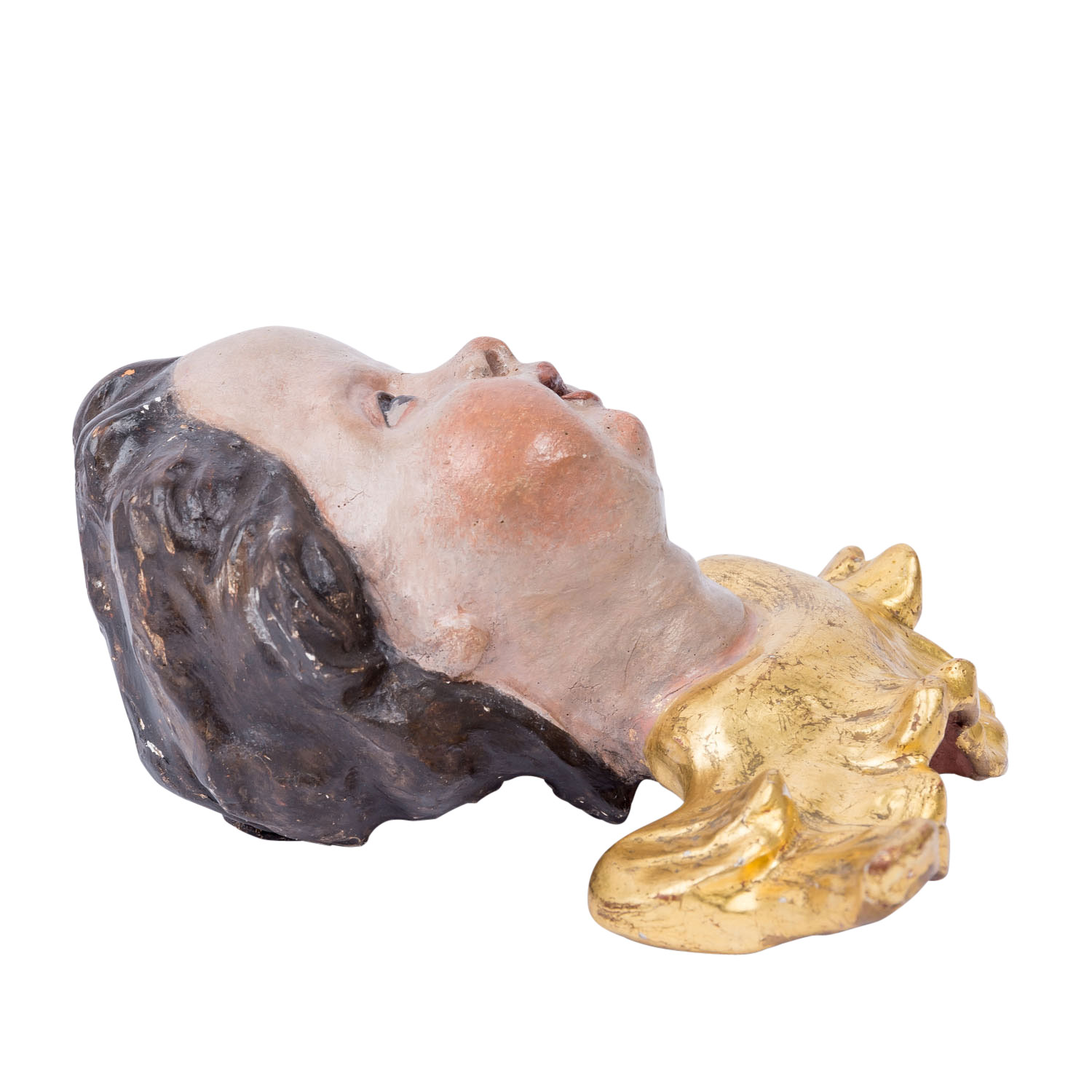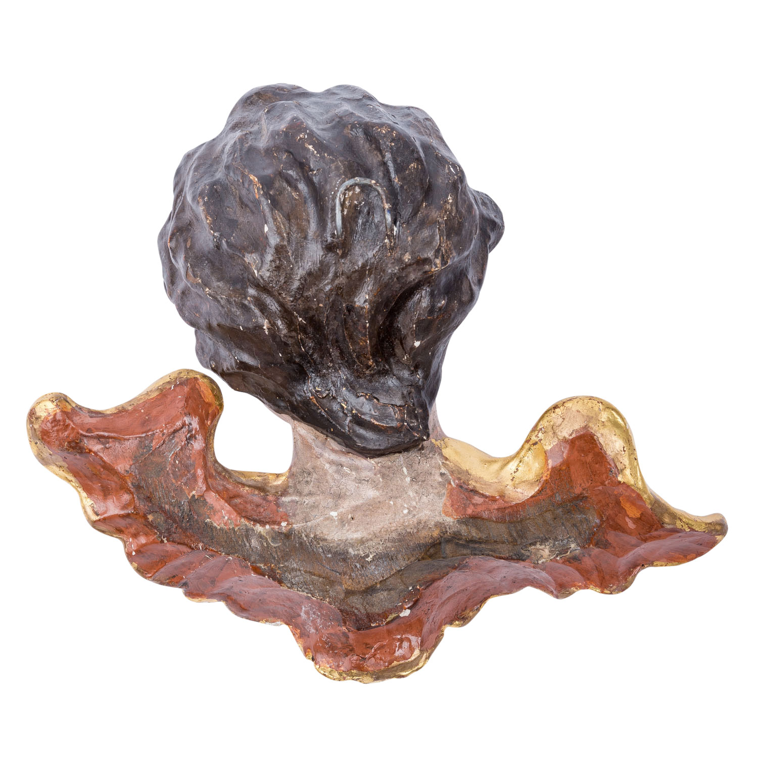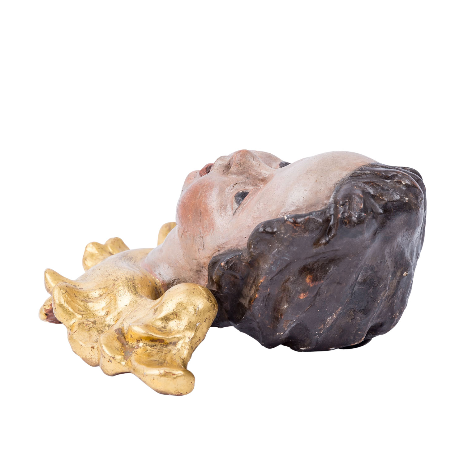 Holz, farbig gefasst und vergoldet, vollplastisch geschnitzter Kopf mit Flügeln, HxB: ca. 16x18 cm. Alters- und Beriebspuren, minim. Farbabplatzer.