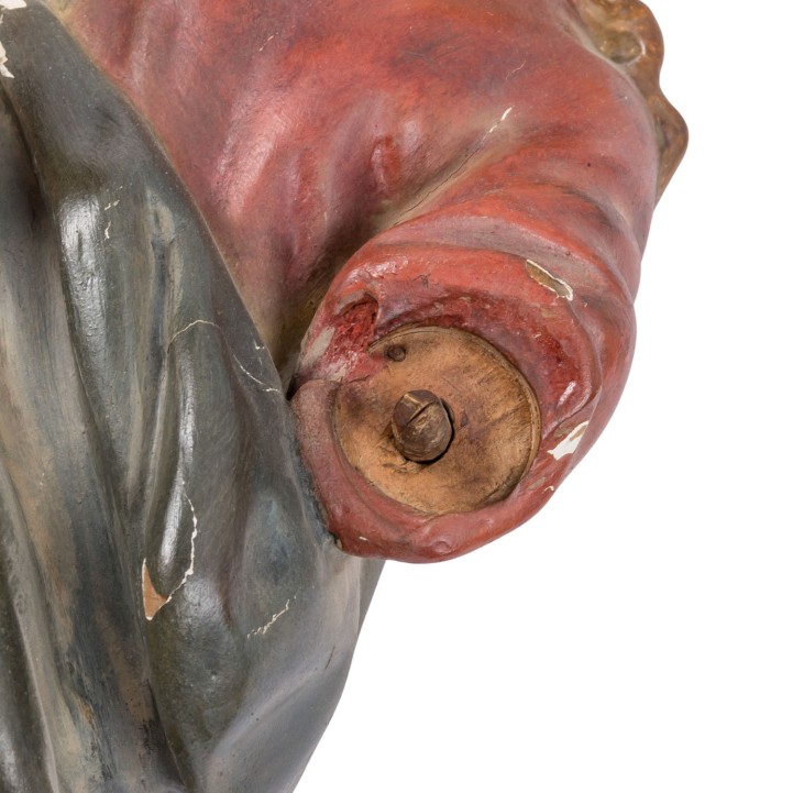 Halbplastische Holzskulptur, im roten Kleid mit blauem Mantel. H: ca. 70 cm. Linker Arm und Attribut fehlend, Konsole mit Abbrüchen.