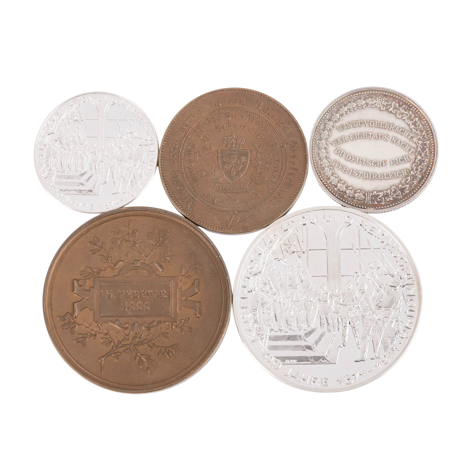 insgesamt 5 Medaillen zu Otto von Bismarck, Dt. Kaiserreich/ Preussen bis Moderne, davon 3 in Silber, u.a. „Sterbegedenkthaler“ sowie zwei moderne Nachprägungen „100 Jahre Kaiserproklamation 1871–1971“ (15 g und 50 g Feinsilber) nach dem Gemälde von Anton v. Werner; dazu 2 Bronzemedaillen: eine zur 50-jährigen Dienstfeier und zum 70. Geburtstag Bismarcks, eine mit dem Zitat „Wir Deutschen fürchten Gott, aber sonst nichts in der Welt“ (Rede vom 9. Februar 1888). Erhalt verschieden.