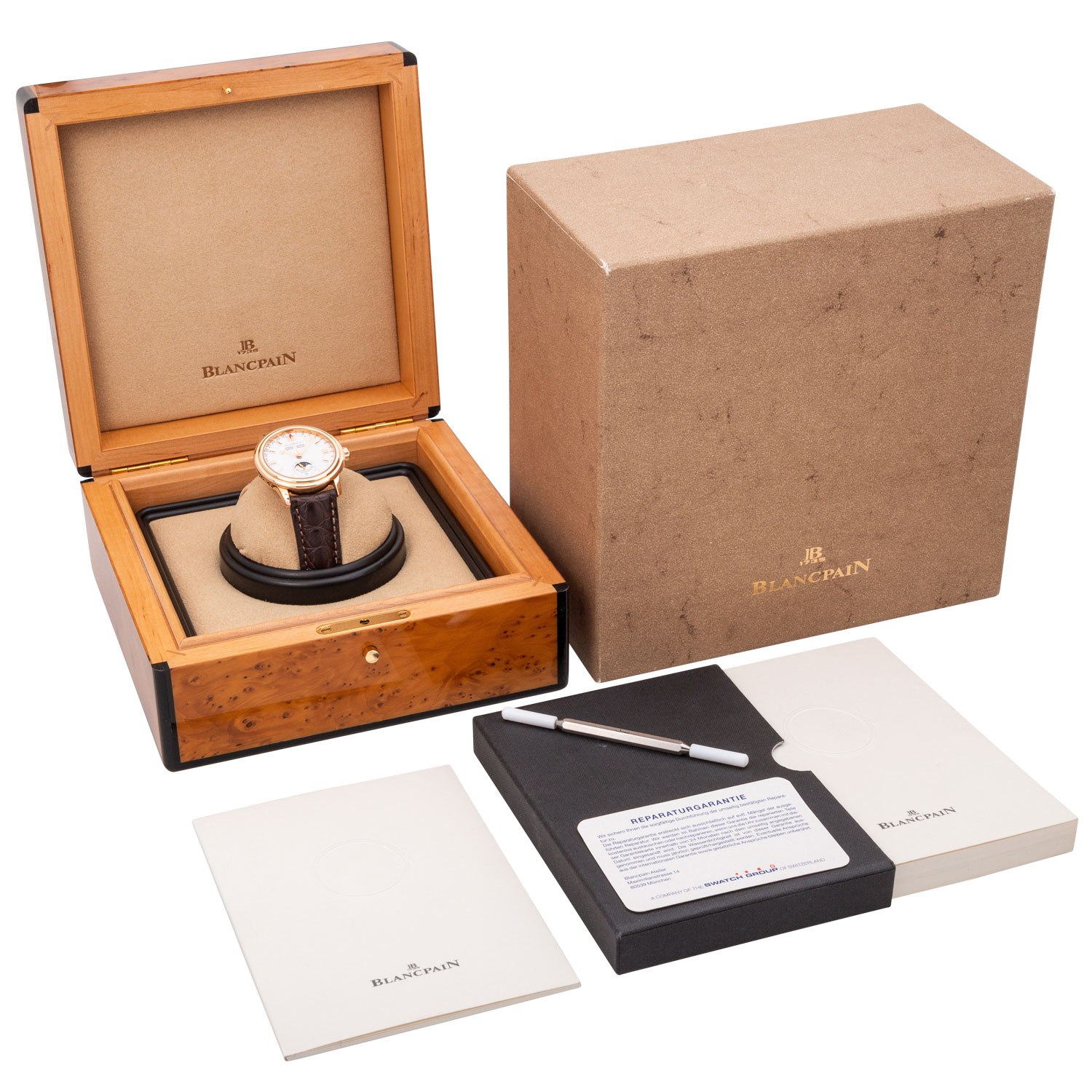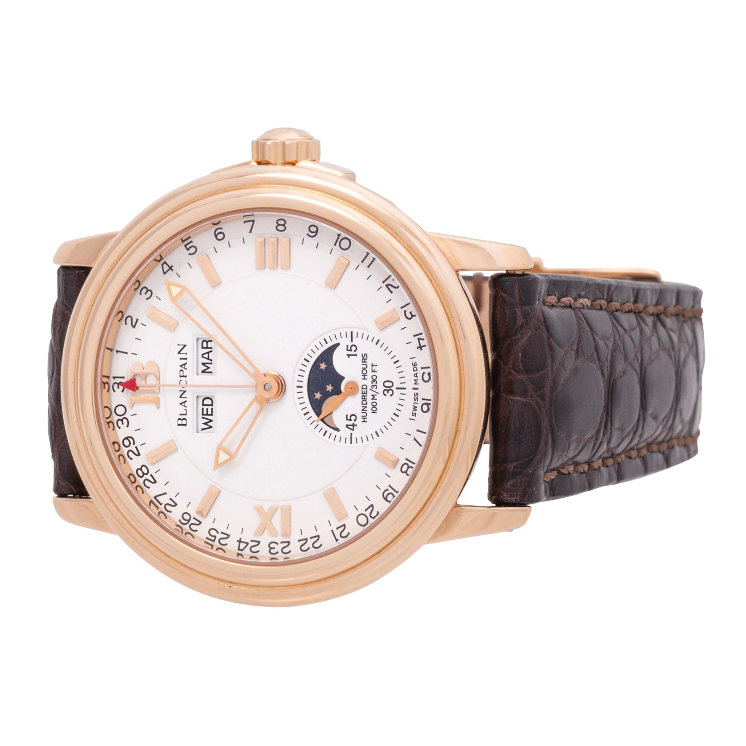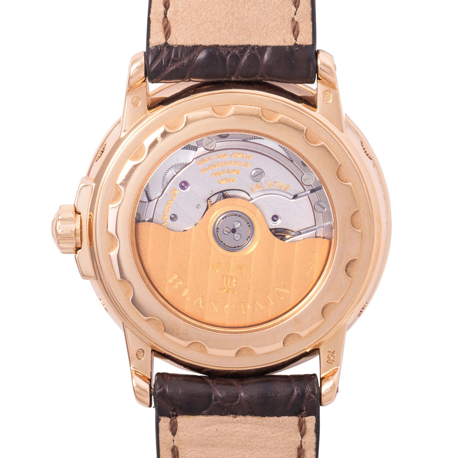 Herren Armbanduhr. Erstkauf 15.11.2002 bei Juwelier Scheibel in Berlin. Roségold 18K mit Saphirglasboden. Automatik-Werk Blancpain Kal. 6763. Sehr gute Gangwerte (+4 Sek., 283°). Zifferblatt mit goldenen Indizes. Wochentag, Datums- und Monatsanzeige sowie Mondphaseanzeige mit kleiner Sekunde bei 6 Uhr. Neues Lederarmband mit original Dornschließe in 18K Roségold. Sehr guter Zustand, minimale Gebrauchsspuren am Gehäuse und an der Schließe. Original Box mit Umkarton, Anleitung, Garantiezertifkat, Stellstift mit Schraubendreher, Revisionsbeleg von 2010, Uhrenpass und Kaufrechnung vom 14.07.2009 vom Kauf bei Juwelier Häffner in Stuttgart anbei. Durchmesser ca. 38 mm ohne Krone.