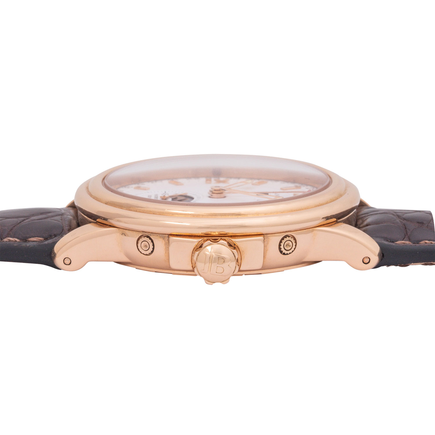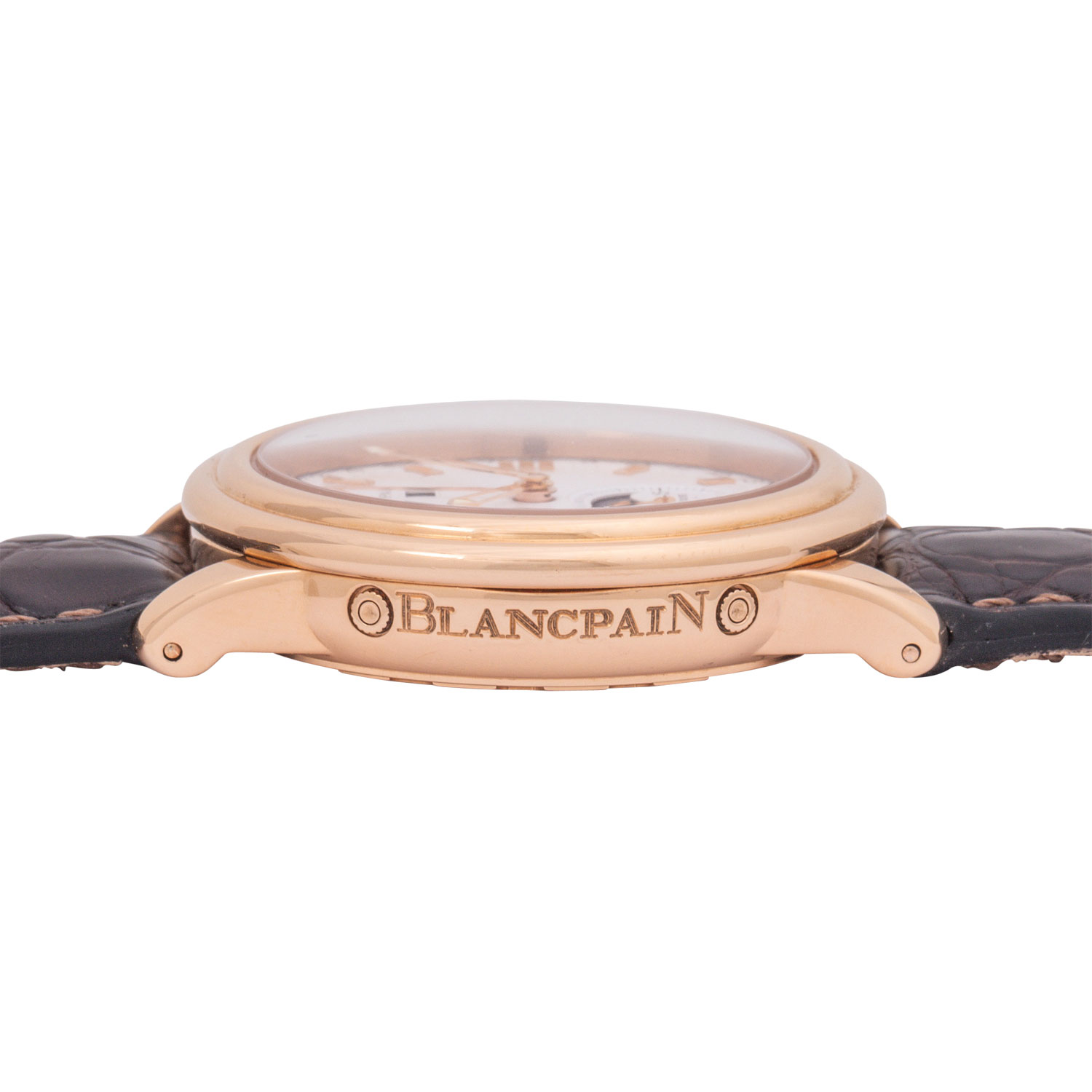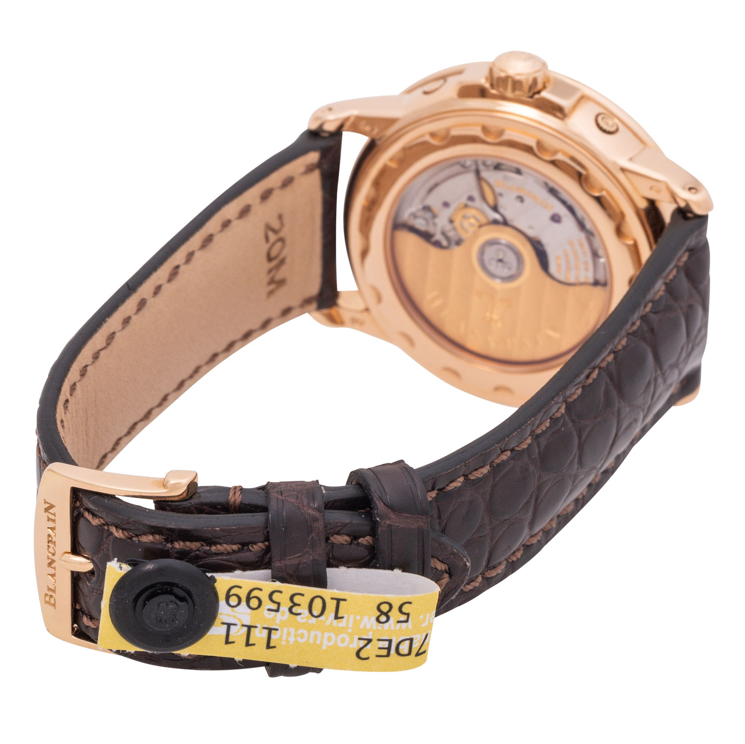 Herren Armbanduhr. Erstkauf 15.11.2002 bei Juwelier Scheibel in Berlin. Roségold 18K mit Saphirglasboden. Automatik-Werk Blancpain Kal. 6763. Sehr gute Gangwerte (+4 Sek., 283°). Zifferblatt mit goldenen Indizes. Wochentag, Datums- und Monatsanzeige sowie Mondphaseanzeige mit kleiner Sekunde bei 6 Uhr. Neues Lederarmband mit original Dornschließe in 18K Roségold. Sehr guter Zustand, minimale Gebrauchsspuren am Gehäuse und an der Schließe. Original Box mit Umkarton, Anleitung, Garantiezertifkat, Stellstift mit Schraubendreher, Revisionsbeleg von 2010, Uhrenpass und Kaufrechnung vom 14.07.2009 vom Kauf bei Juwelier Häffner in Stuttgart anbei. Durchmesser ca. 38 mm ohne Krone.