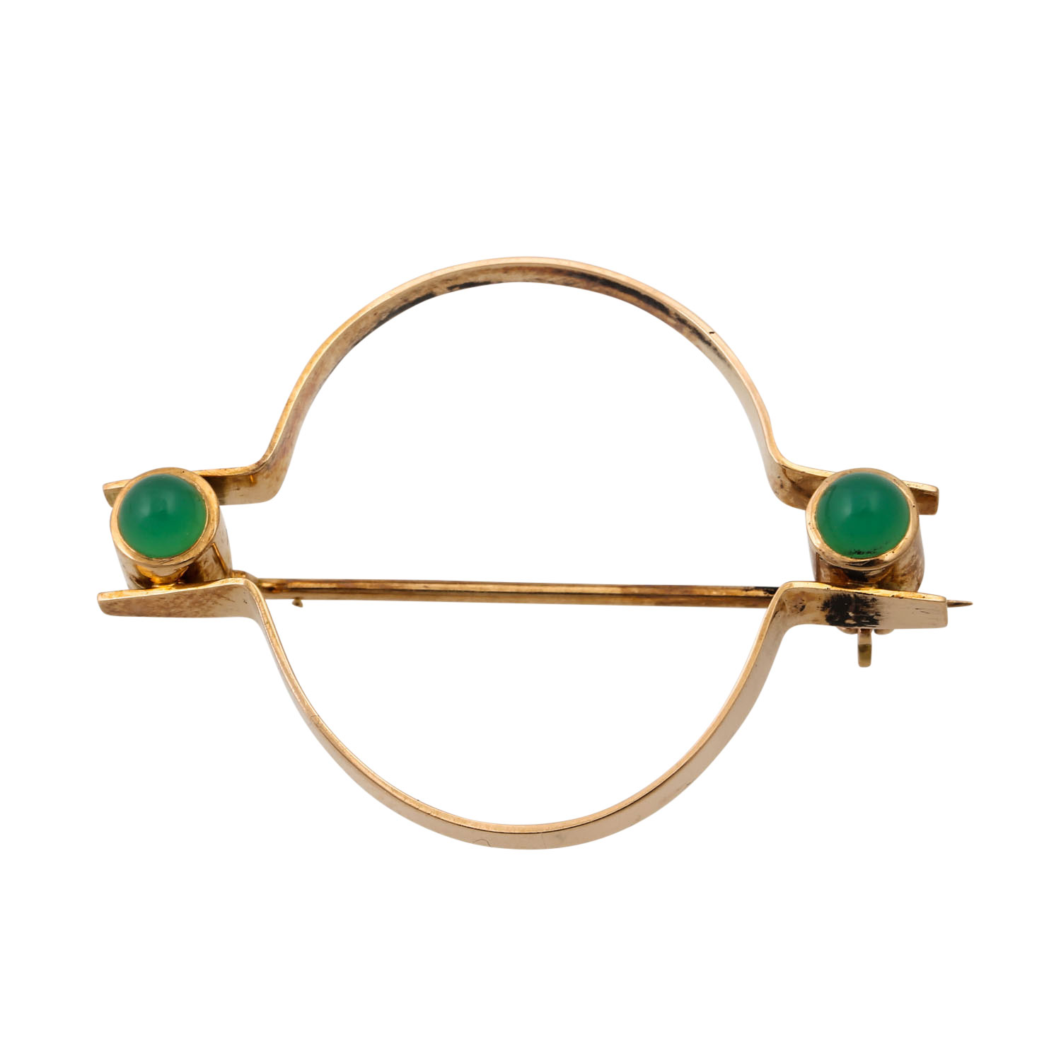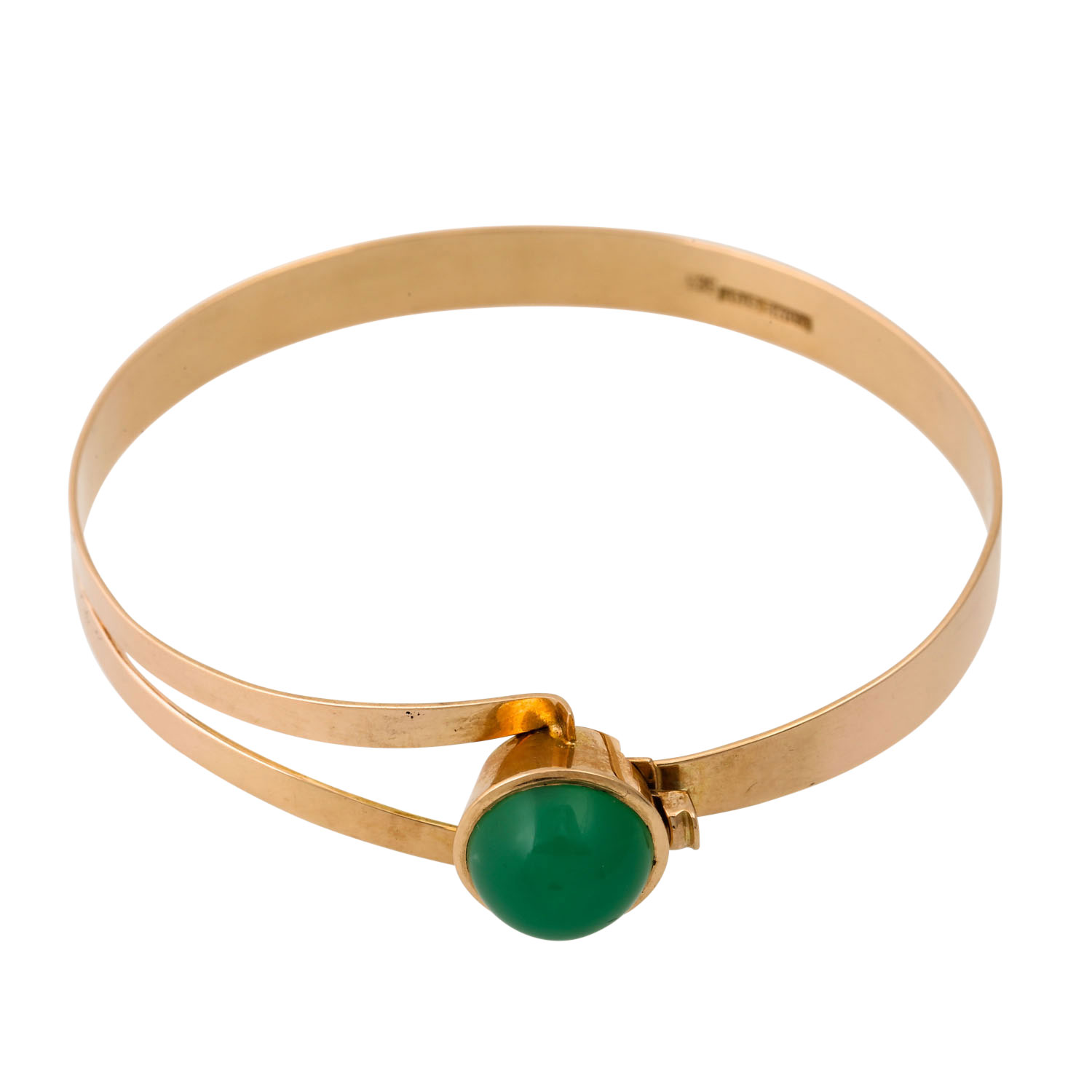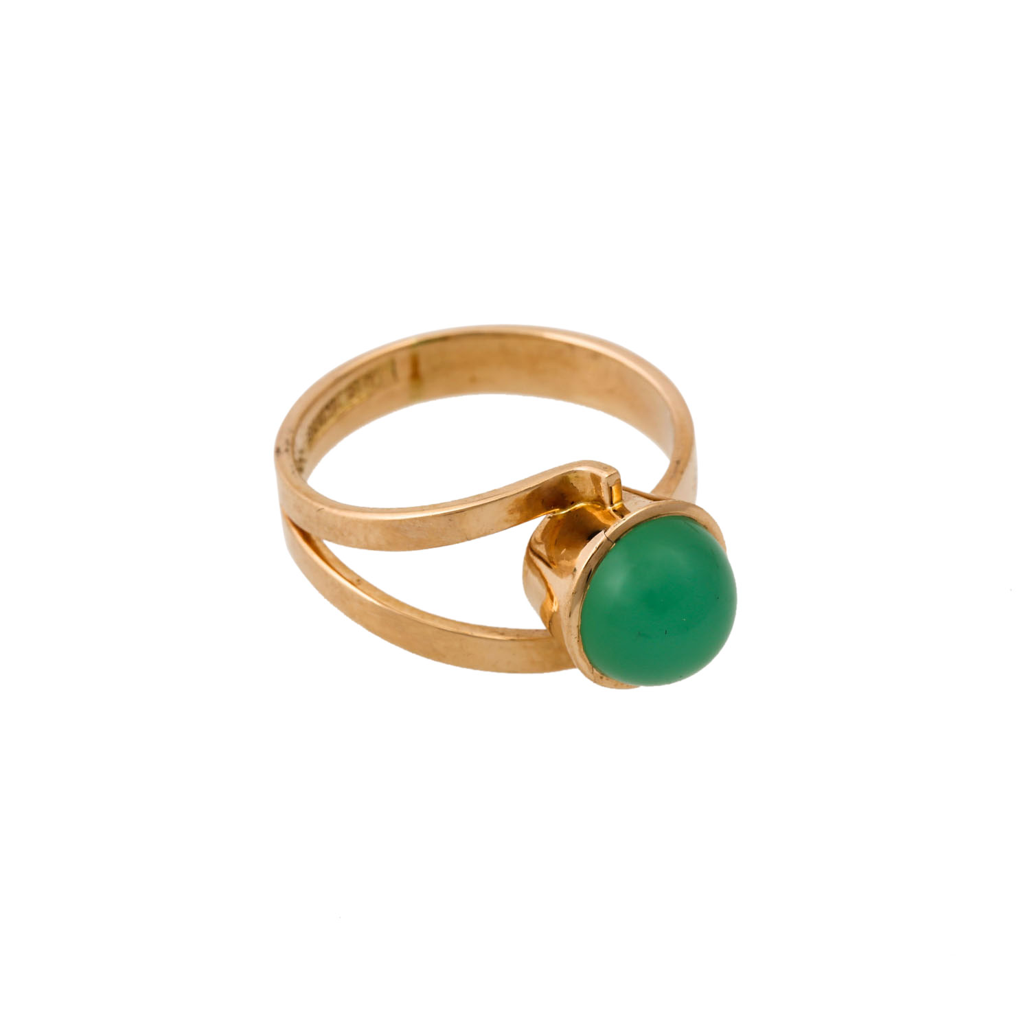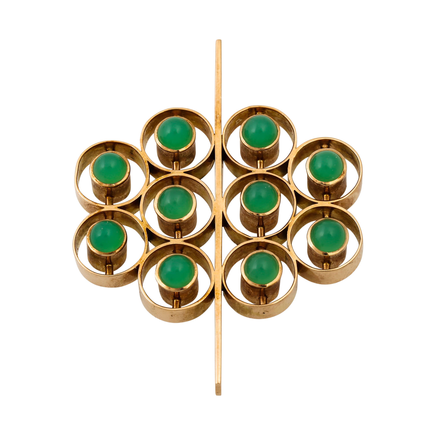 best. aus Armspange (ca. 17 cm), Anhänger (4,5 cm), Brosche (ca. 3,5 cm), Ring (Weite 53), RsG 14K, 30,4 gr, 2. H. 20. Jh., minimale Tragespuren, sig. 'Blume Stgt.'