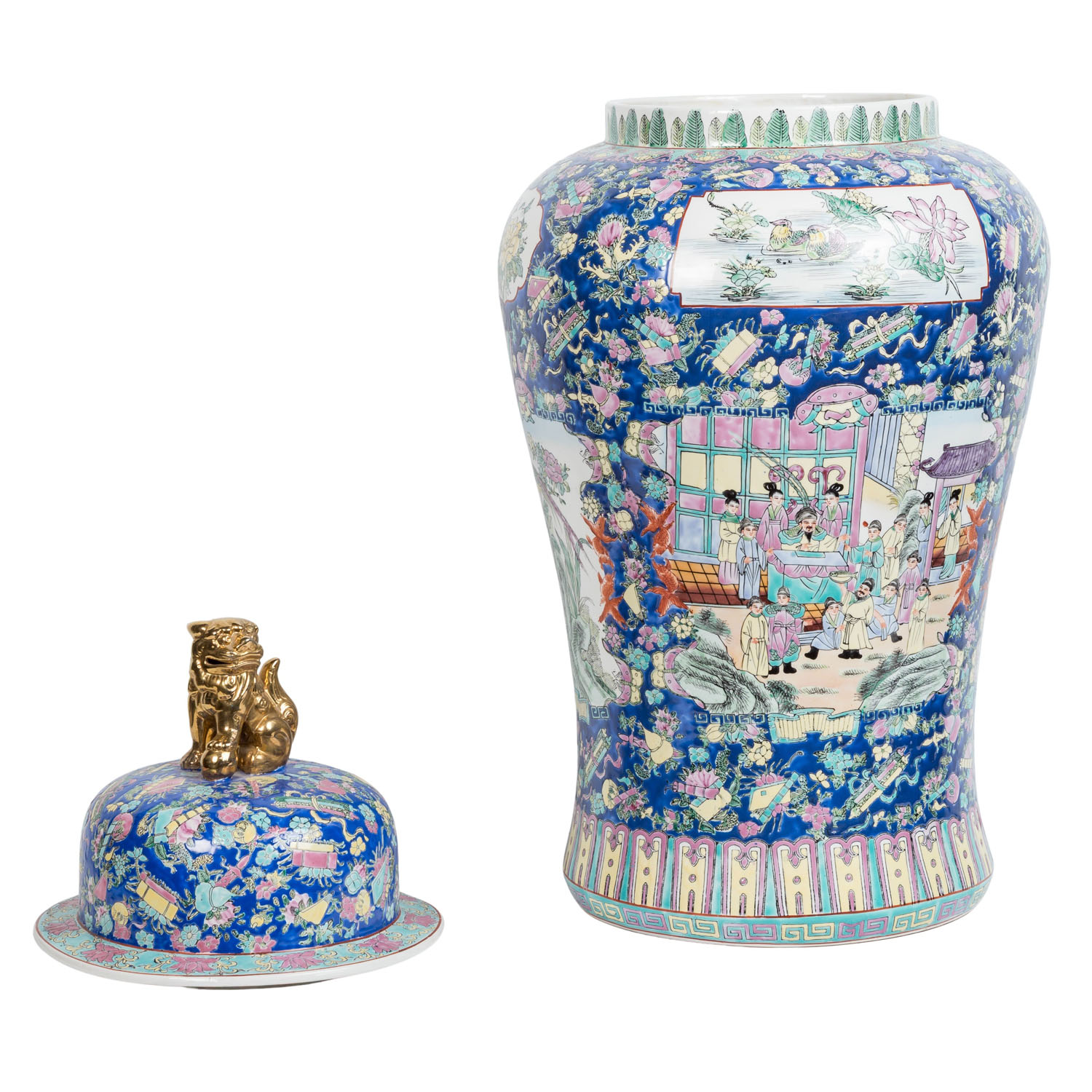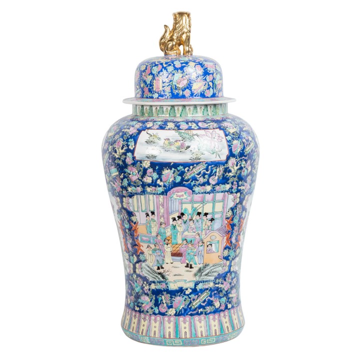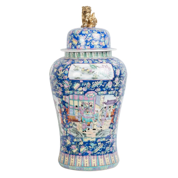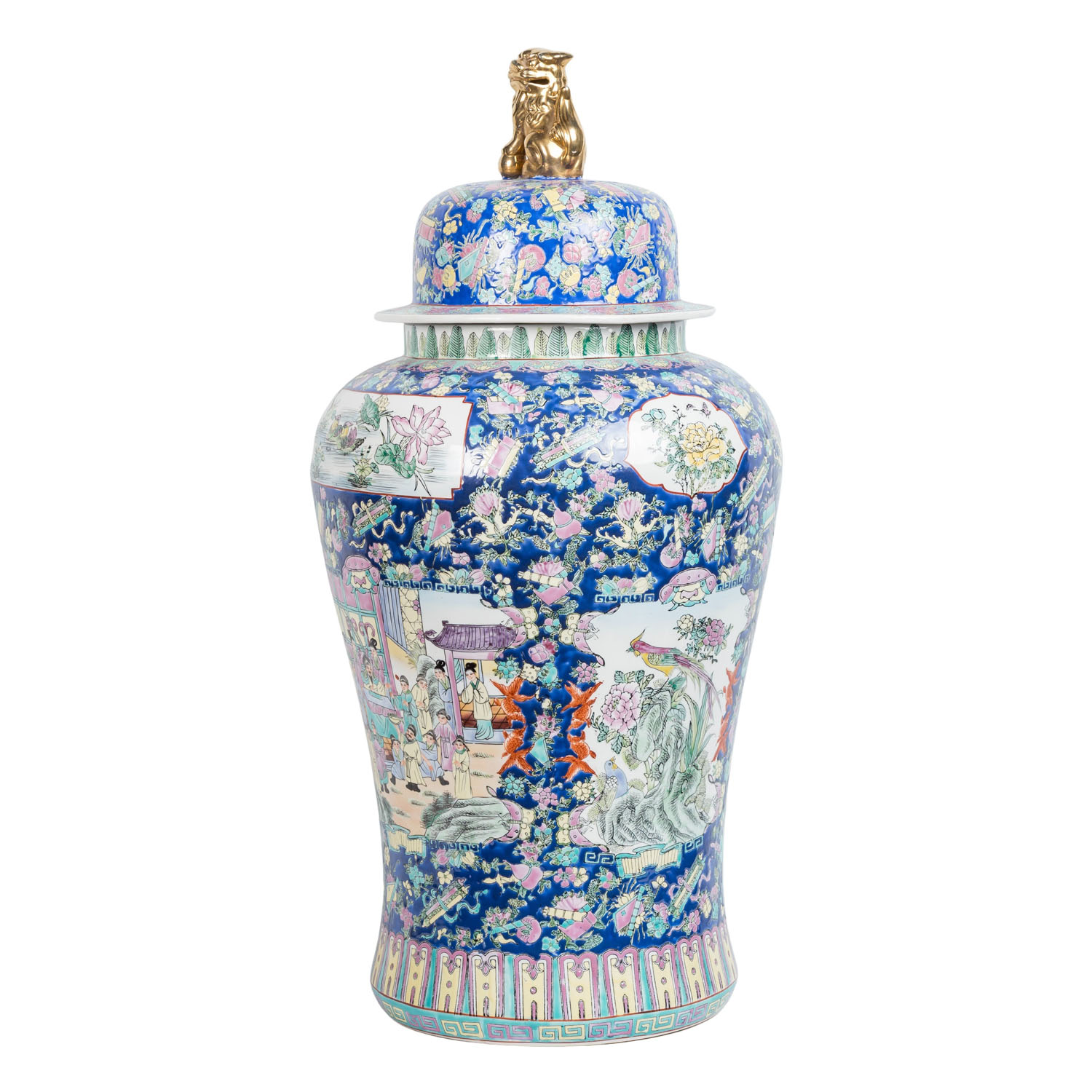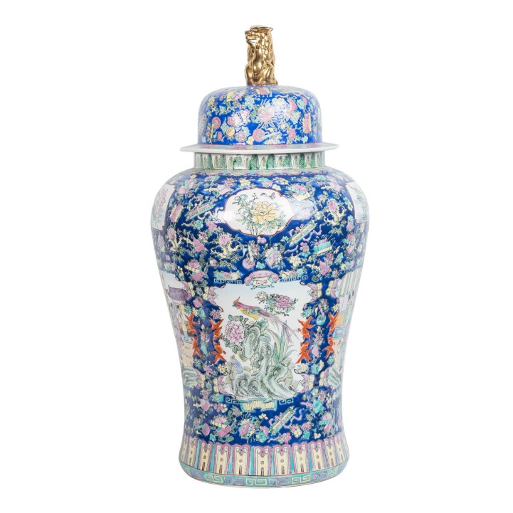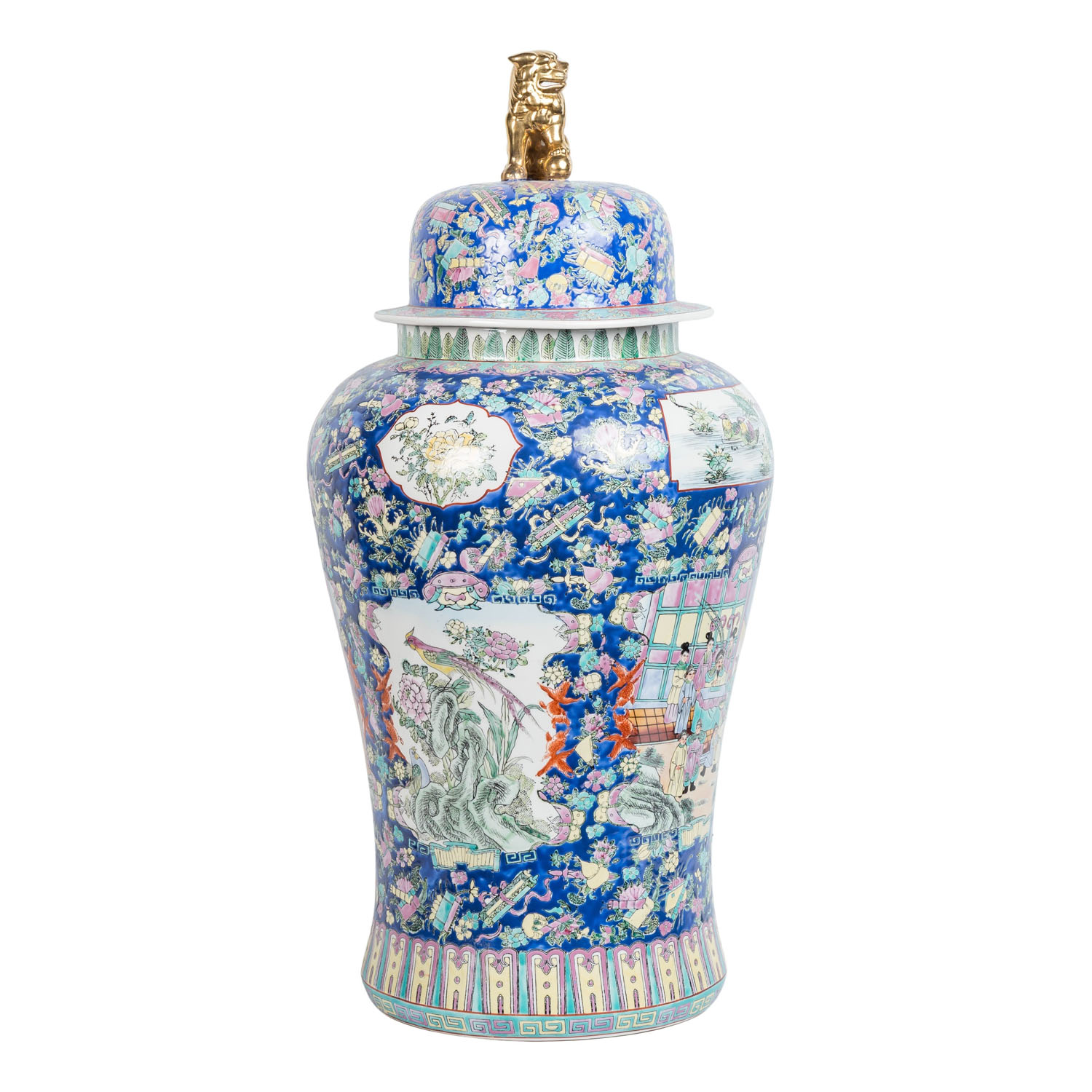 Deckelvase aus Porzellan im Famille rose-Stil bemalt, Deckelbekrönung in Form eines vollplastischen, vergoldeten Wächterlöwen. Der königsblaue Fond, der mit chinesischen Symbolen und Emblemen durchgemustert ist, zeigt verschieden große Kartuschen, die mit figürlichen Szenen, mit Tieren oder mit Blüten verziert sind. Höhe 85 cm.