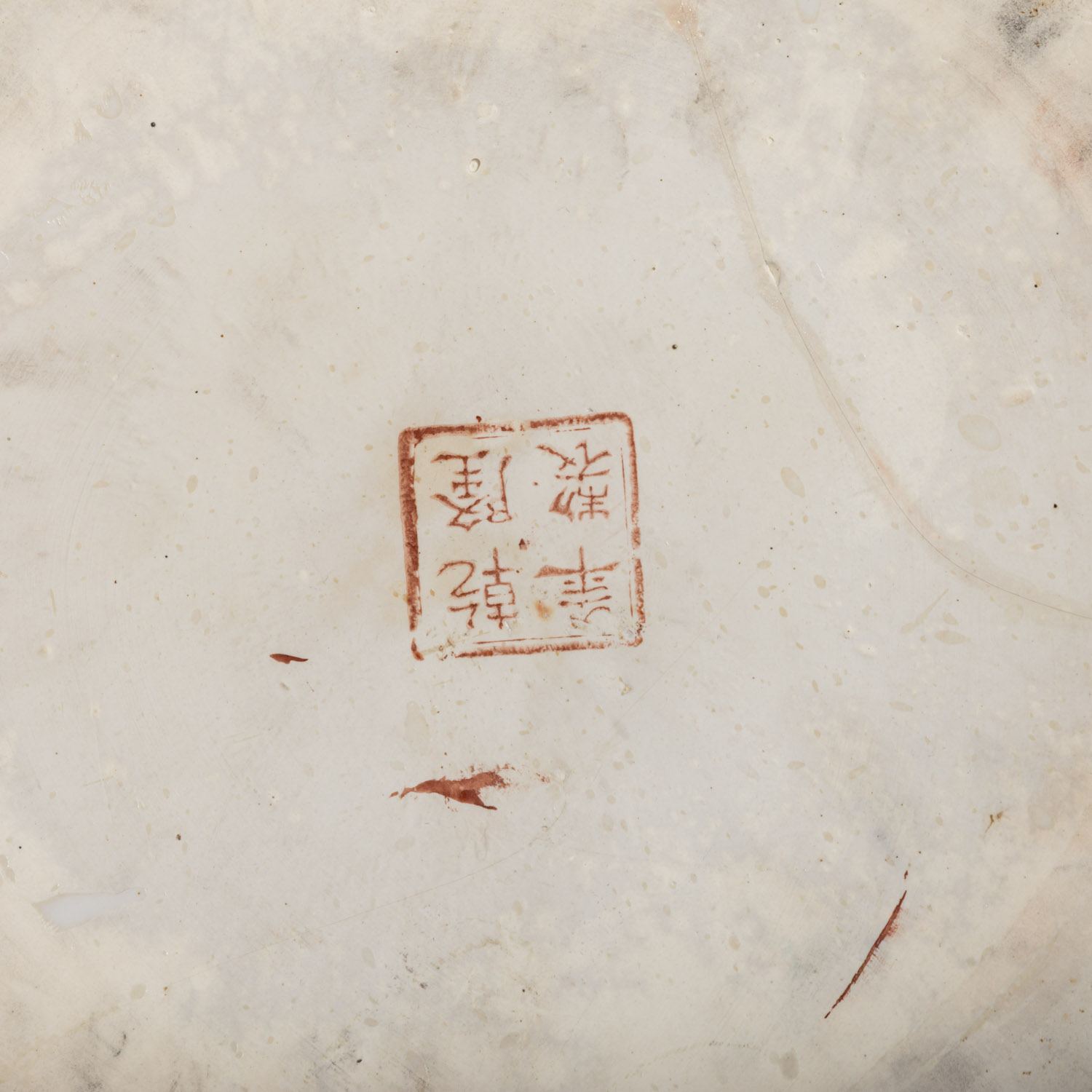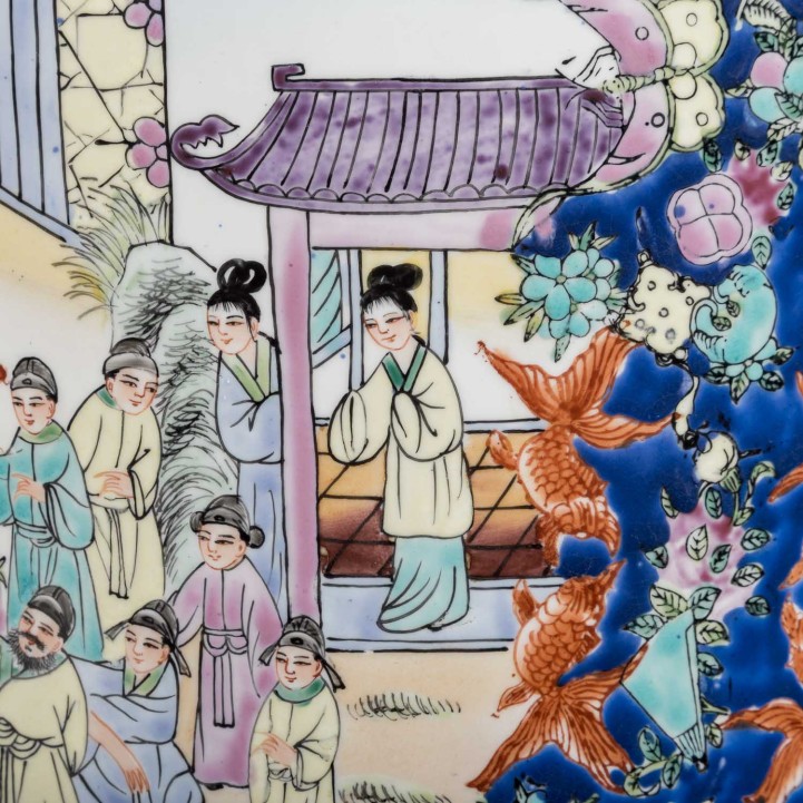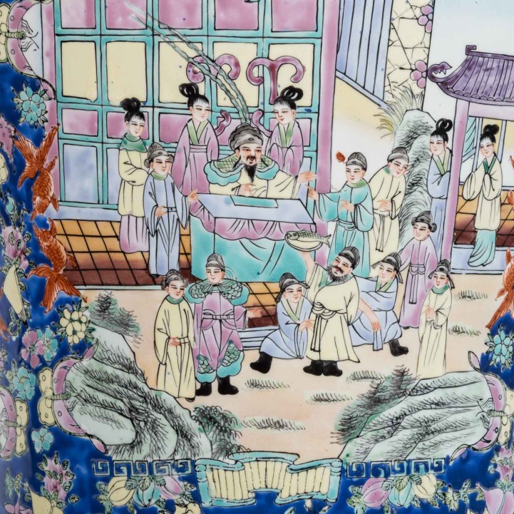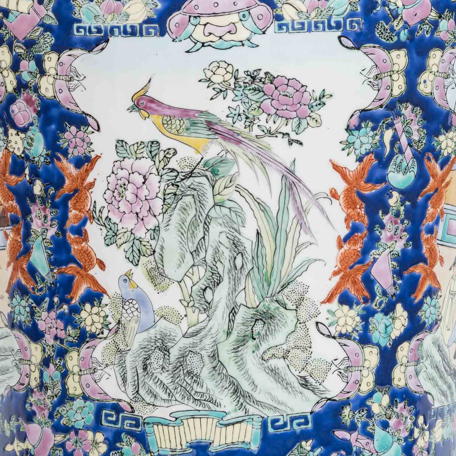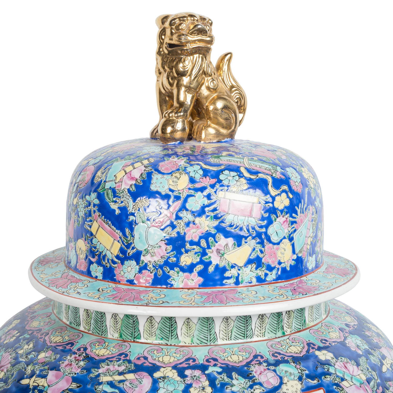 Deckelvase aus Porzellan im Famille rose-Stil bemalt, Deckelbekrönung in Form eines vollplastischen, vergoldeten Wächterlöwen. Der königsblaue Fond, der mit chinesischen Symbolen und Emblemen durchgemustert ist, zeigt verschieden große Kartuschen, die mit figürlichen Szenen, mit Tieren oder mit Blüten verziert sind. Höhe 85 cm.