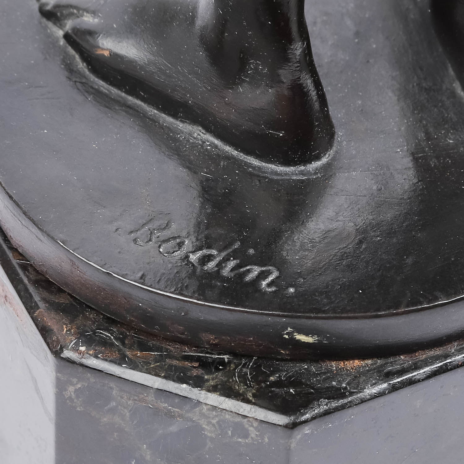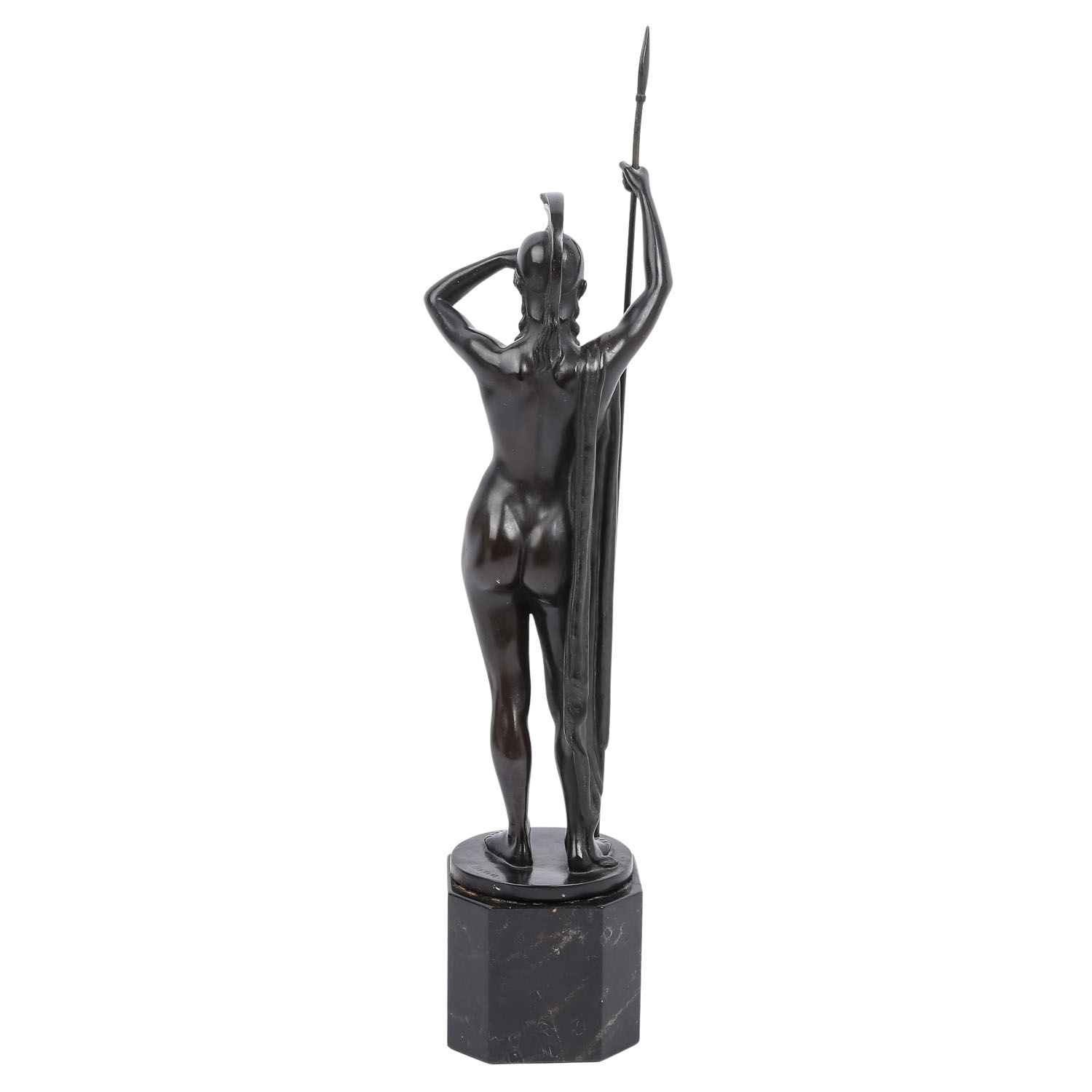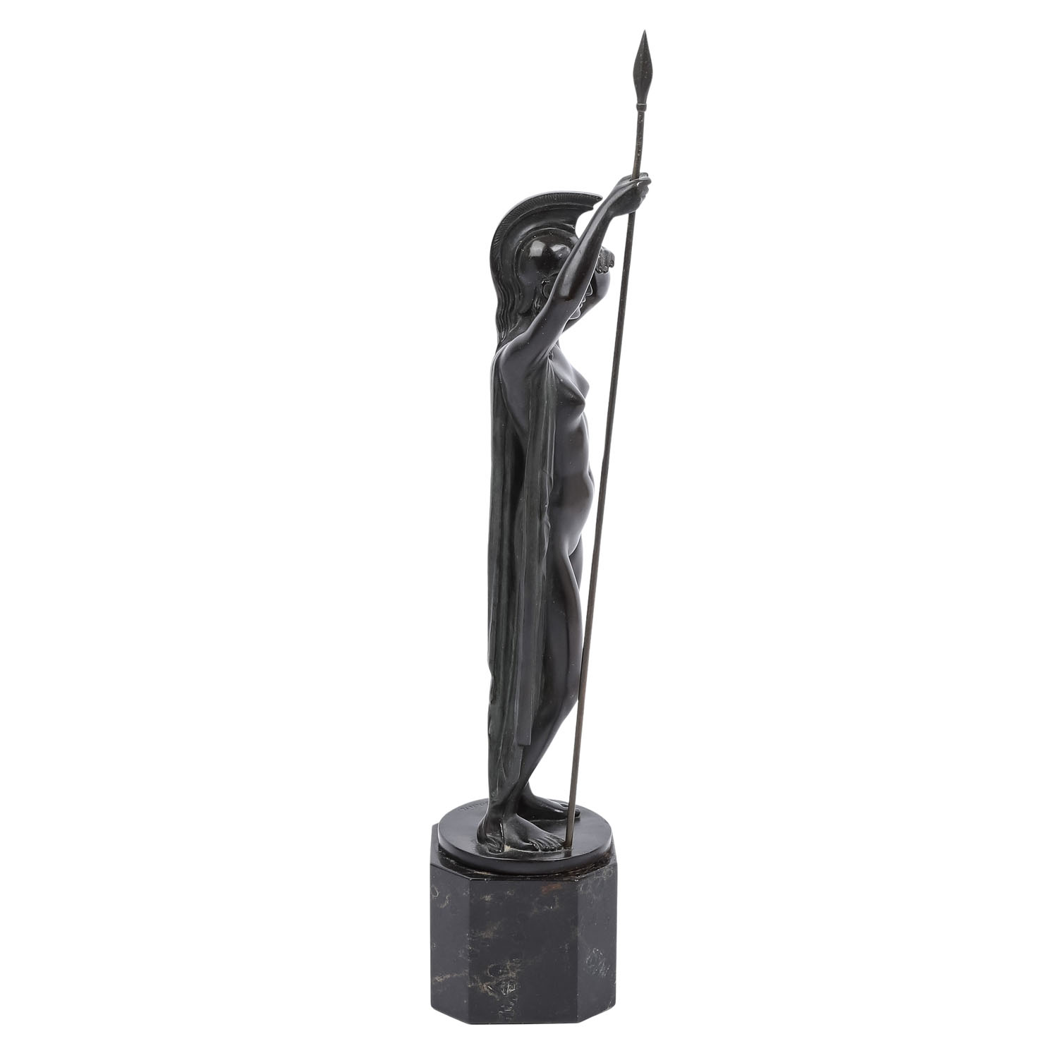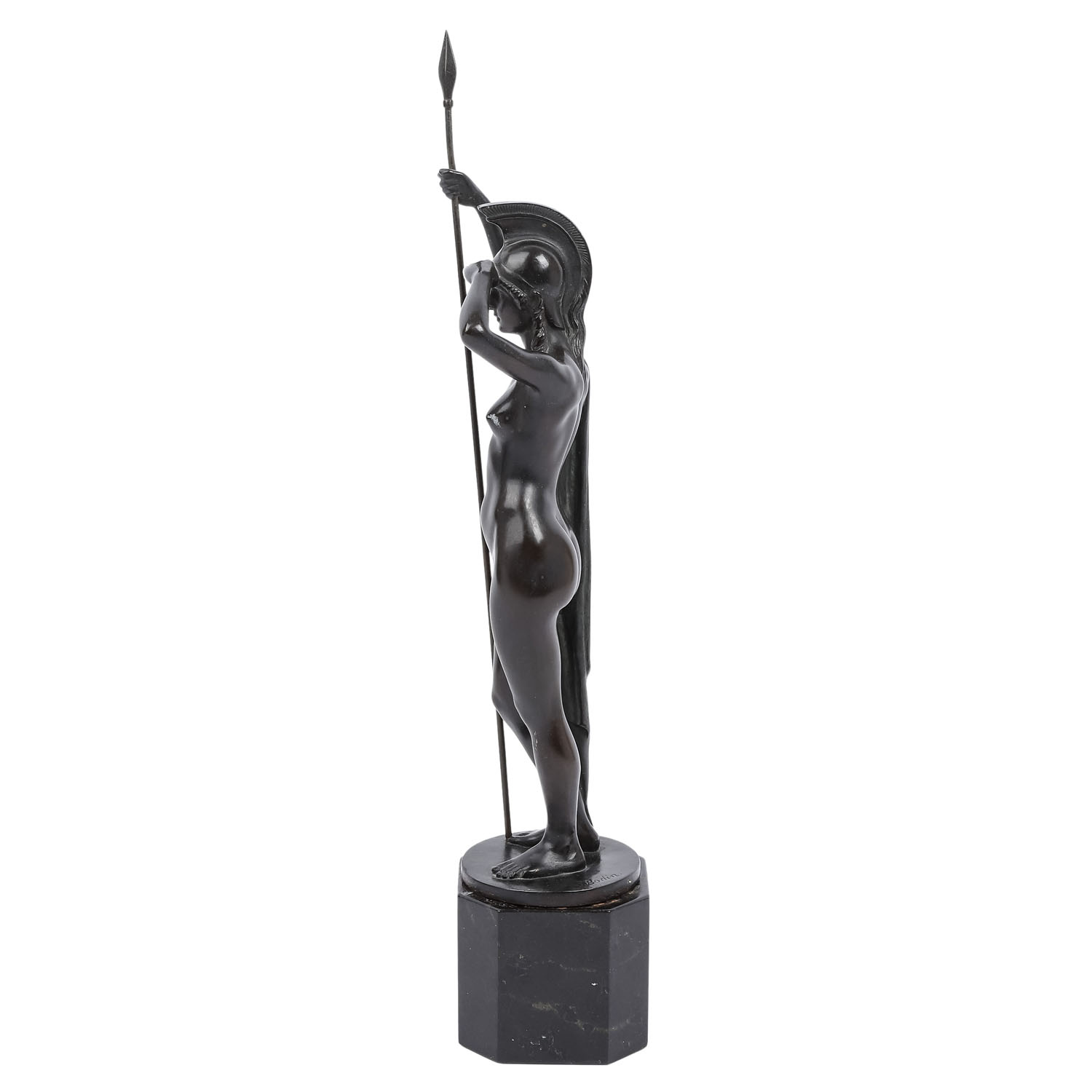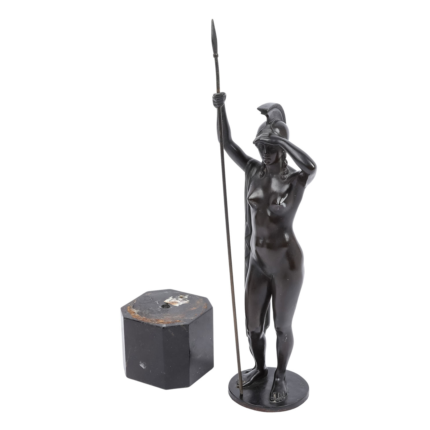 Bronze dunkel patiniert, stehender Frauenakt mit Helm der Minerva, einen Speer haltend, bezeichnet 'Bodin', Sockel lose anbei, H. ohne Sockel ca. 37 cm. Berieben, Speer lose, Alters- und Gebrauchsspuren.