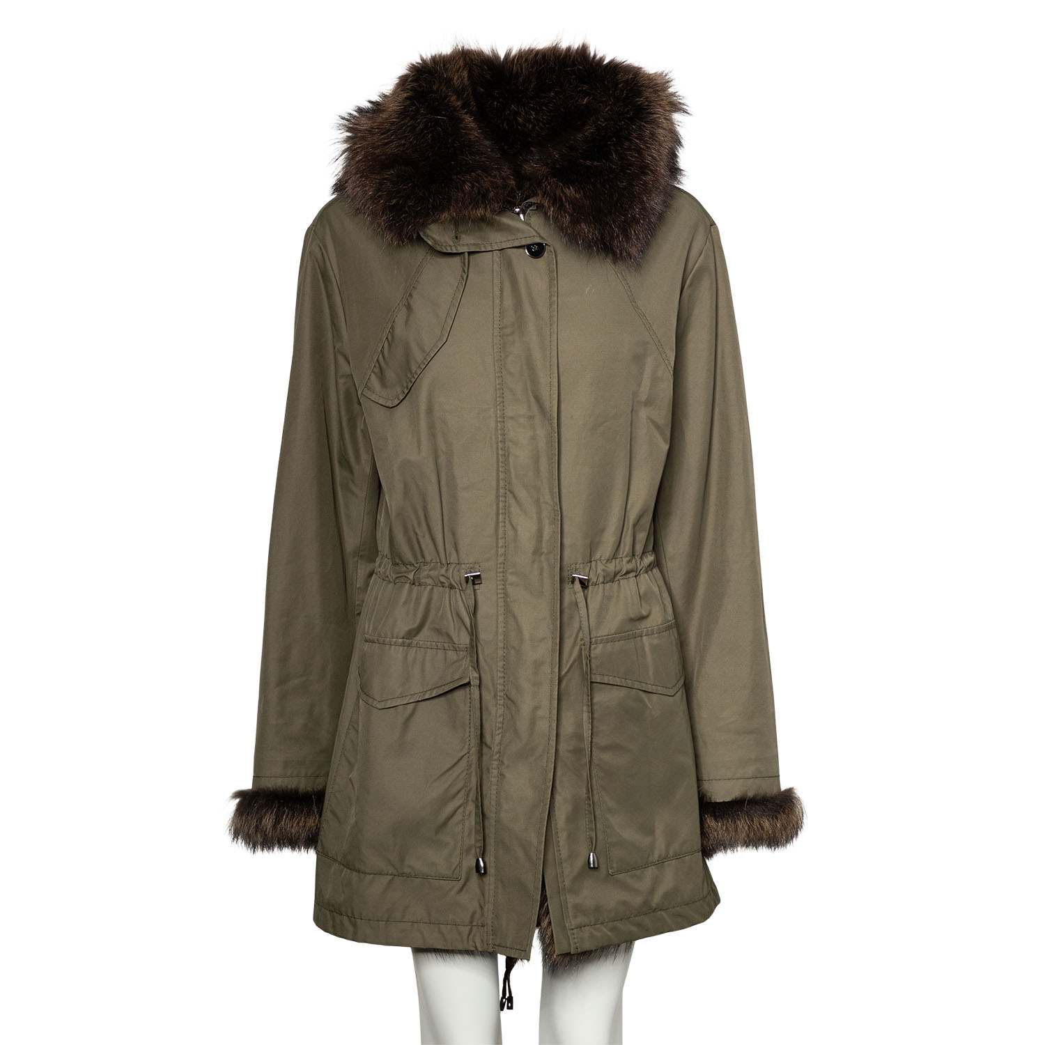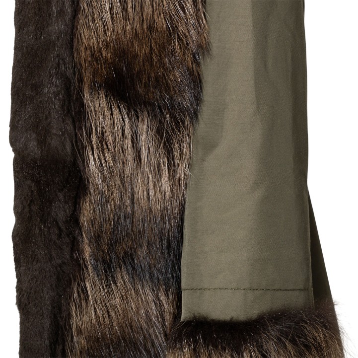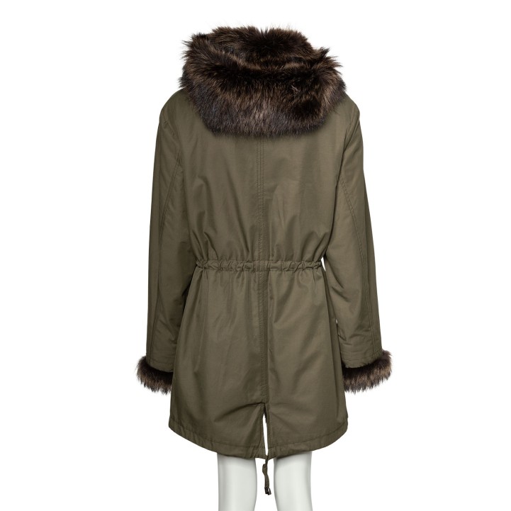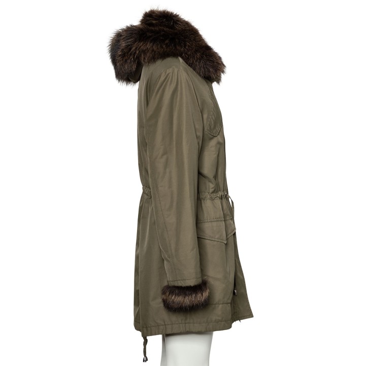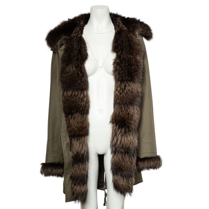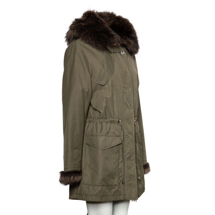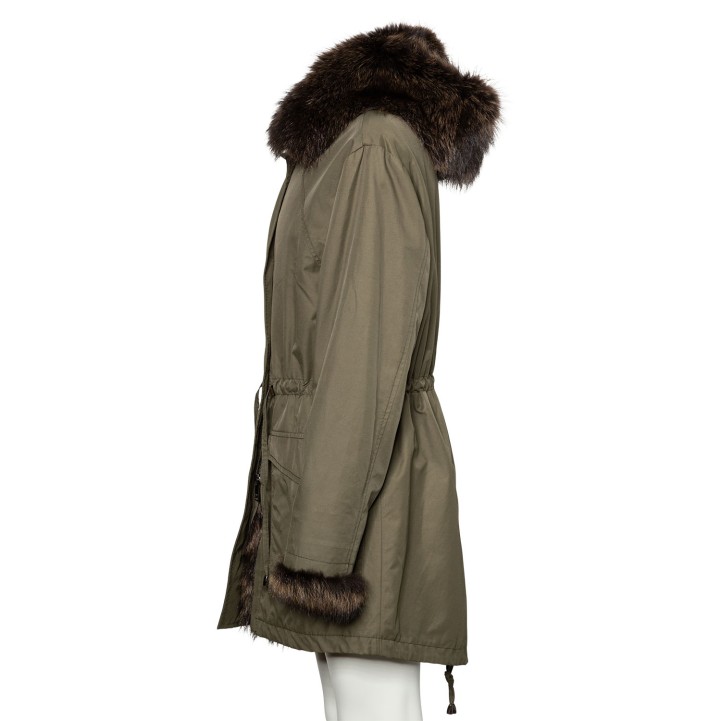 Innenpelzmantel mit Kapuze mit Pelzbesatz. Außenmaterial in Dunkelgrün aus Baumwolle. Dekorative Details. Guter Erhalt.