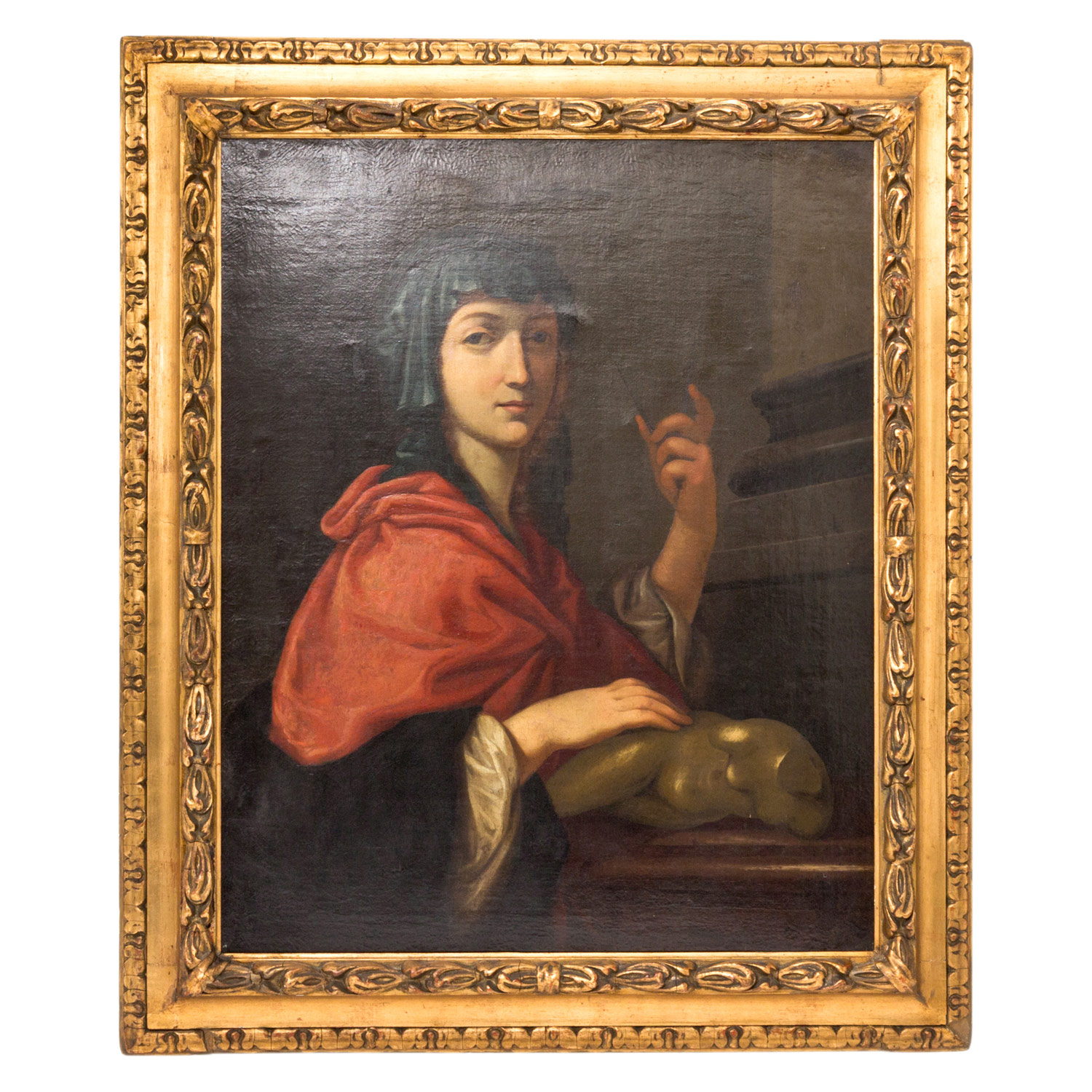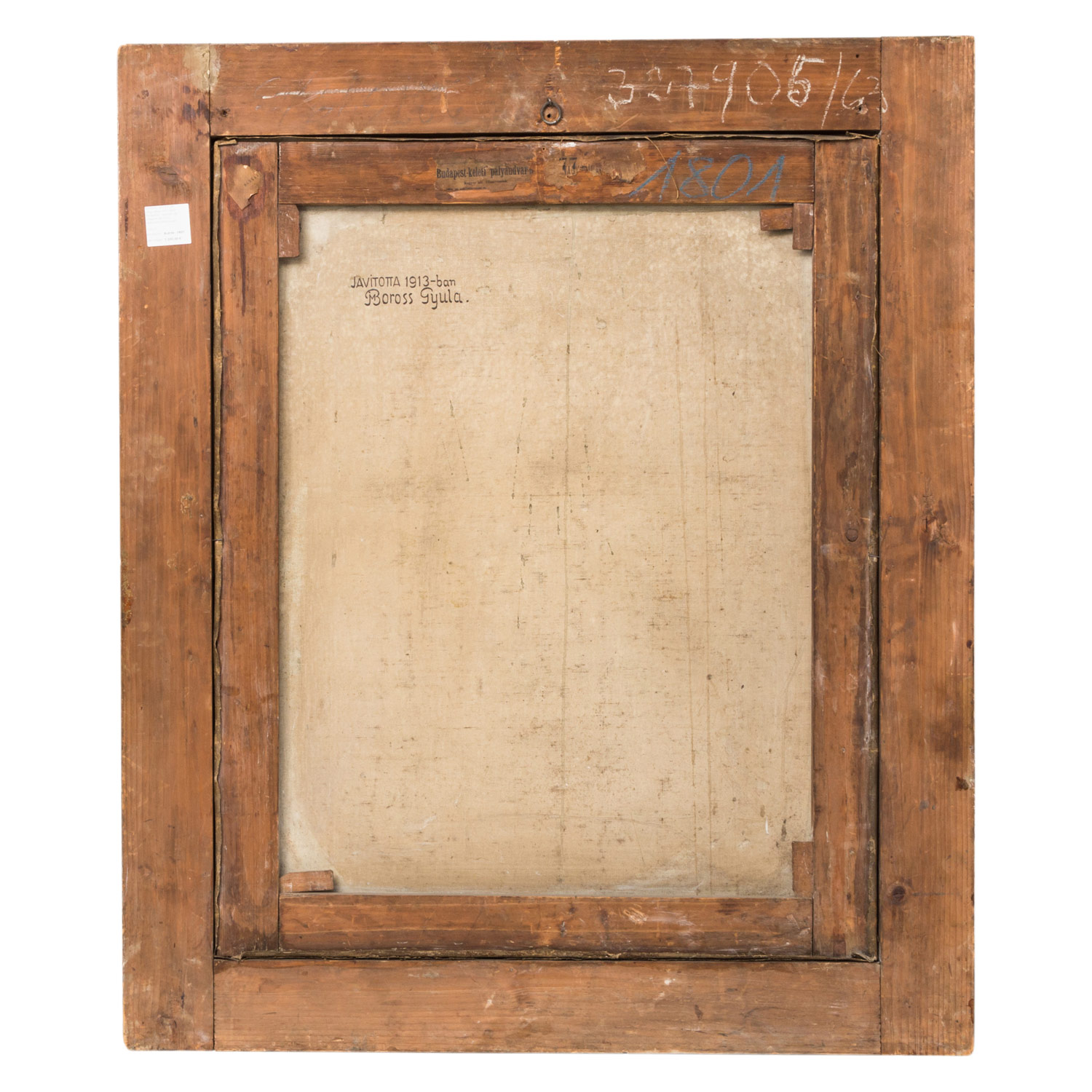 BOROSS, GYULA, attr. (Nagyvárad 1857-1930 Budapest), "Javitotta" als Allegorie der Kunst, Halbbildnis einer jungen Dame mit blauem Tuch und rotem Umhang, in ihrer linken Hand einen Zirkel haltend, vor sich einen Marmortorso, rechtsseitig eine Säule als Attribute, unsign., Öl auf Leinwand doubl., ca. 83x67 cm (101x86 cm mit Rahmen). Craquelé, rest. u. retuschiert. Auf der Leinwandrückseite betitelt, dat. 1913 u. Künstlerbez., am Keilrahmen Reste ungar. Transport- u. Ausstellungsetiketten u. handschriftl. Kreidenrr.. Mit Rahmen (Kanten besch.). Altersspuren.