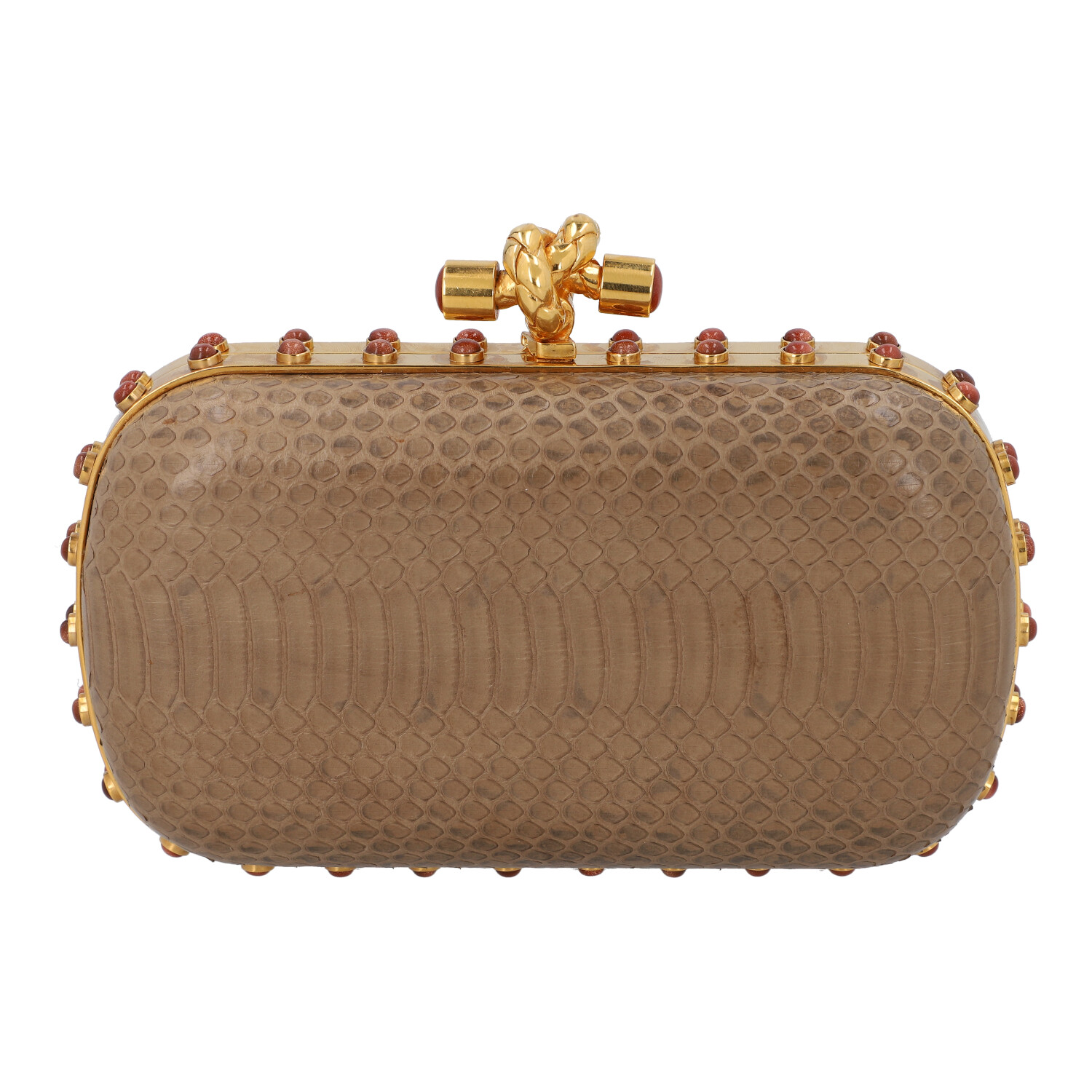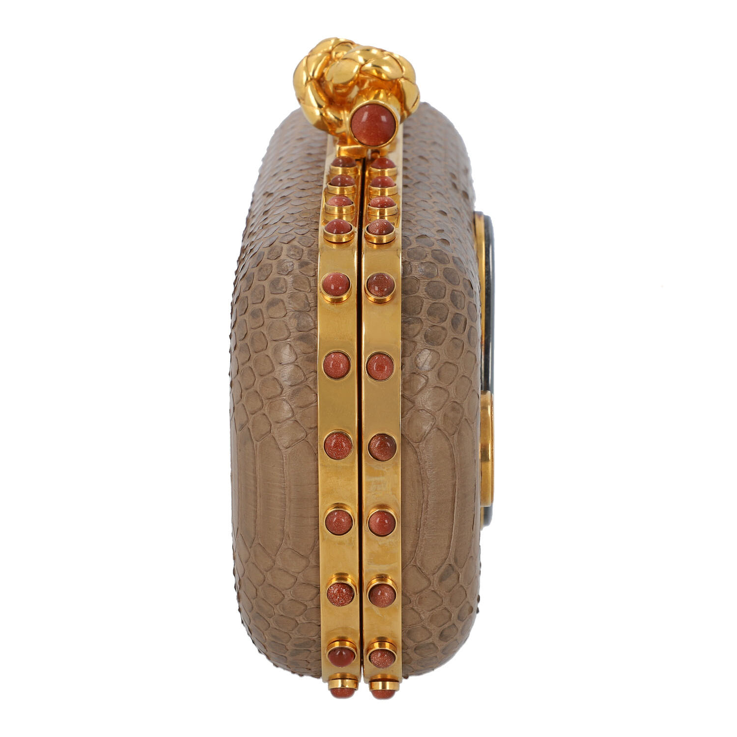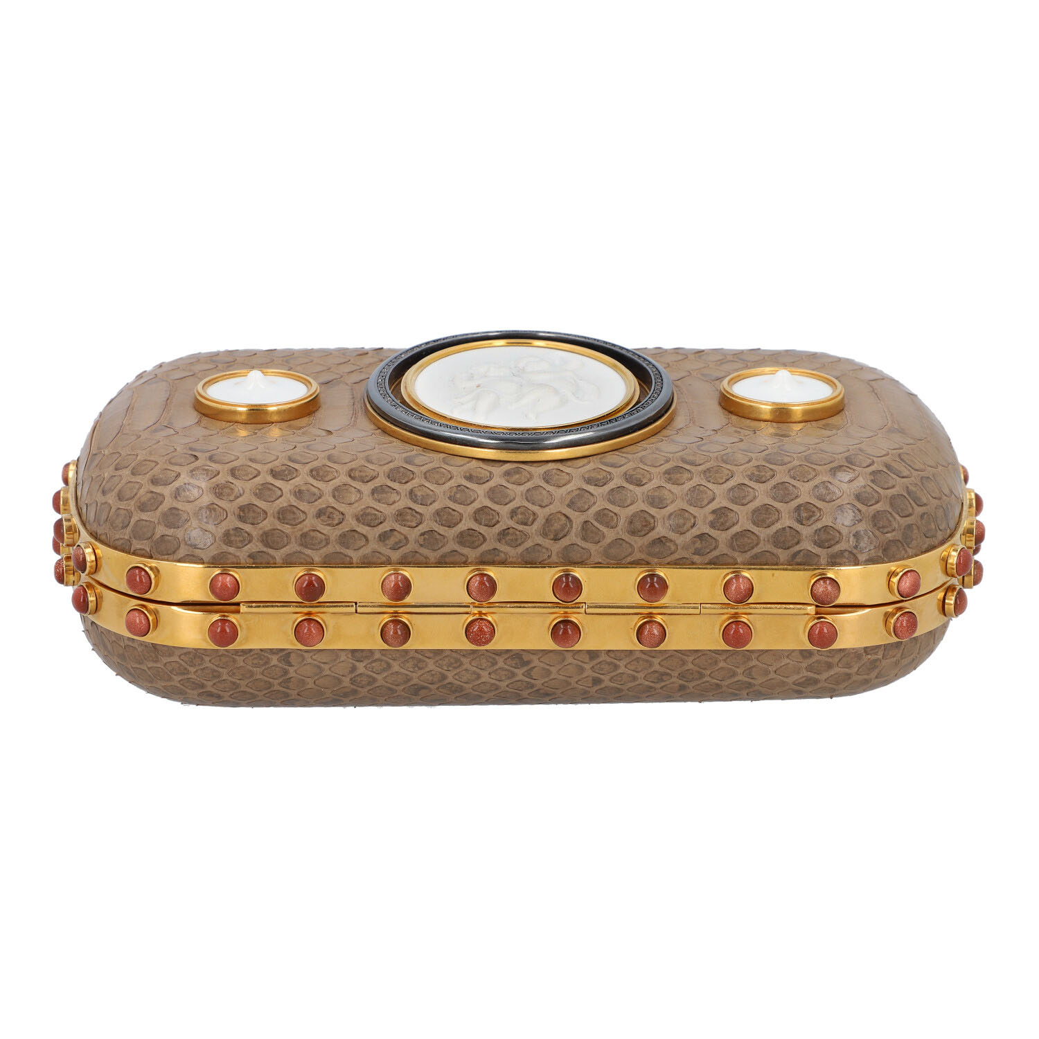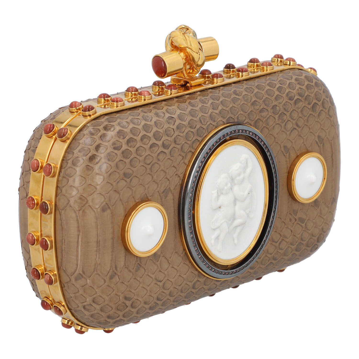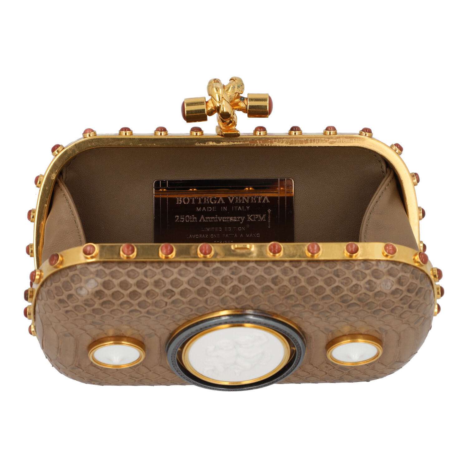 Limitierte Edition - 250 Jahre KPM und 5 Jahre Zusammenarbeit mit Bottega Veneta. Limitiertung 004 / 250. Klassisches Modell aus Wasserschlange und goldfarbener Hardware, verziert mit feinstem Biskuitporzellan und dekorativen Zirkonia-Steinchen. Umrandet mit backsteinfarbenen Glassteinen welche mit Goldstaub veredelt wurden. Sehr guter Erhalt.