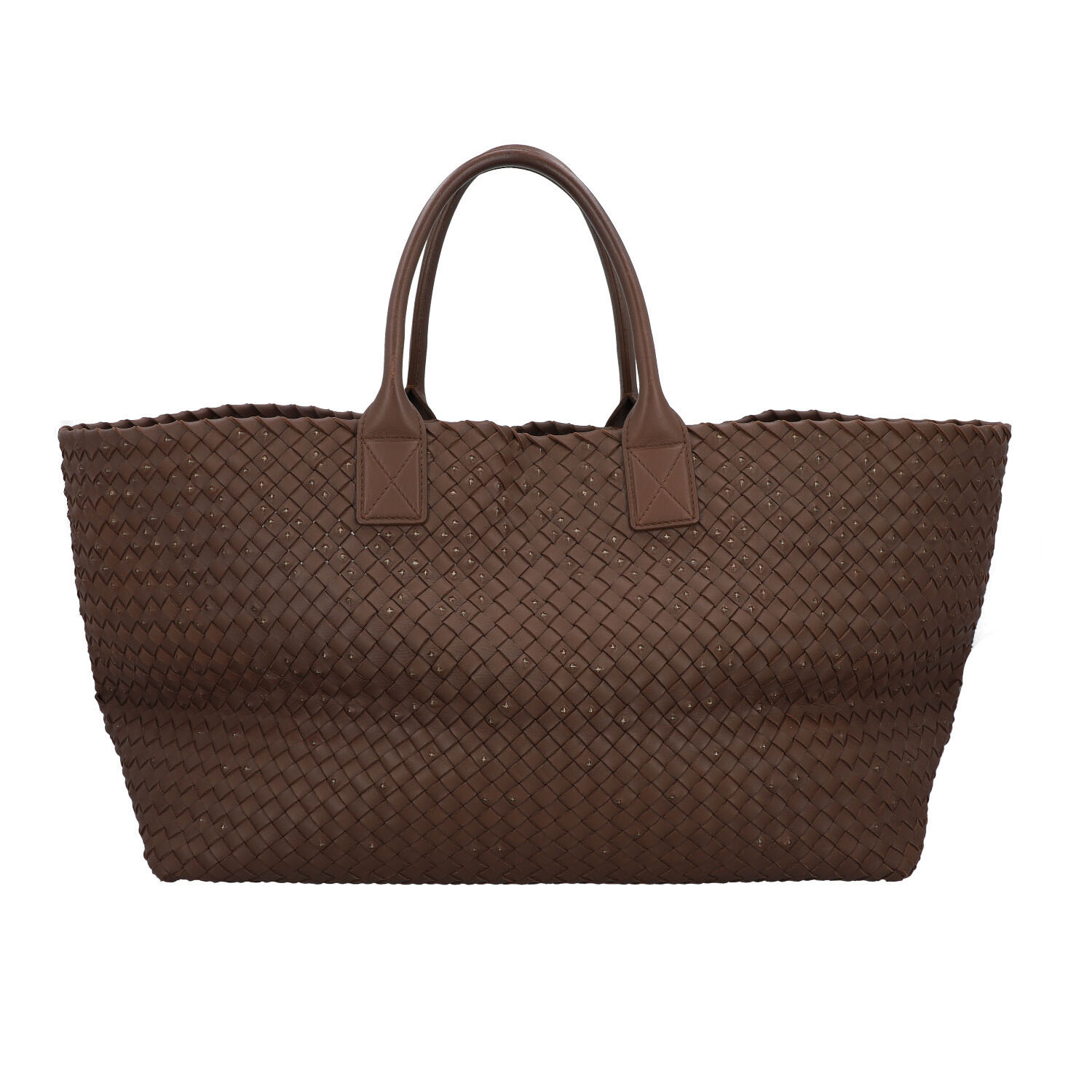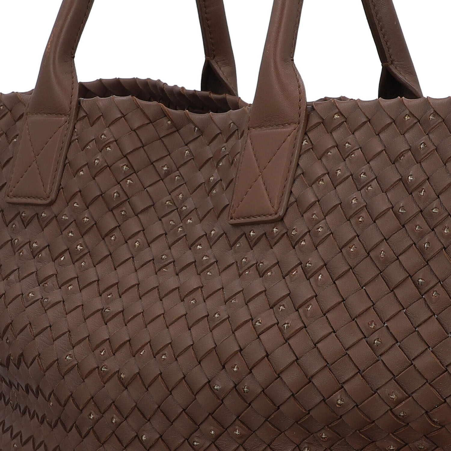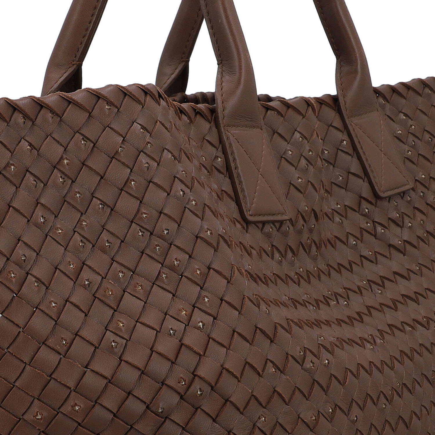 NP. ca.: 9.800,-€. Limitierte Edition 0.312 / 1.000. Intreccio Leder in Dunkelbraun mit silberfarbenem Nietendekor. Innenraum mit abnehmbarer Pochette. Staubbeutel anbei. Leichte Gebrauchsspuren und Abrieb vorhanden. 45 x 21 x 31 cm.