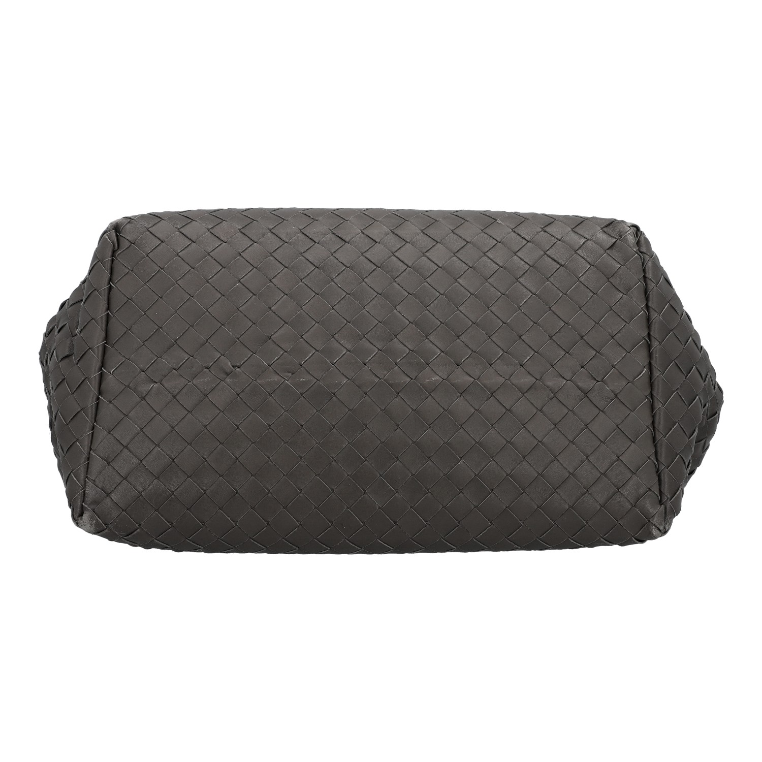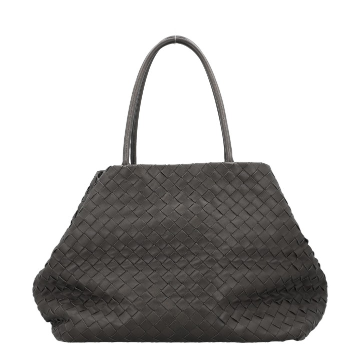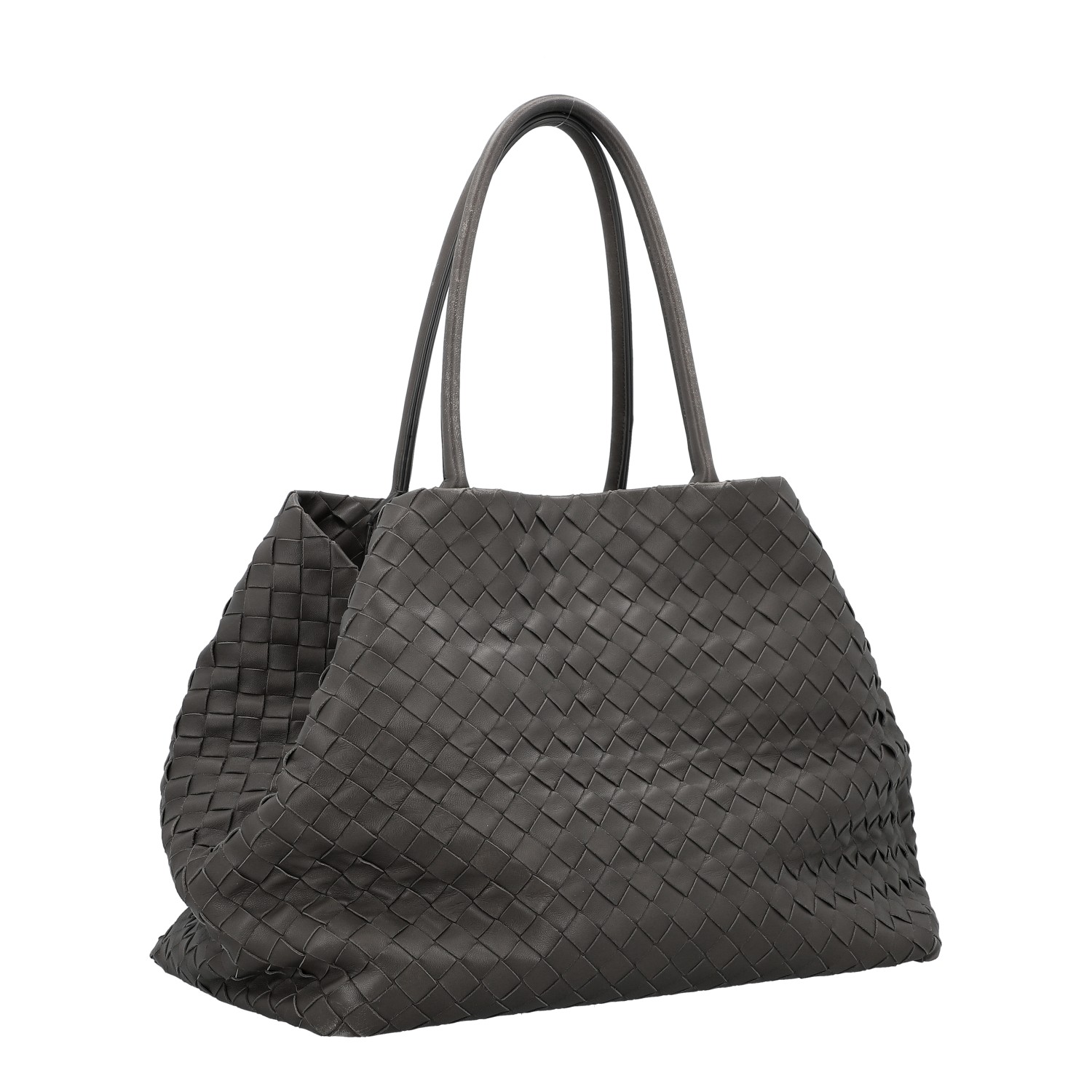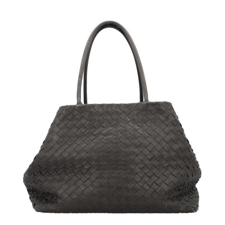Klassischer Shopper aus Intrecciato-Leder in Dunkelgrau. Innenfutter aus Leder mit zwei kleinen Innenfächern. Doppelhenkel. Staubbeutel anbei. Abrieb an den Kanten und Henkeln. Rechnung und Staubbeutel anbei. 40x23x30cm.