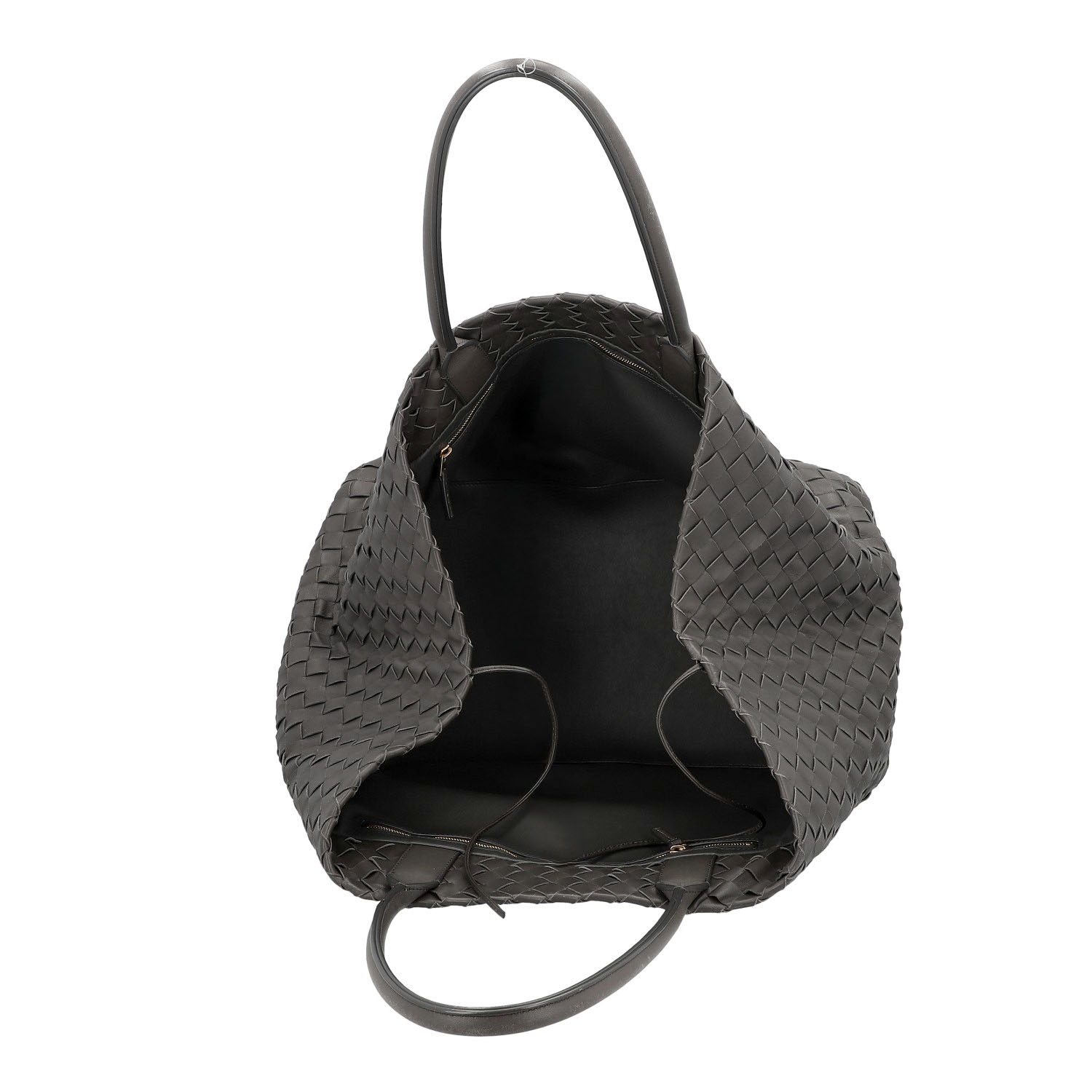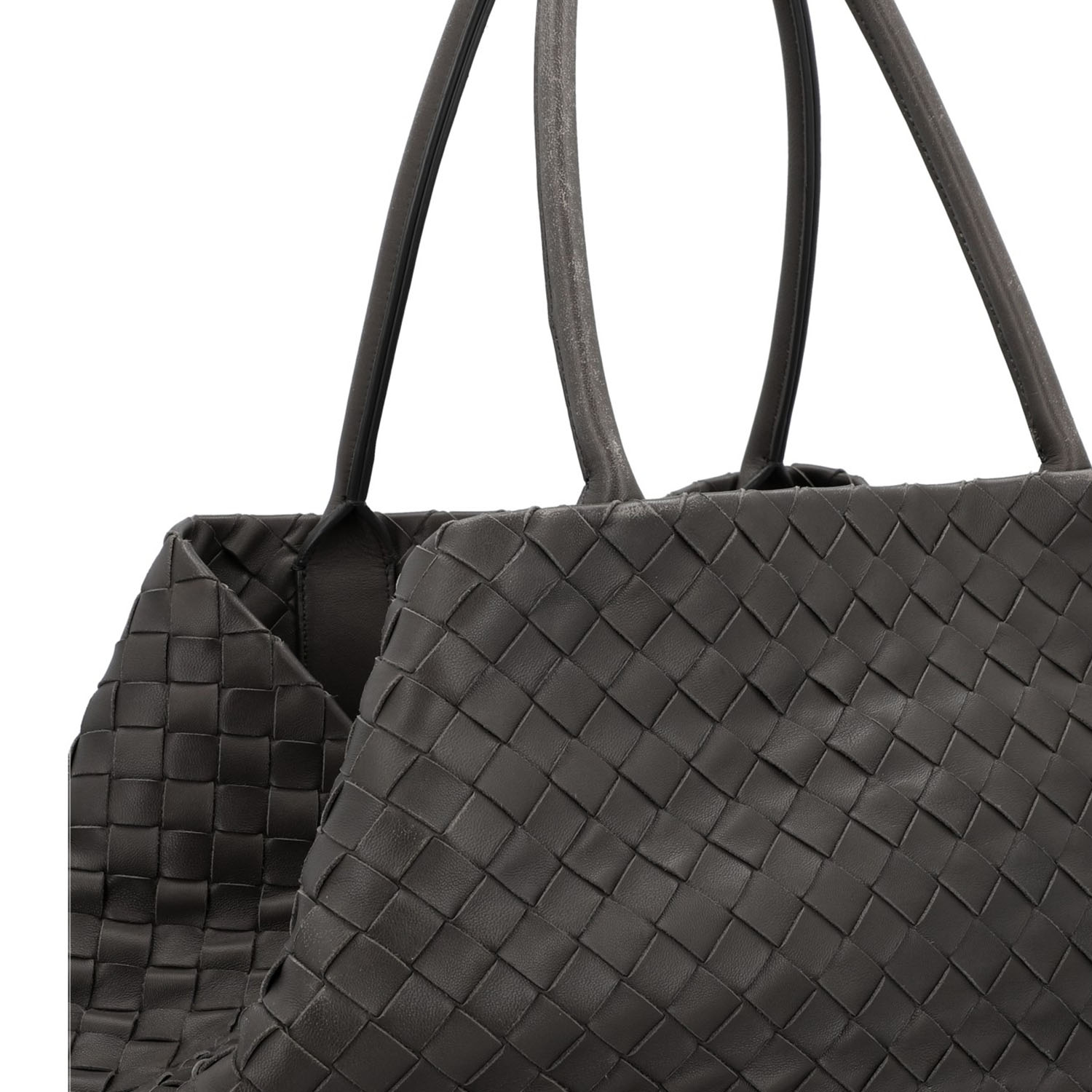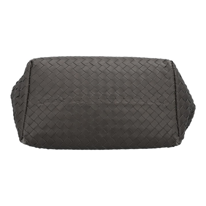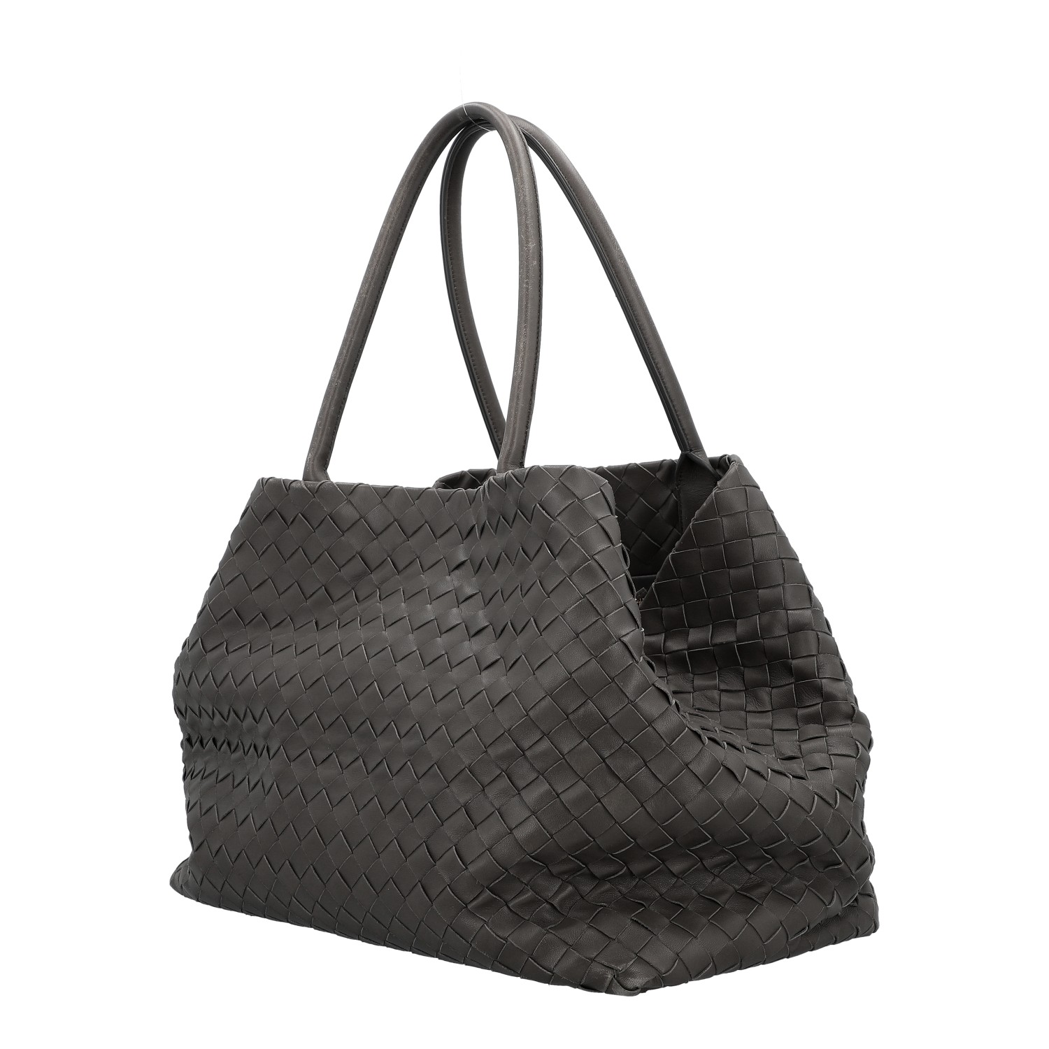 Klassischer Shopper aus Intrecciato-Leder in Dunkelgrau. Innenfutter aus Leder mit zwei kleinen Innenfächern. Doppelhenkel. Staubbeutel anbei. Abrieb an den Kanten und Henkeln. Rechnung und Staubbeutel anbei. 40x23x30cm.