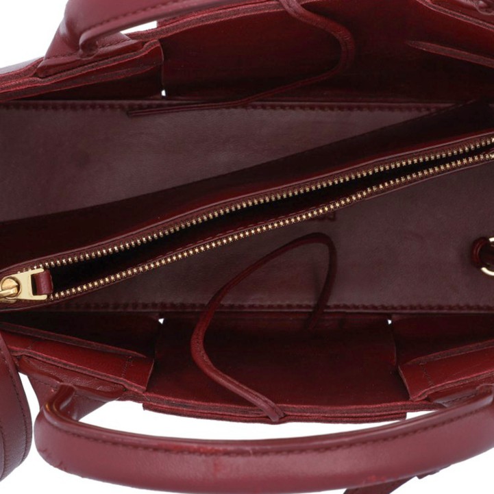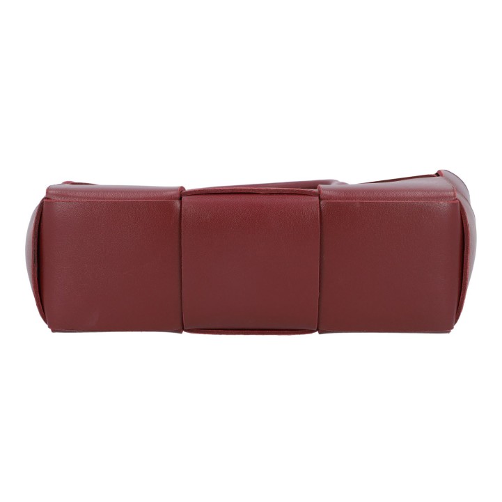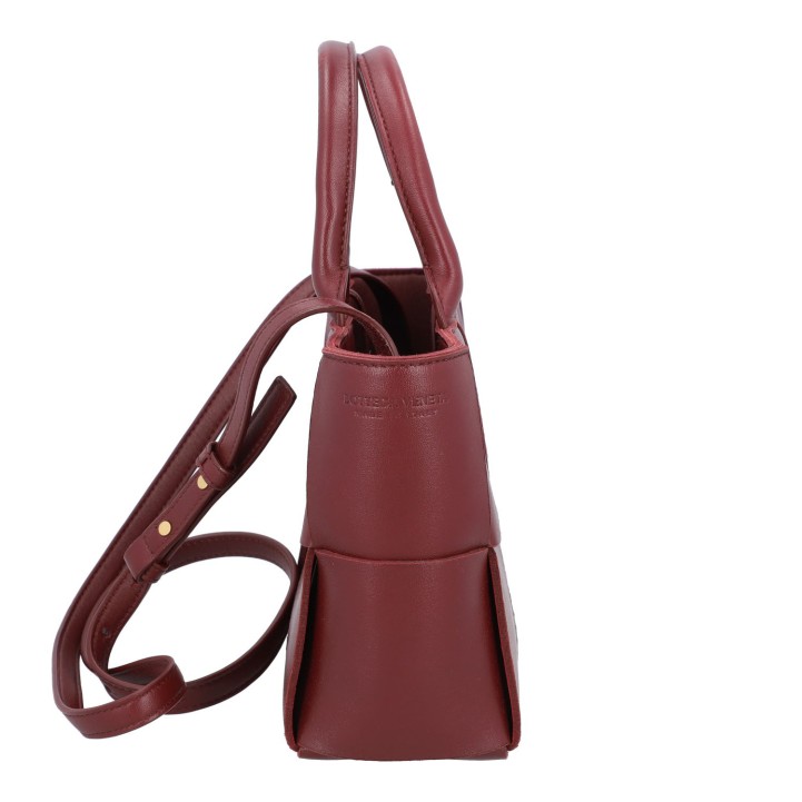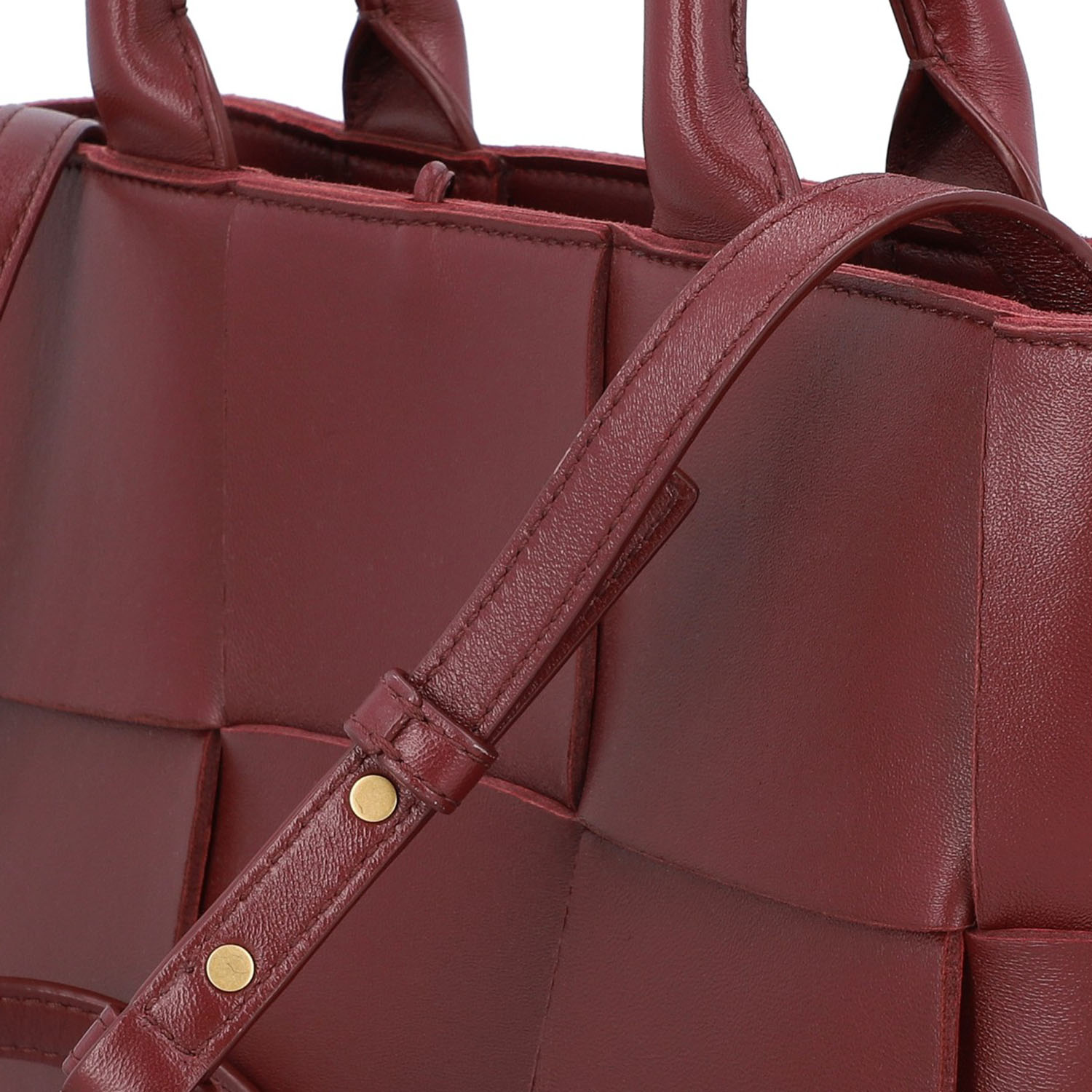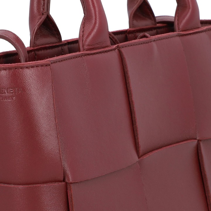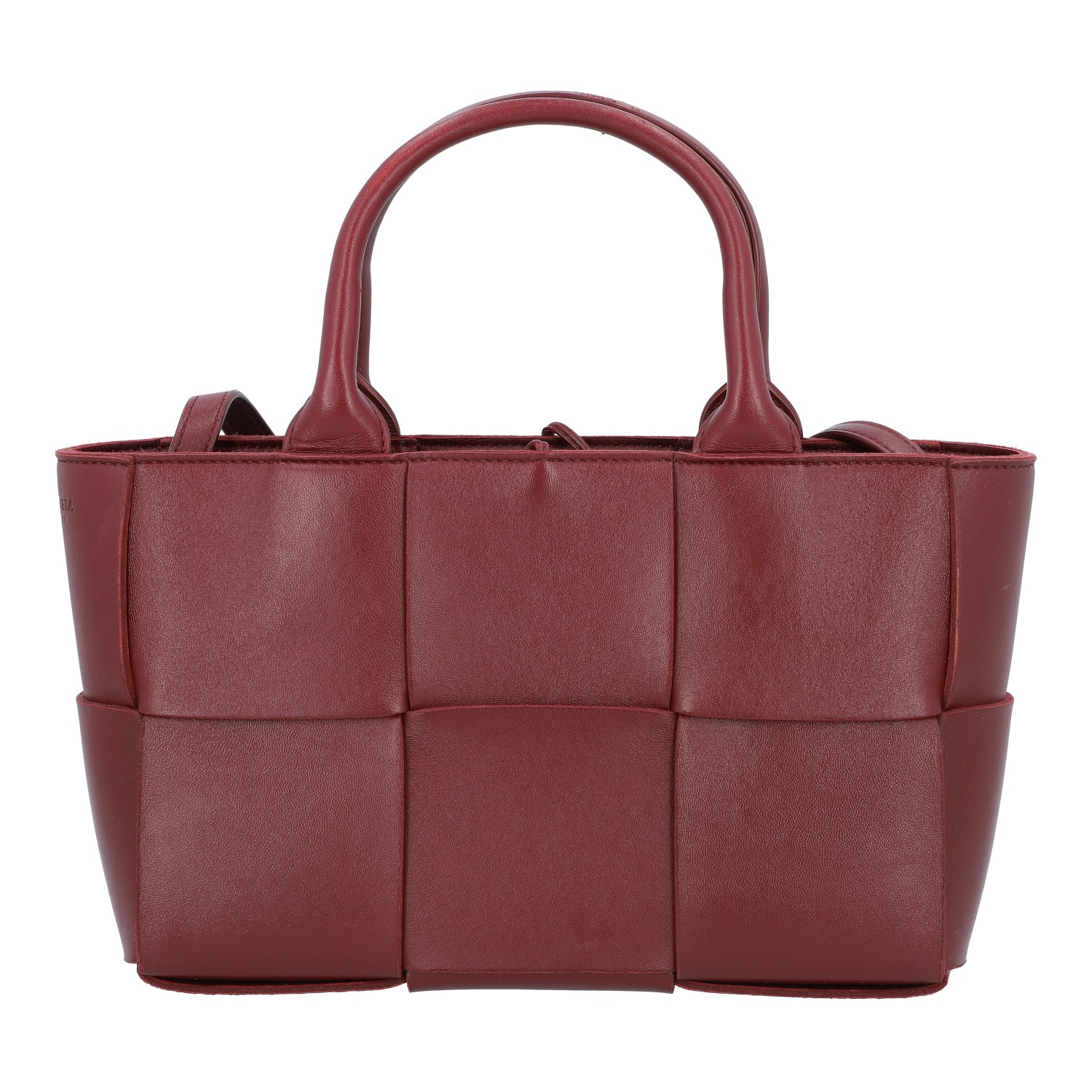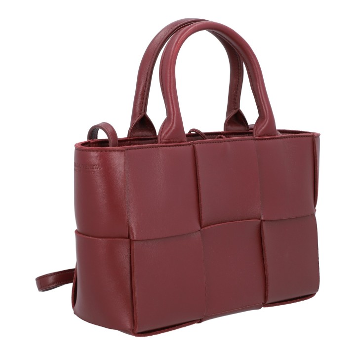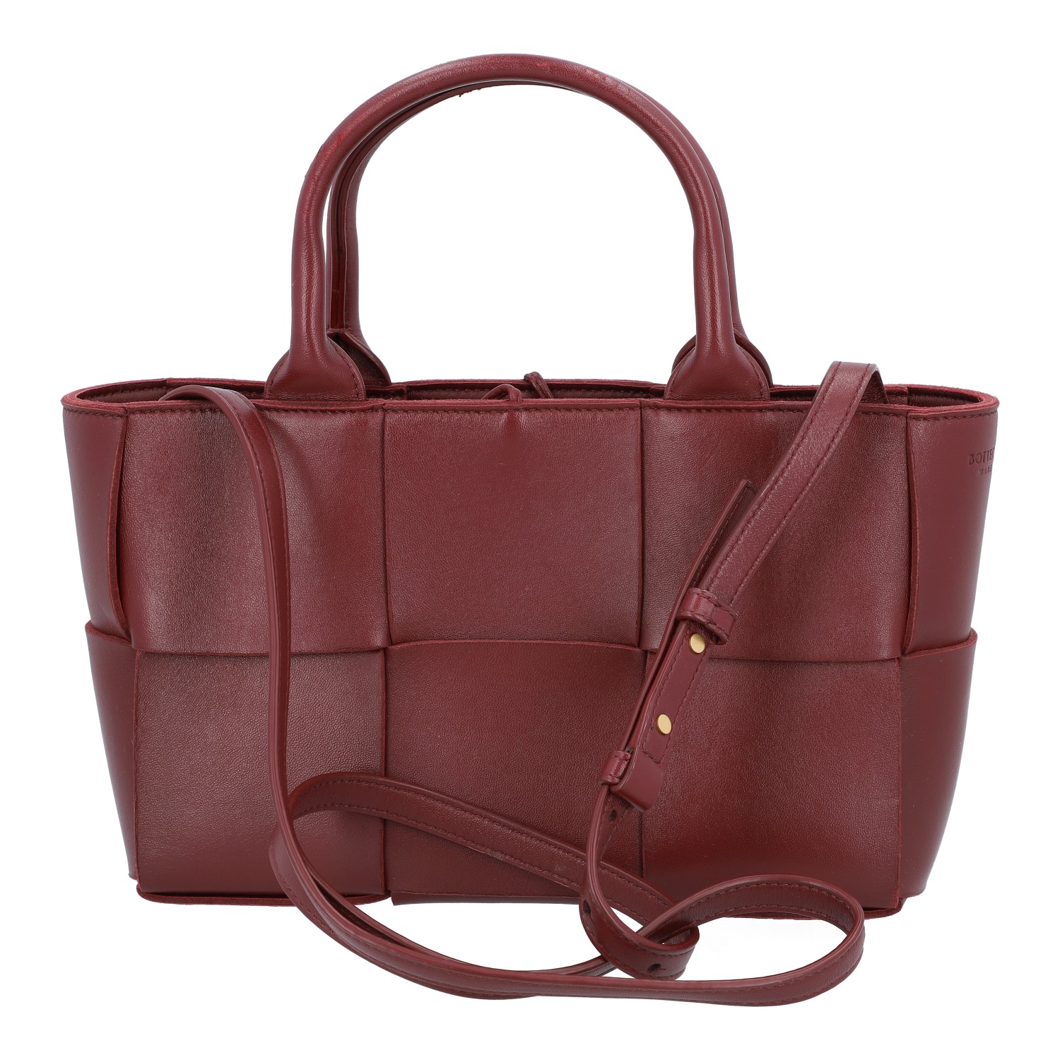 Intrecciato-Leder in Bordeaux mit goldfarbener Hardware, Doppelhenkeln und Schulterriemen. Innenraum mit herausnehmbarer Pochette. Staubbeutel anbei. Dezente Gebrauchsspuren. 25 x 8 x 16 cm.