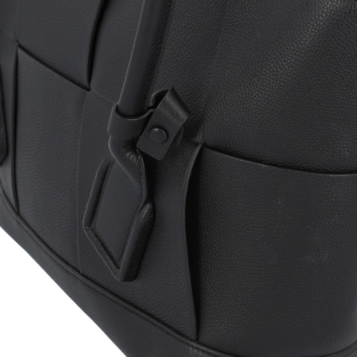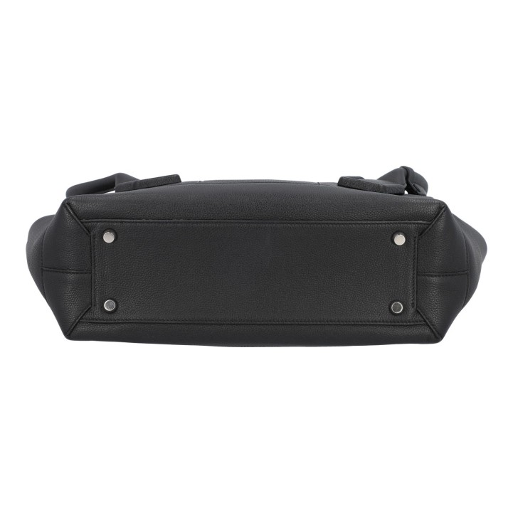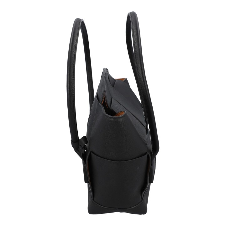 Intreccio-Leder in Schwarz mit dekorativen Doppelhenkeln und Überschlag. Innenraum aus cognacfarbenem Wildleder mit drei Fächern, eines davon mit Reißverschluss. Gebrauchsspuren vorhanden. 32 x 11 x 24 cm.
