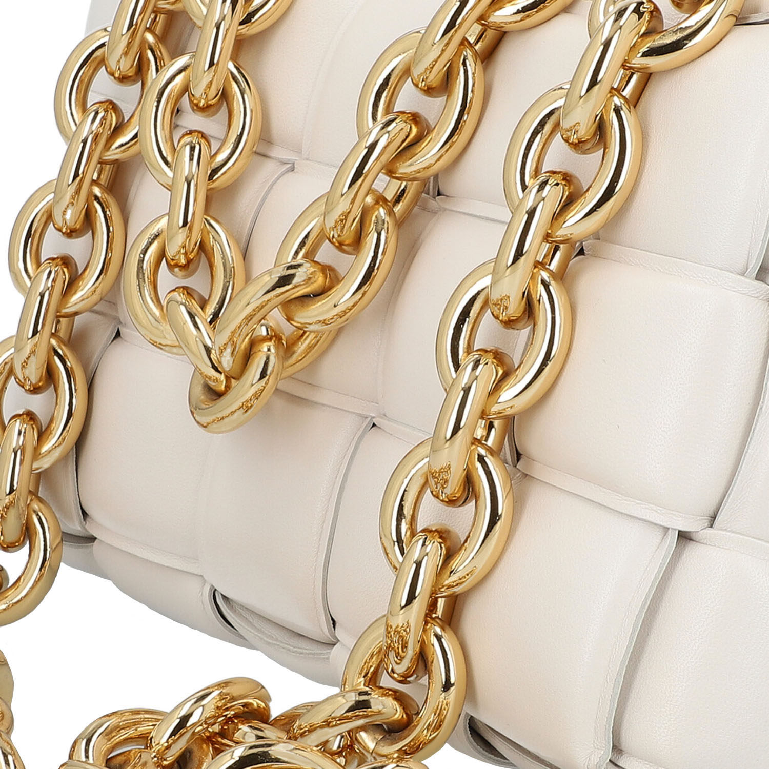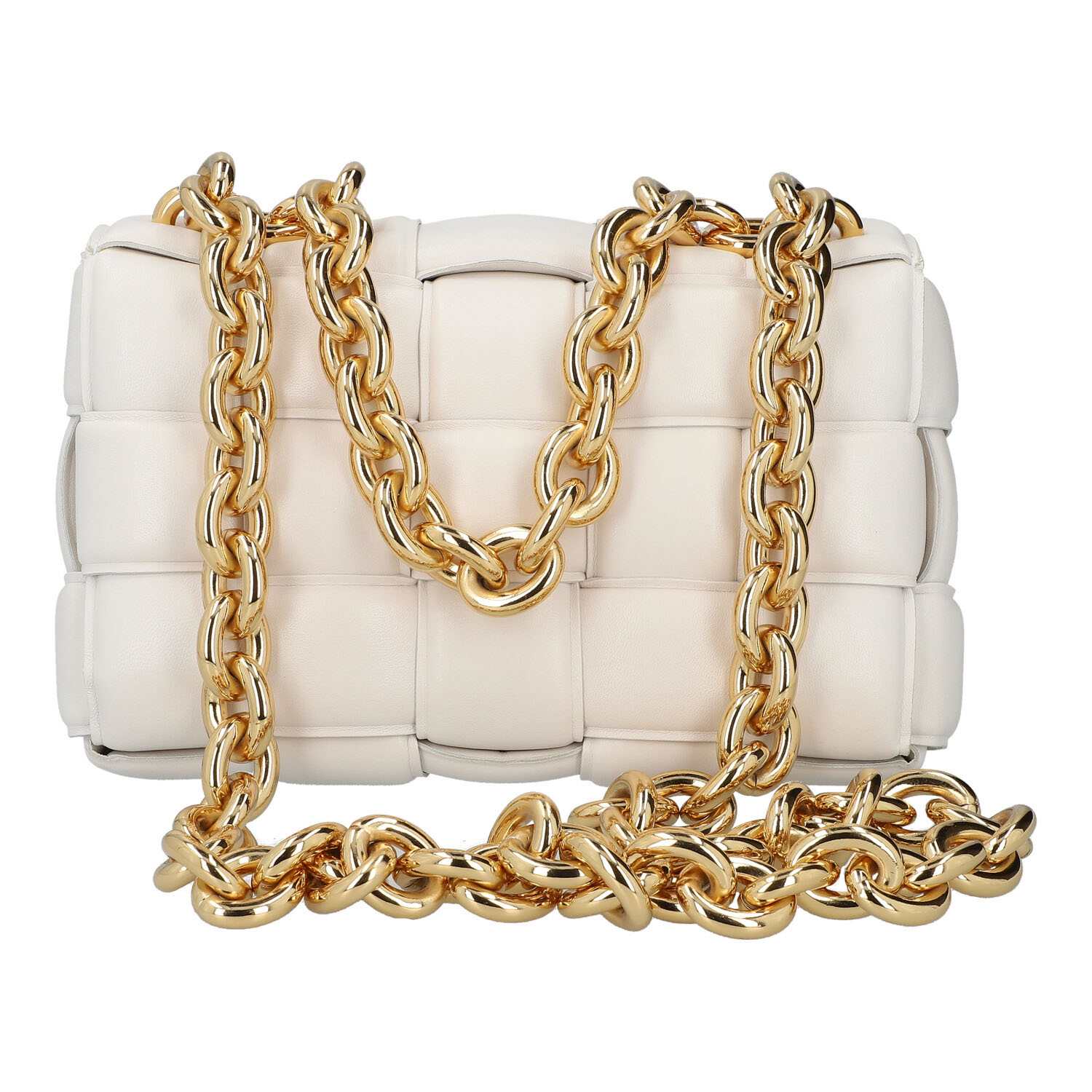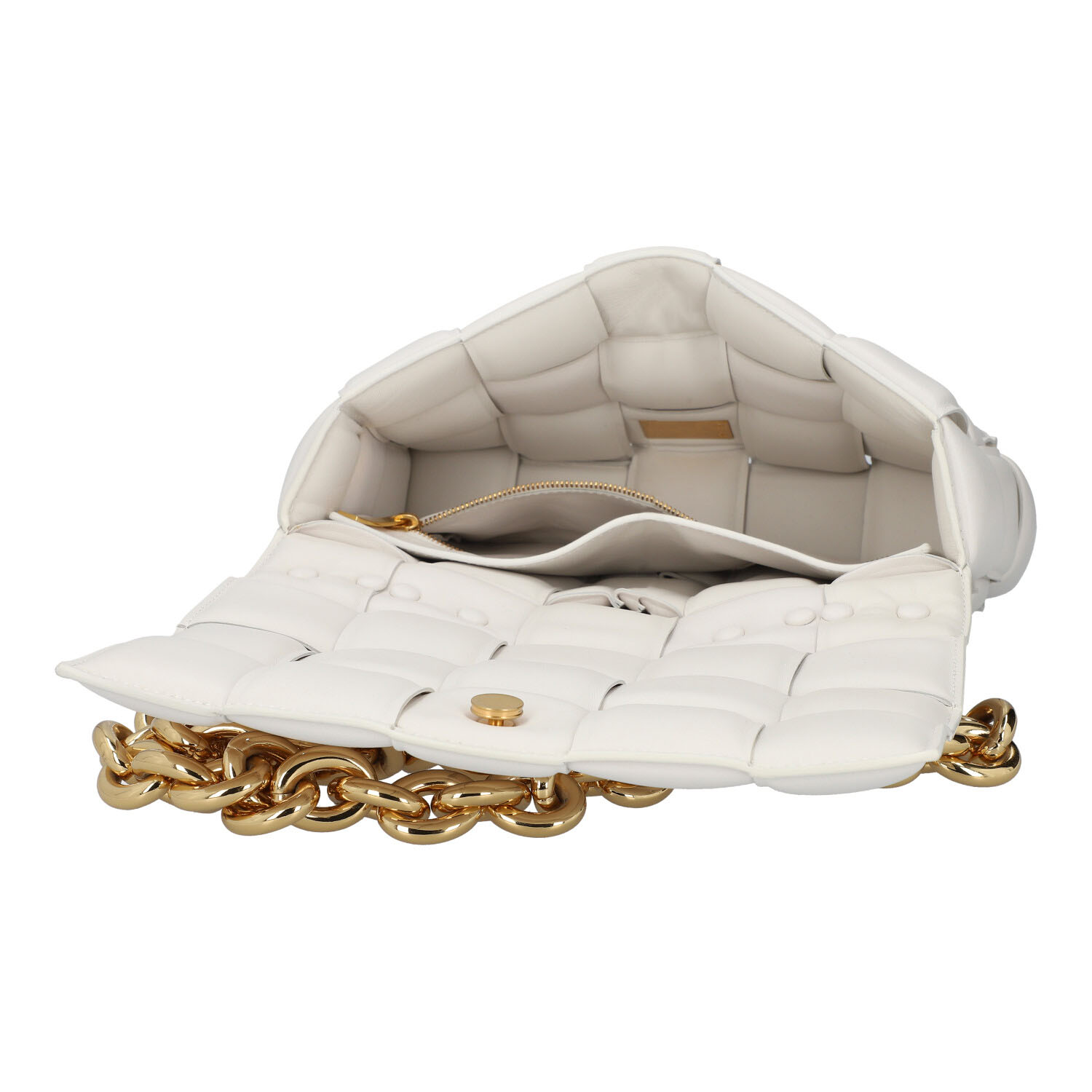 Gebondetes Intreccio Lammleder im Farbton Chalk mit goldfarener Hardware, Überschlag mit Schließe und schwerer Gliederkette. Innenraum mit einem Reißverschlussfach. Staubbeutel anbei. Guter Zustand. 18 x 26 x 8 cm.