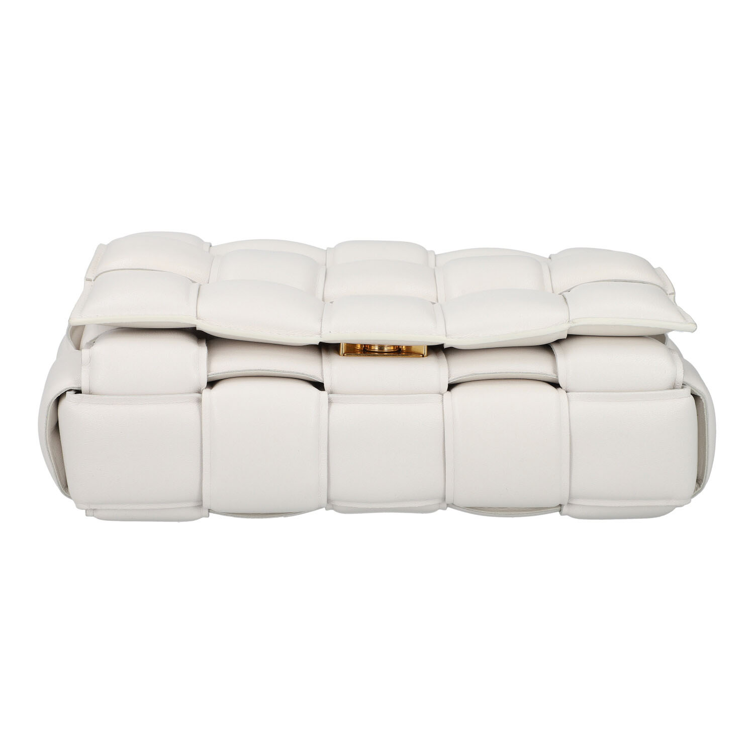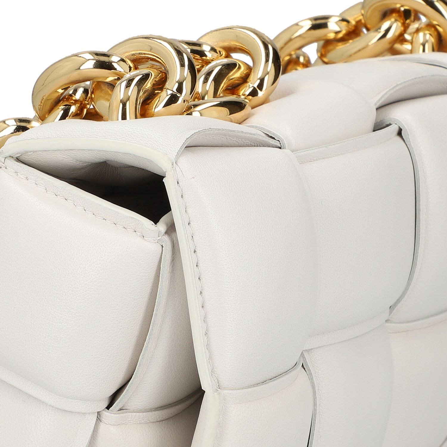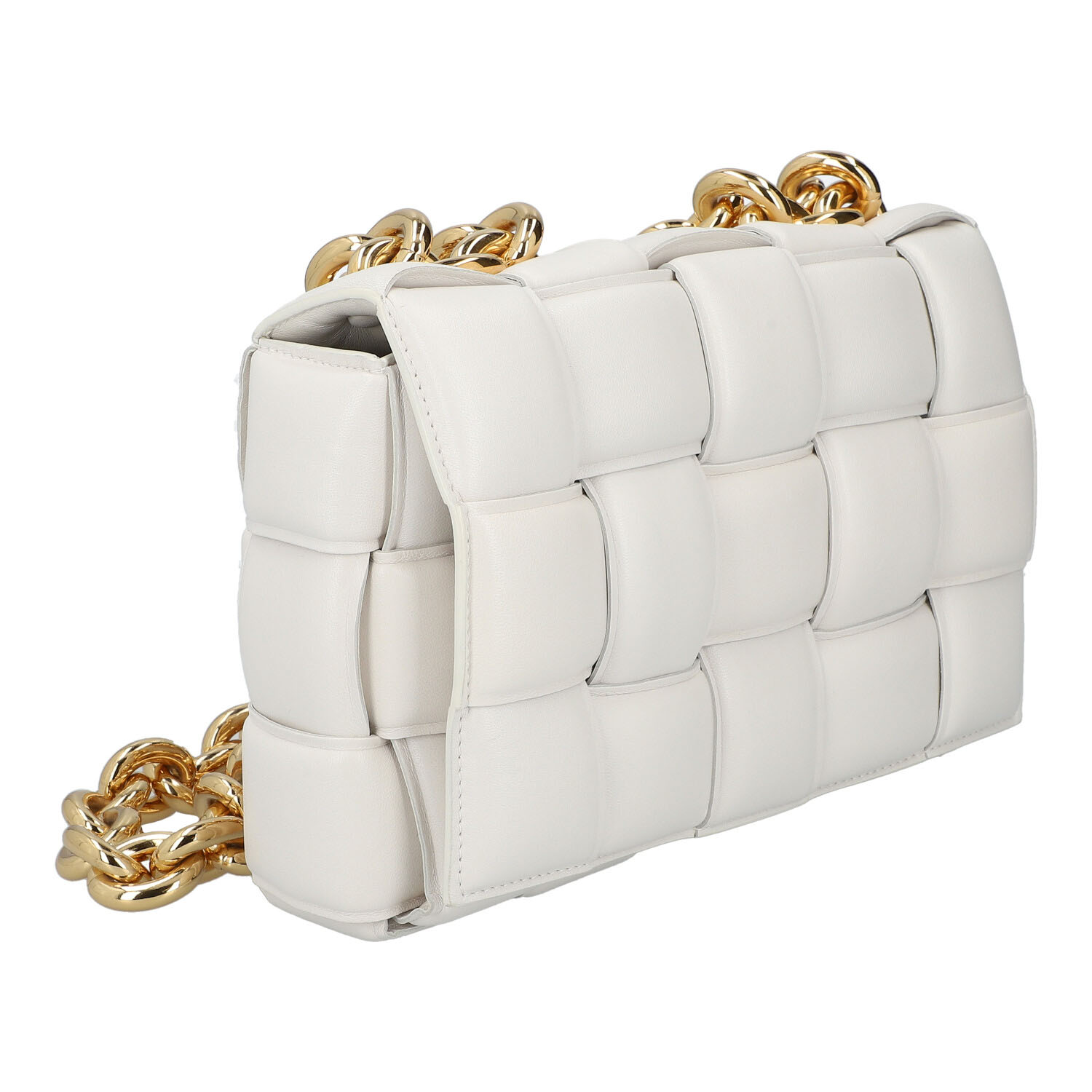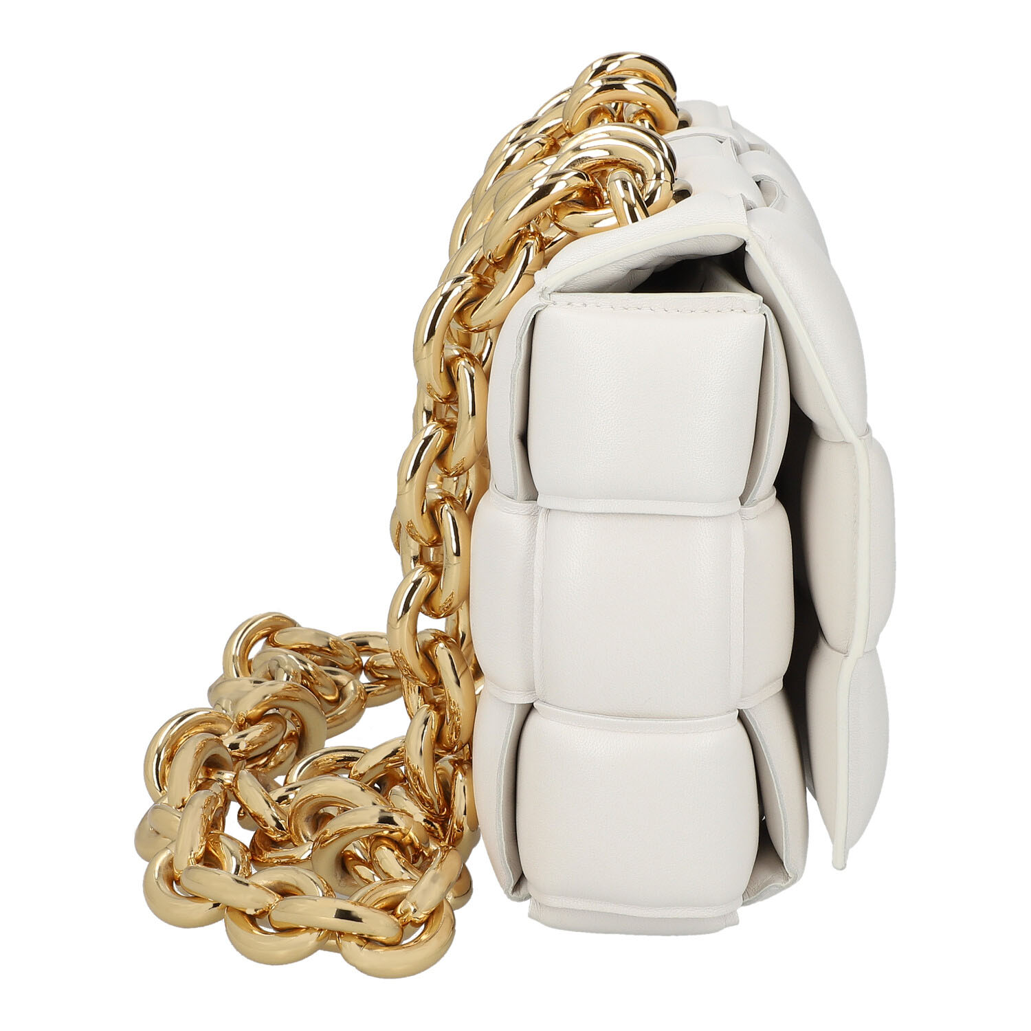Gebondetes Intreccio Lammleder im Farbton Chalk mit goldfarener Hardware, Überschlag mit Schließe und schwerer Gliederkette. Innenraum mit einem Reißverschlussfach. Staubbeutel anbei. Guter Zustand. 18 x 26 x 8 cm.