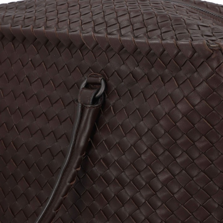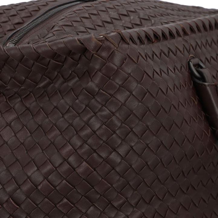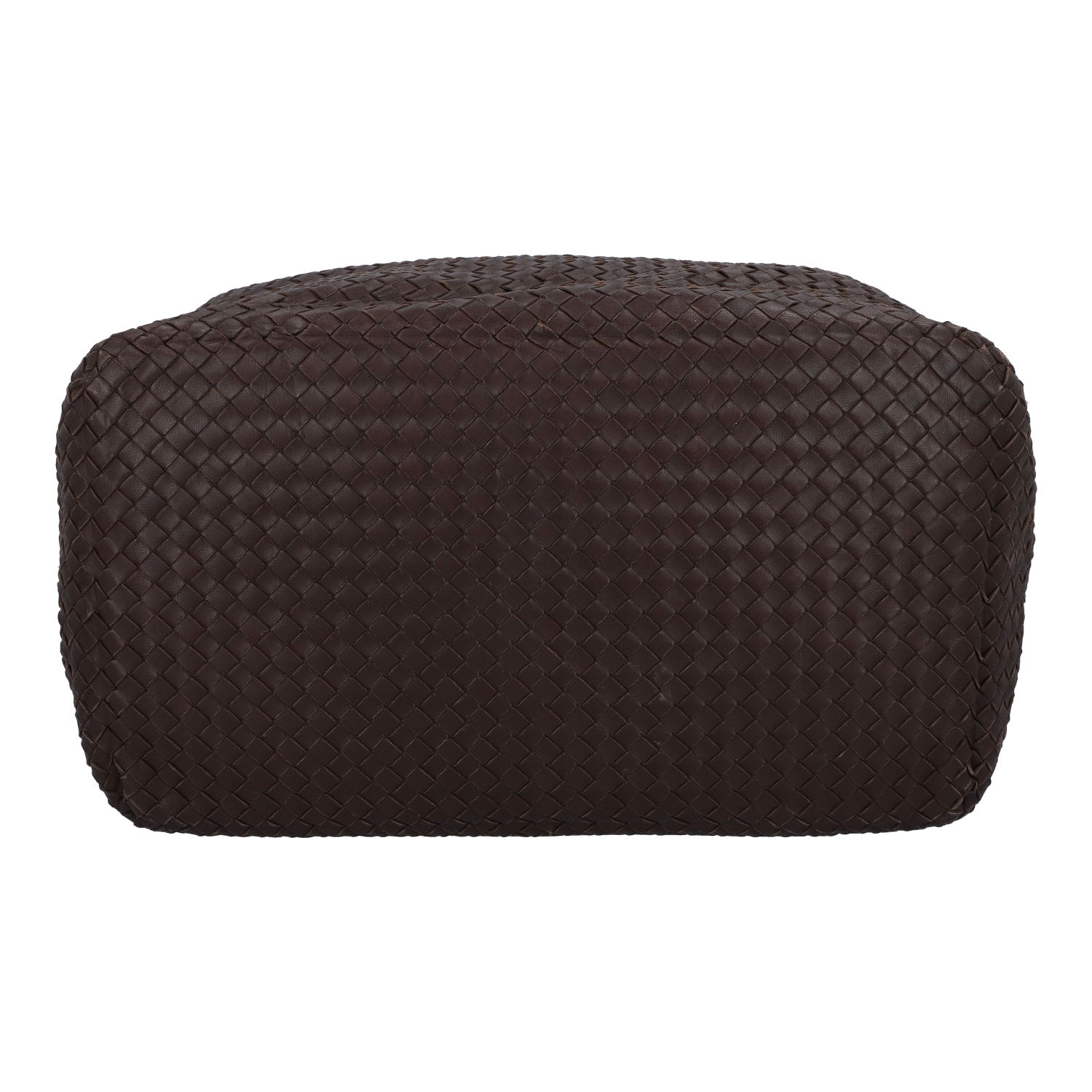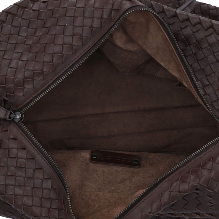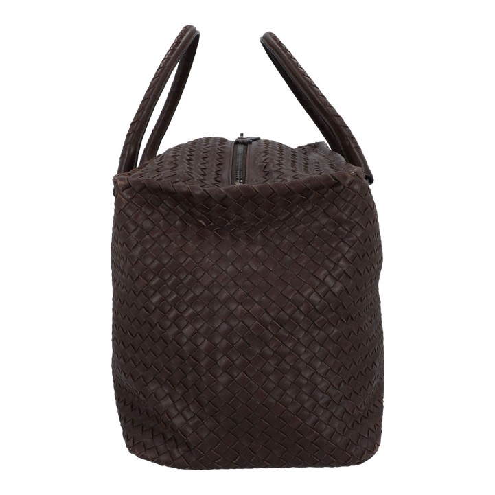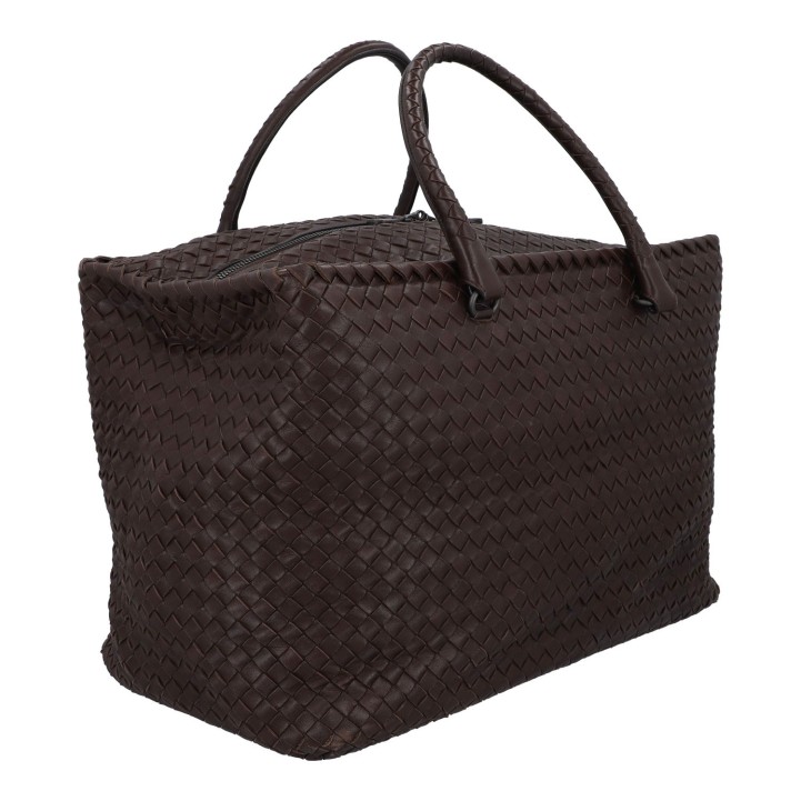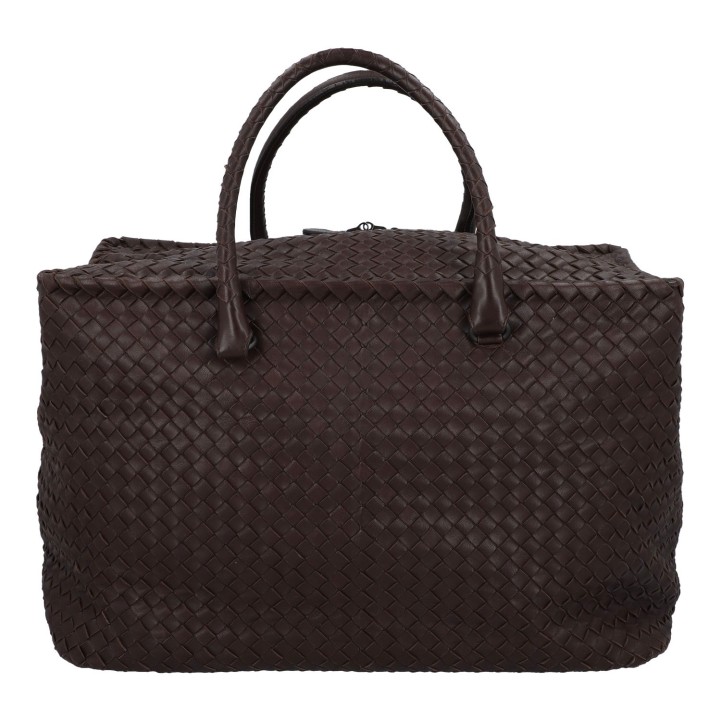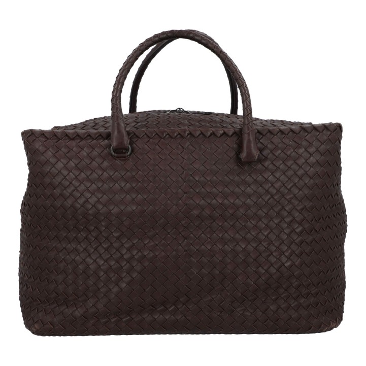 Braunes Intrecciato-Leder mit dunkelgrauer Hardware, Doppelhenkeln und Reißverschluss. Innenraum aus Veloursleder mit zwei Fächern, eines davon mit Reißverschluss. Gebrauchsspuren vorhanden, Abrieb an den Kanten. 42 x 22 x 28 cm.